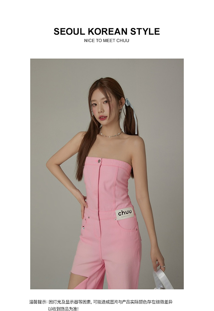 商品名称:CHUU破洞抹胸连体牛仔裤女士夏小众设计感阔腿裤 351315