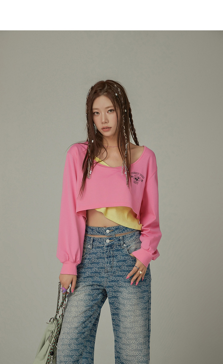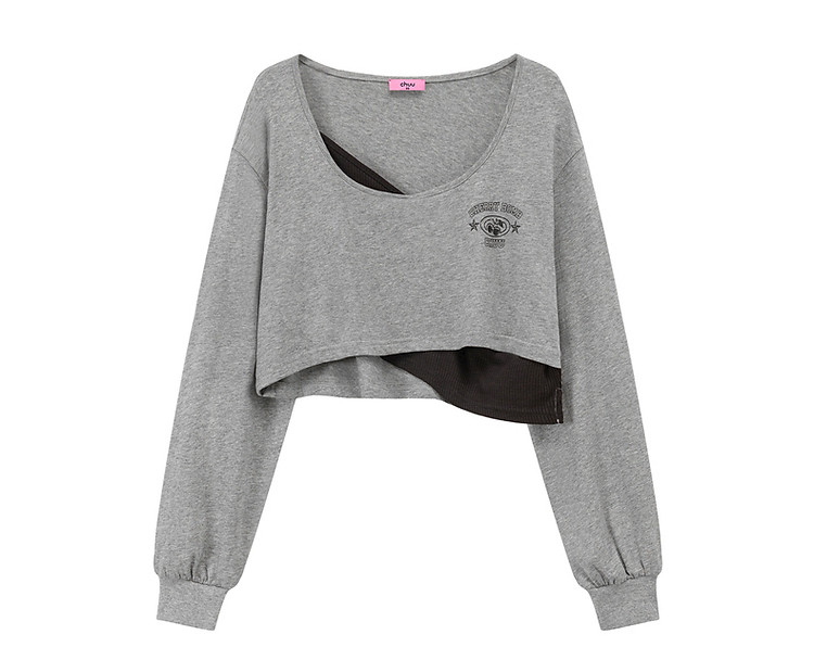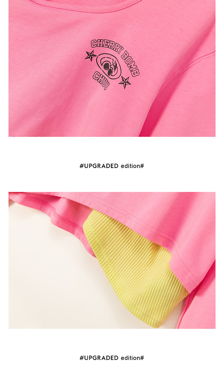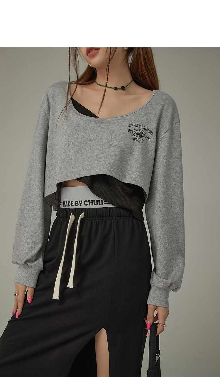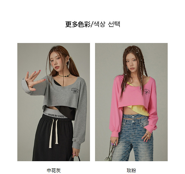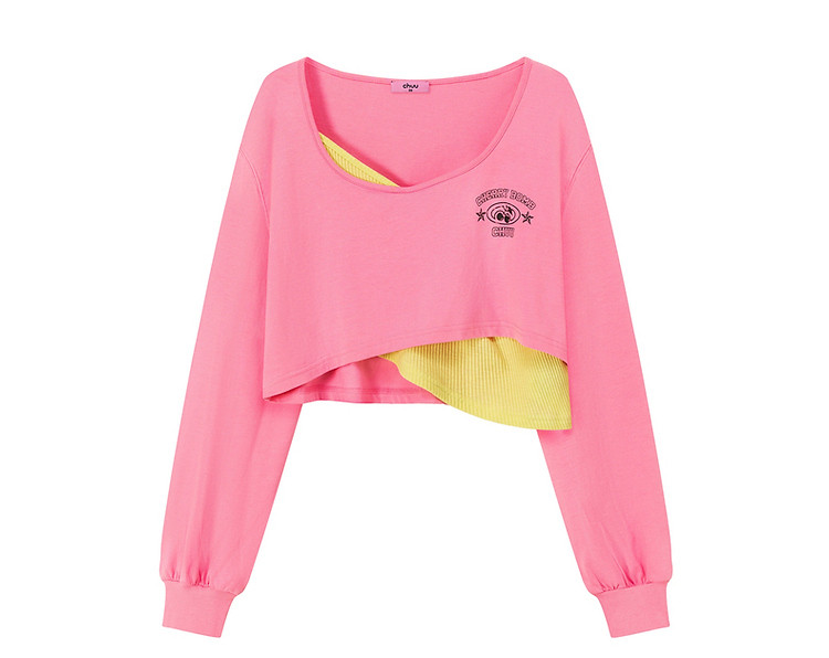 商品名称:撞色假两件T恤女春秋印花大圆领长袖短上衣 150163
