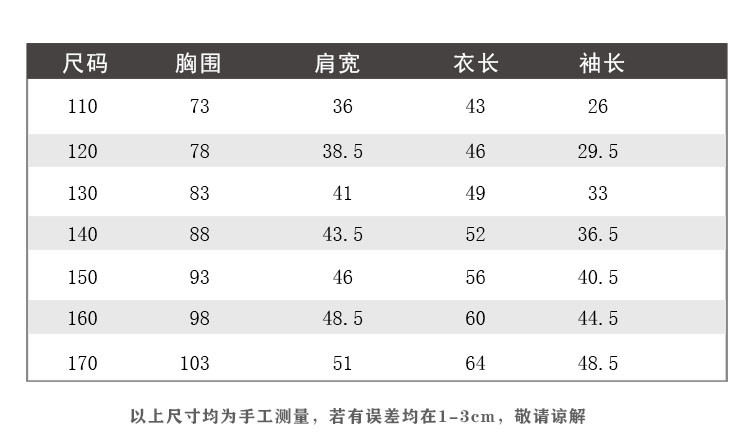 | 尺码 | 衣长(cm) | 肩宽(cm) | 袖长(cm) | 适合年龄 | 胸围(cm) | 号型 |