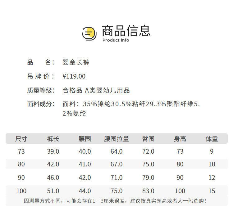 | 尺码 | 身高(cm) | 腰围(cm) | 裤长(cm) | 臀围(cm) | 适合年龄 | 号型 |