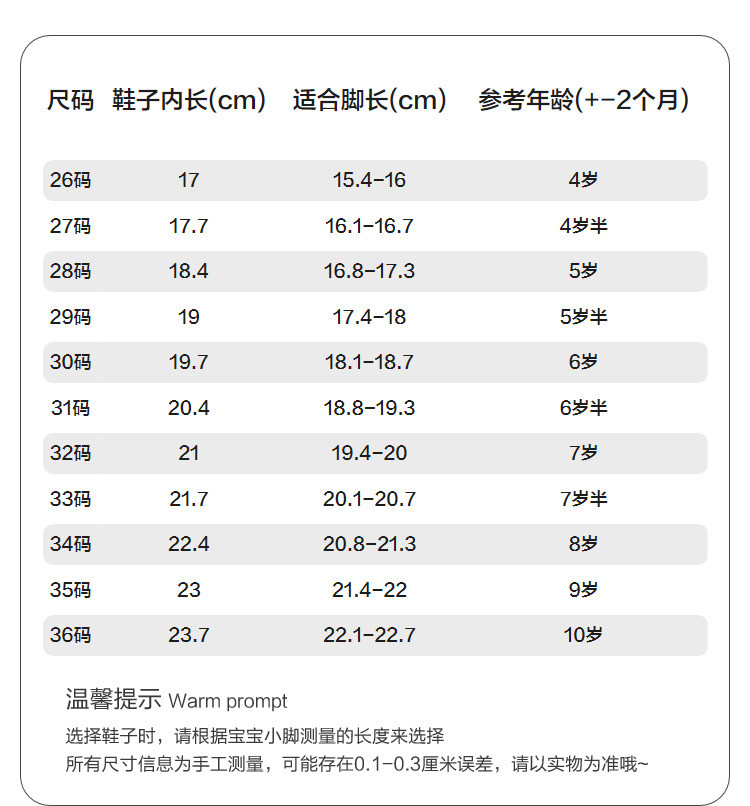 | 33码(脚长20.5/内长21.7) | 33 | 205 | 217 |