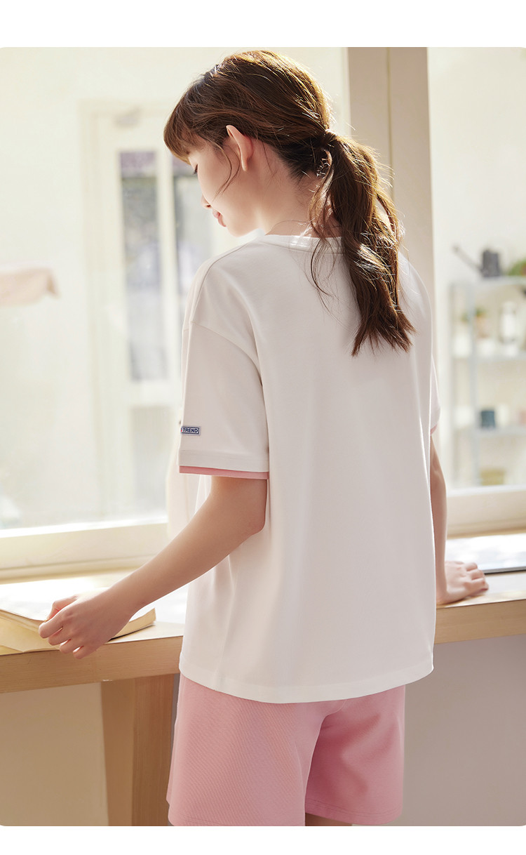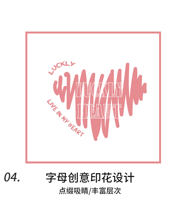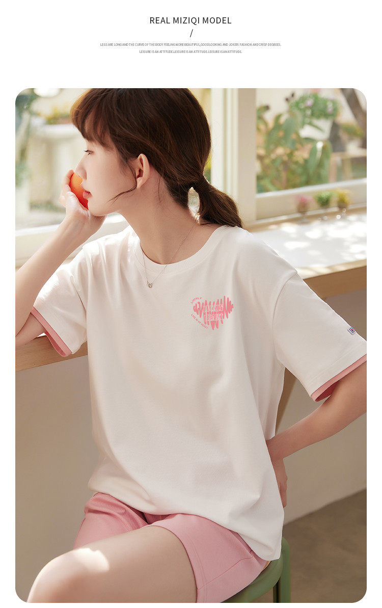 米子旗夏季圆领线条爱心印花T恤女袖口撞色简约宽松短袖上衣 962458