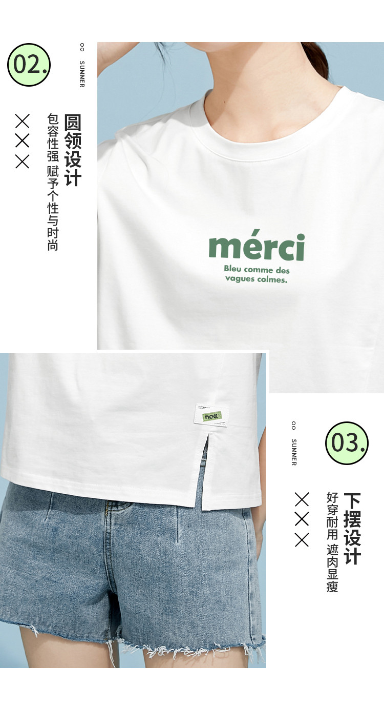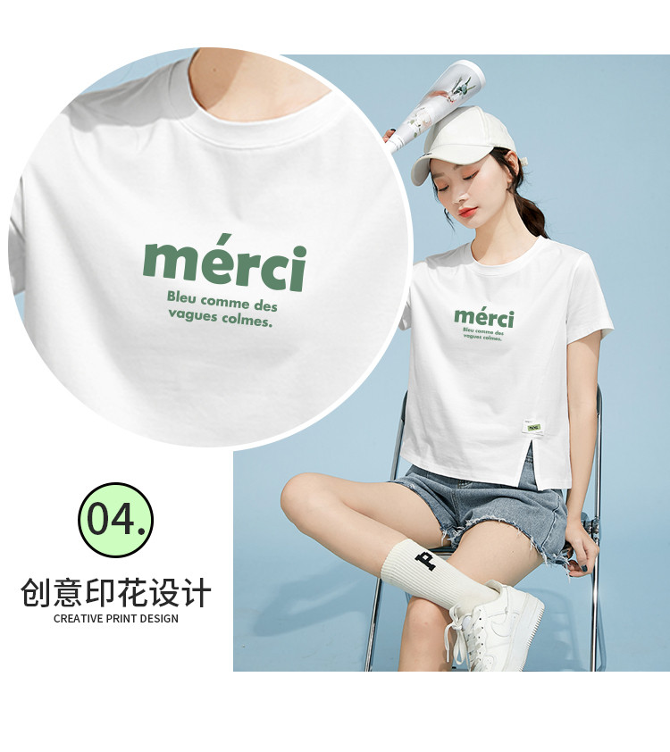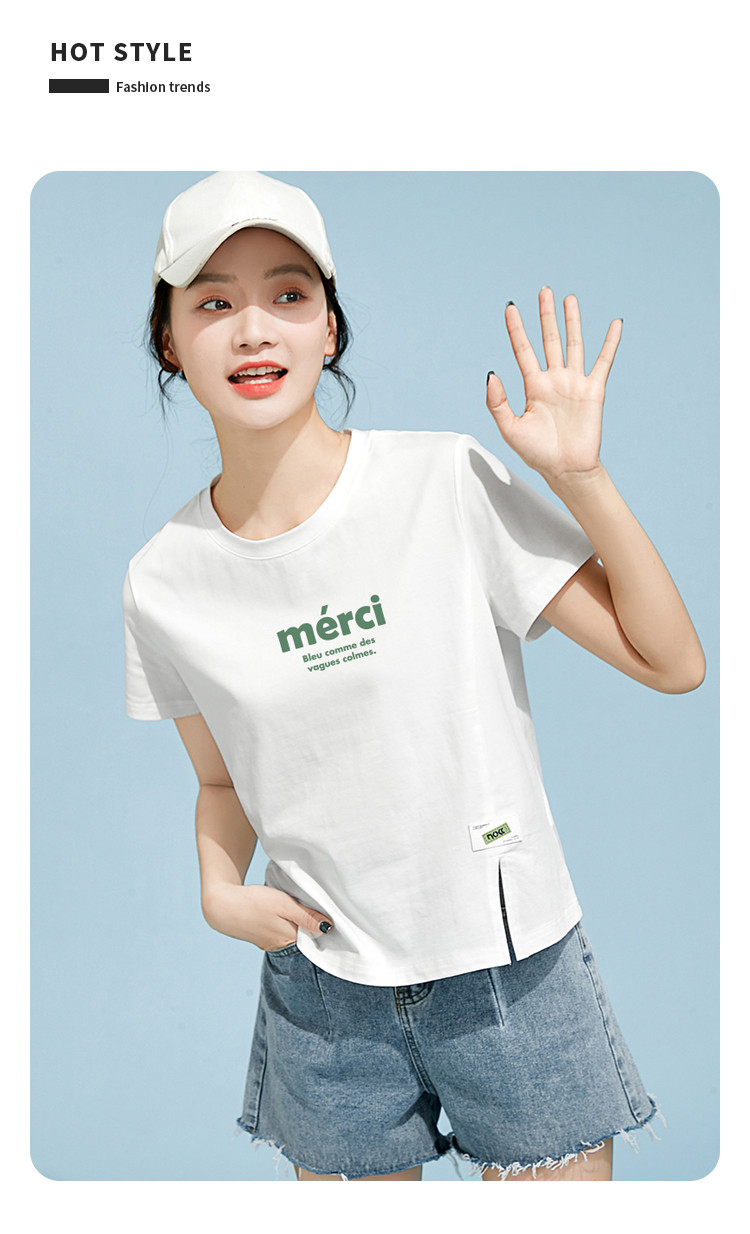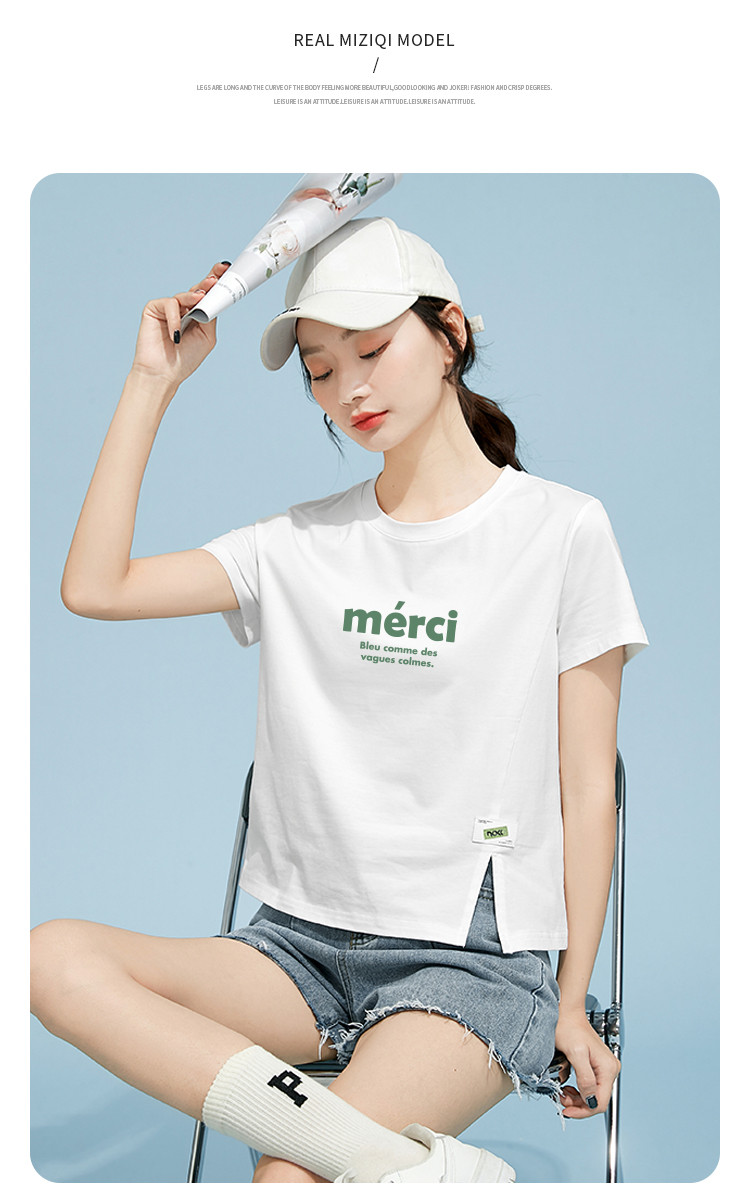 商品名称:米子旗夏季圆领字母印花T恤女下摆开叉设计短款宽松短袖上衣 073050