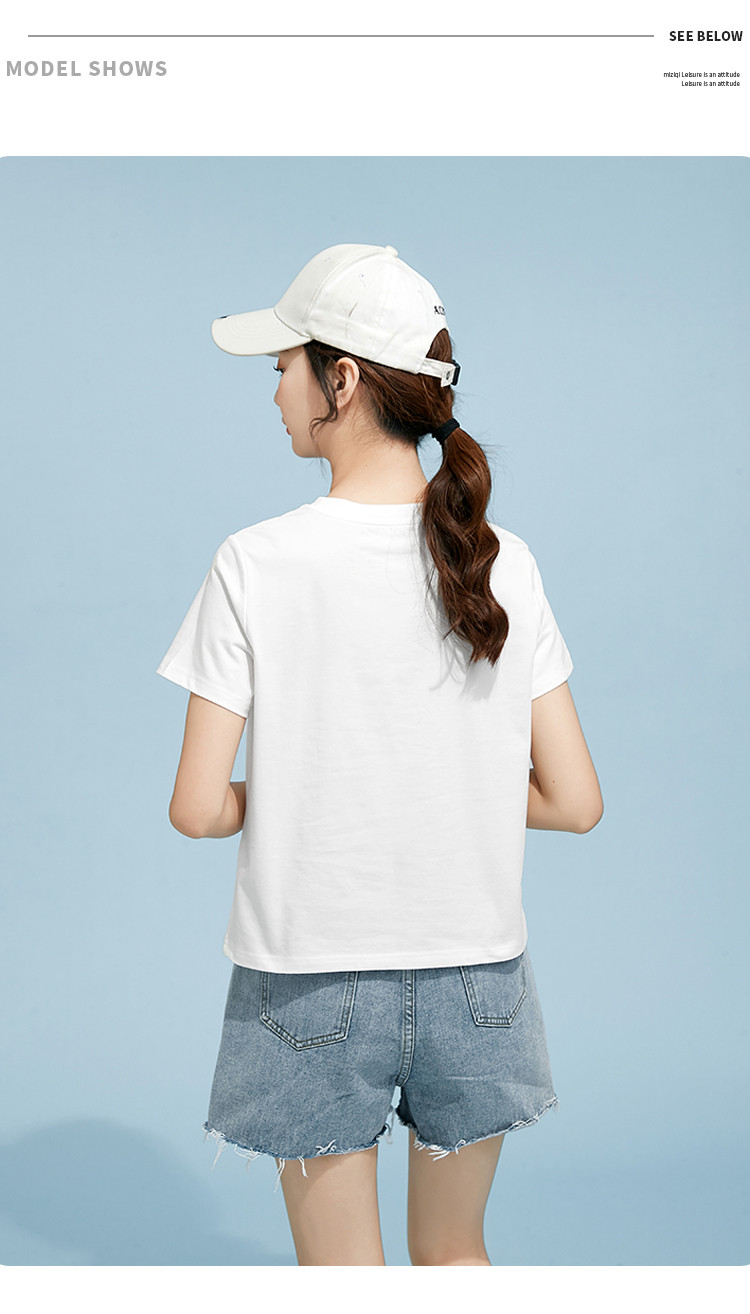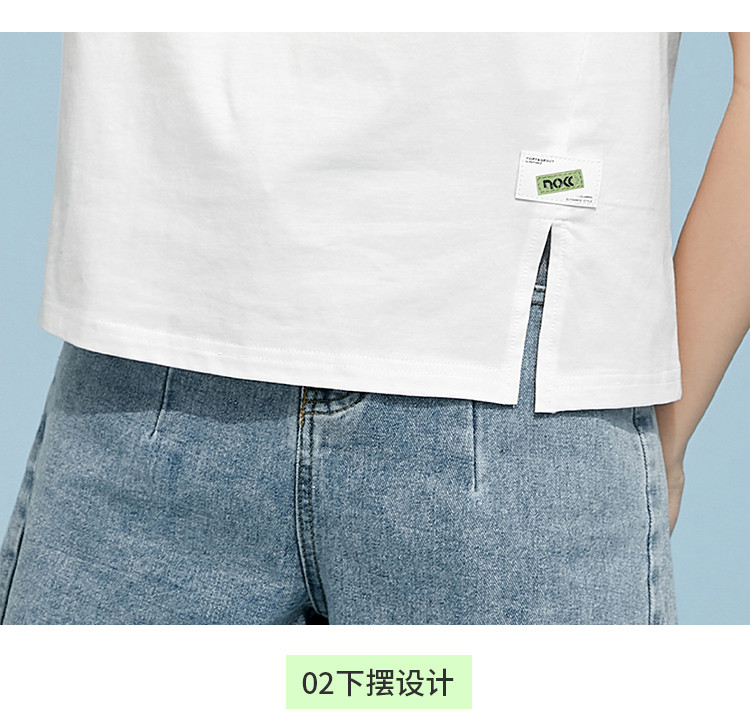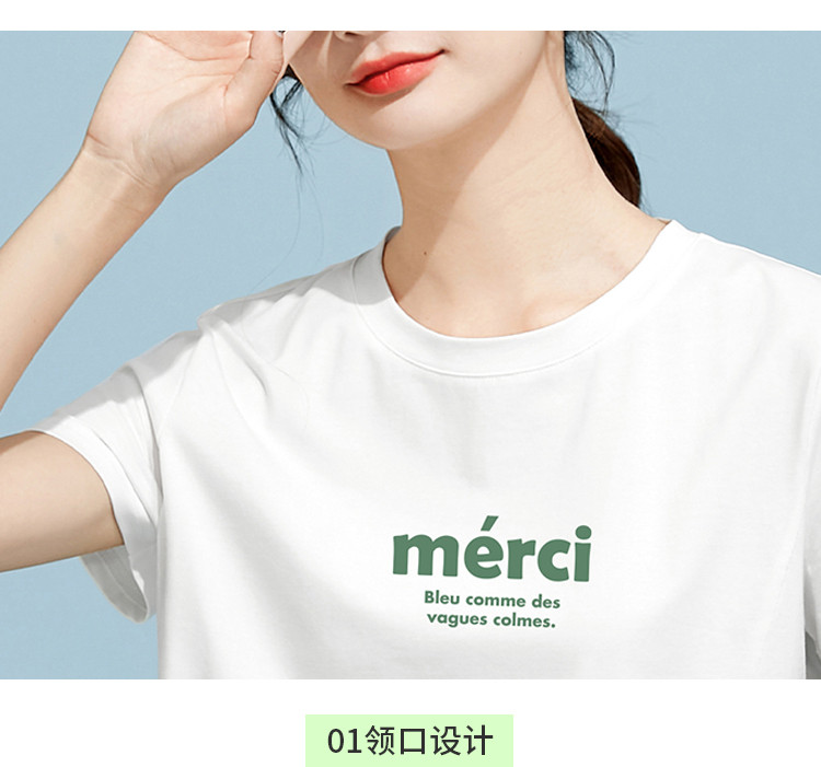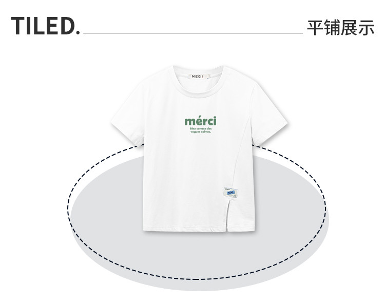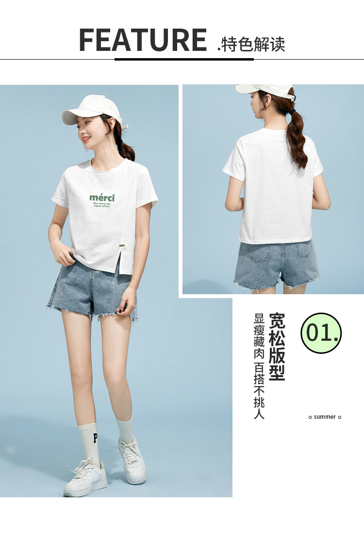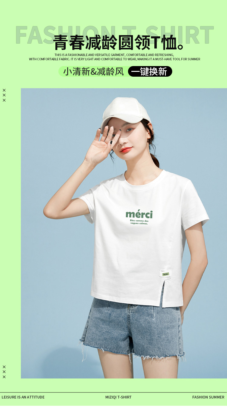 商品名称:米子旗夏季圆领字母印花T恤女下摆开叉设计短款宽松短袖上衣 073050