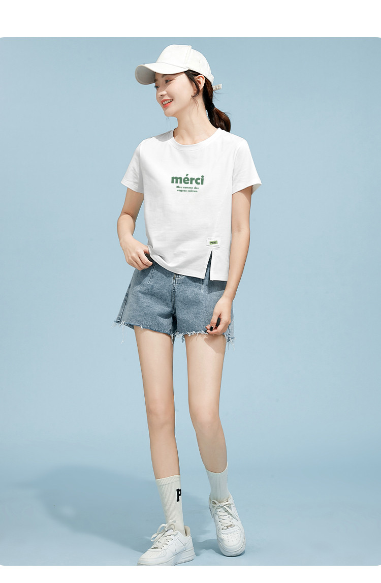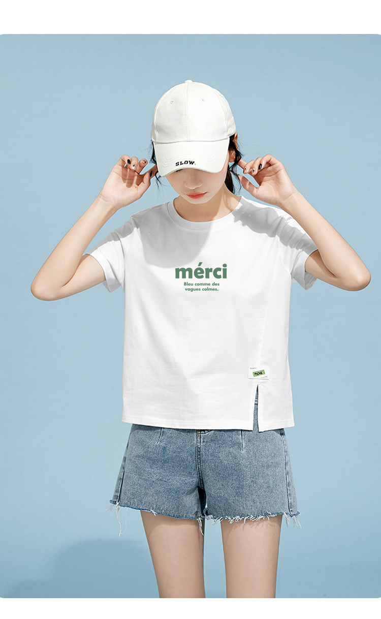 米子旗夏季圆领字母印花T恤女下摆开叉设计短款宽松短袖上衣 073050
