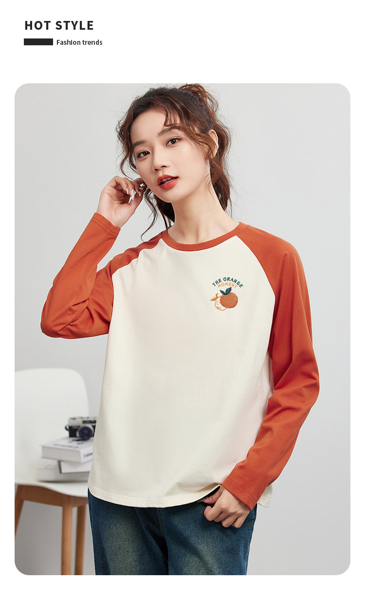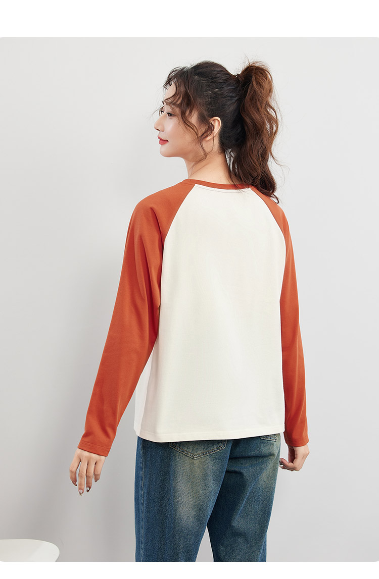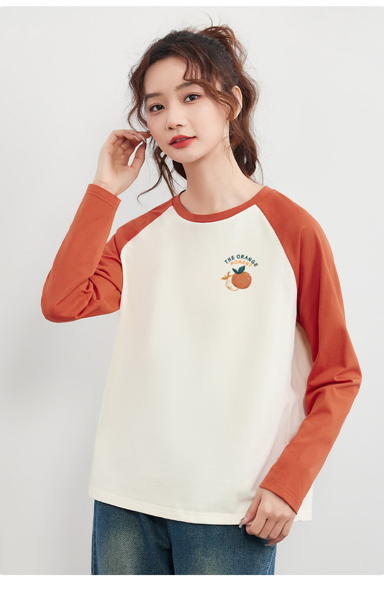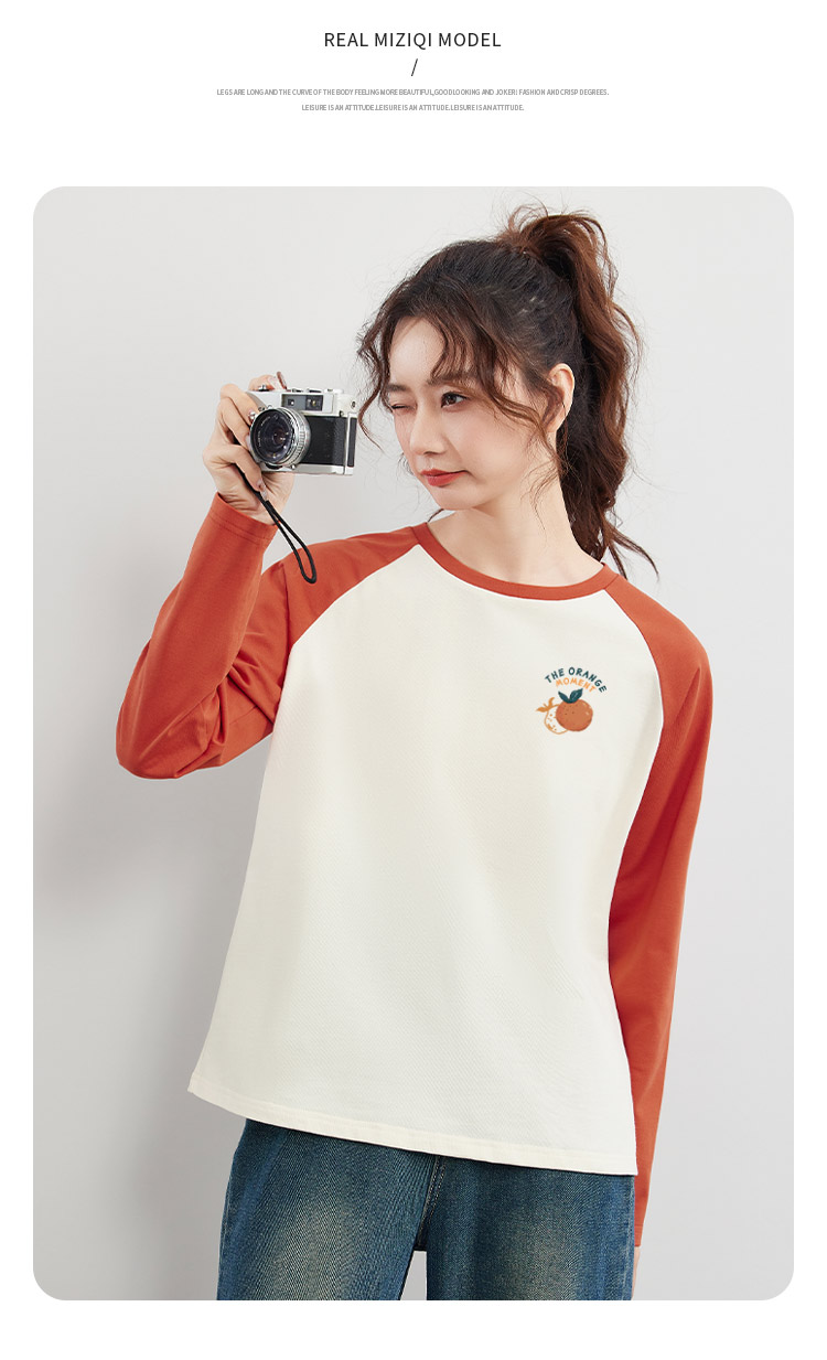 米子旗夏季圆领印花女式T恤插肩袖撞色设计宽松休闲长袖上衣 027162