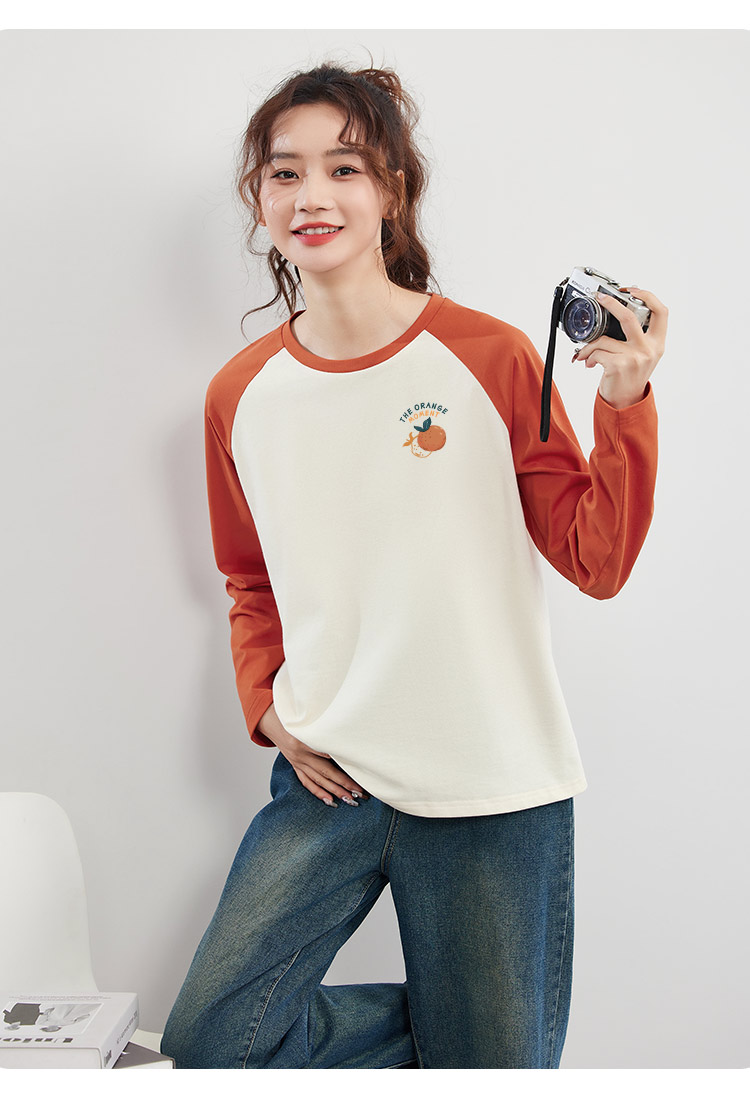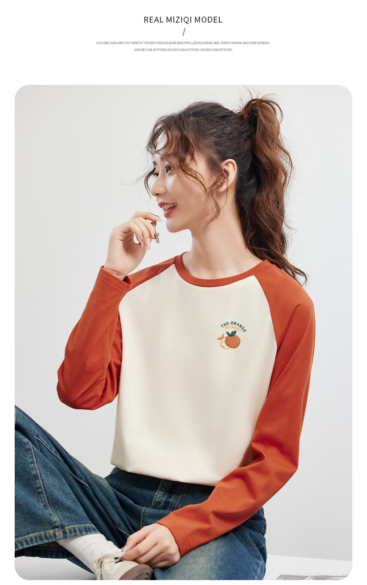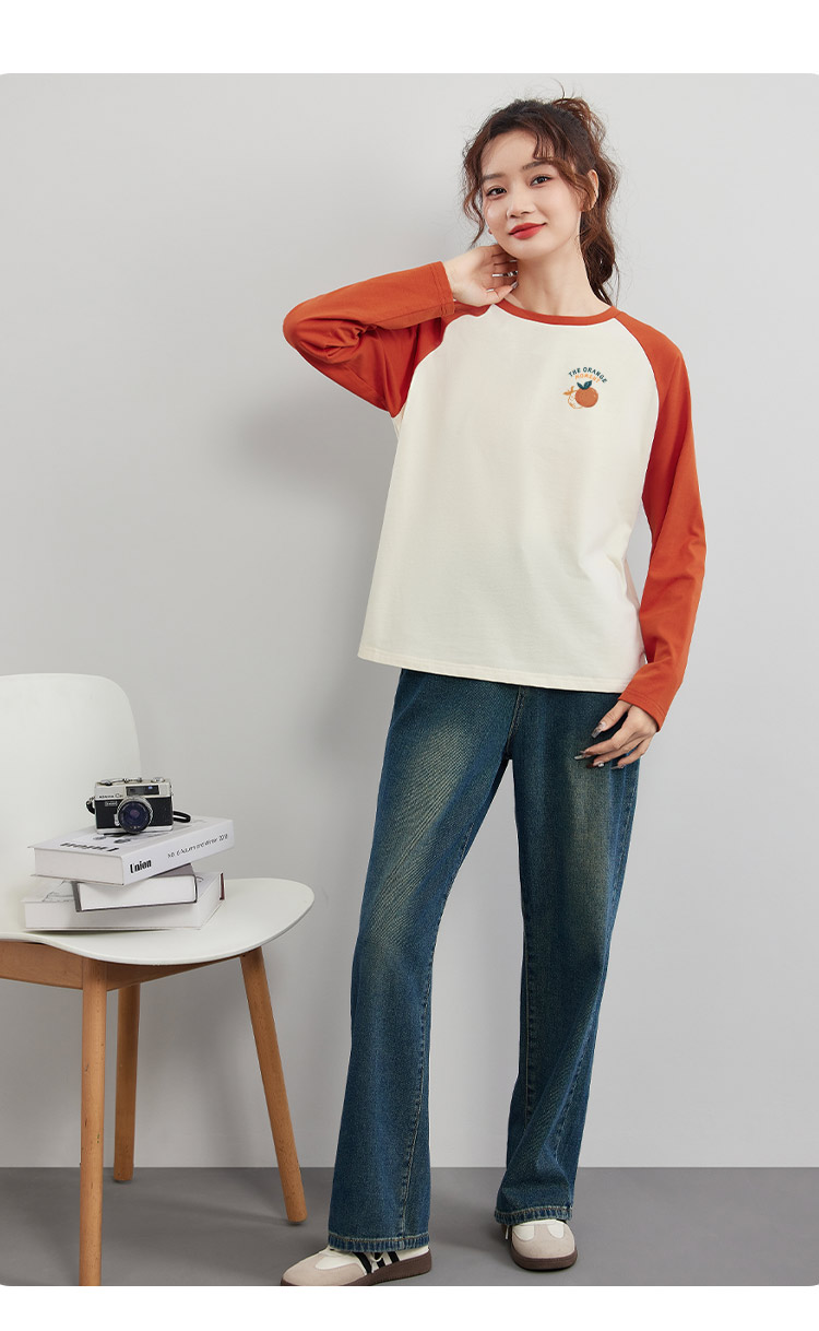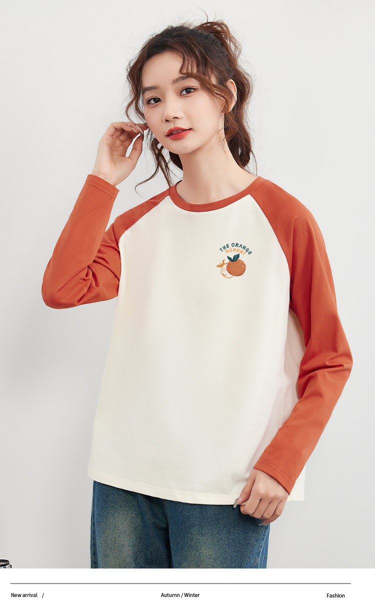 米子旗夏季圆领印花女式T恤插肩袖撞色设计宽松休闲长袖上衣 027162