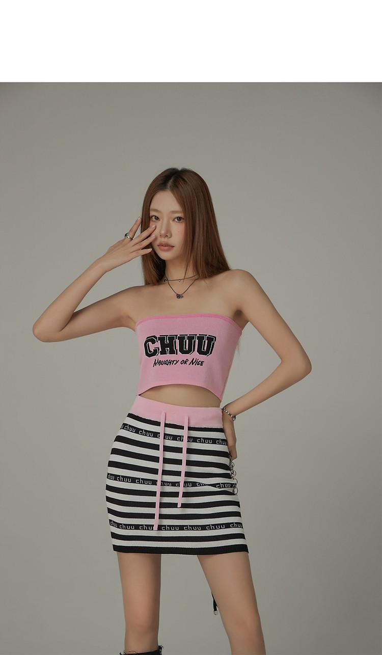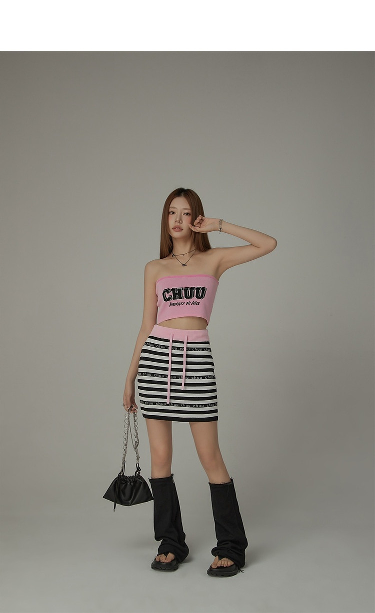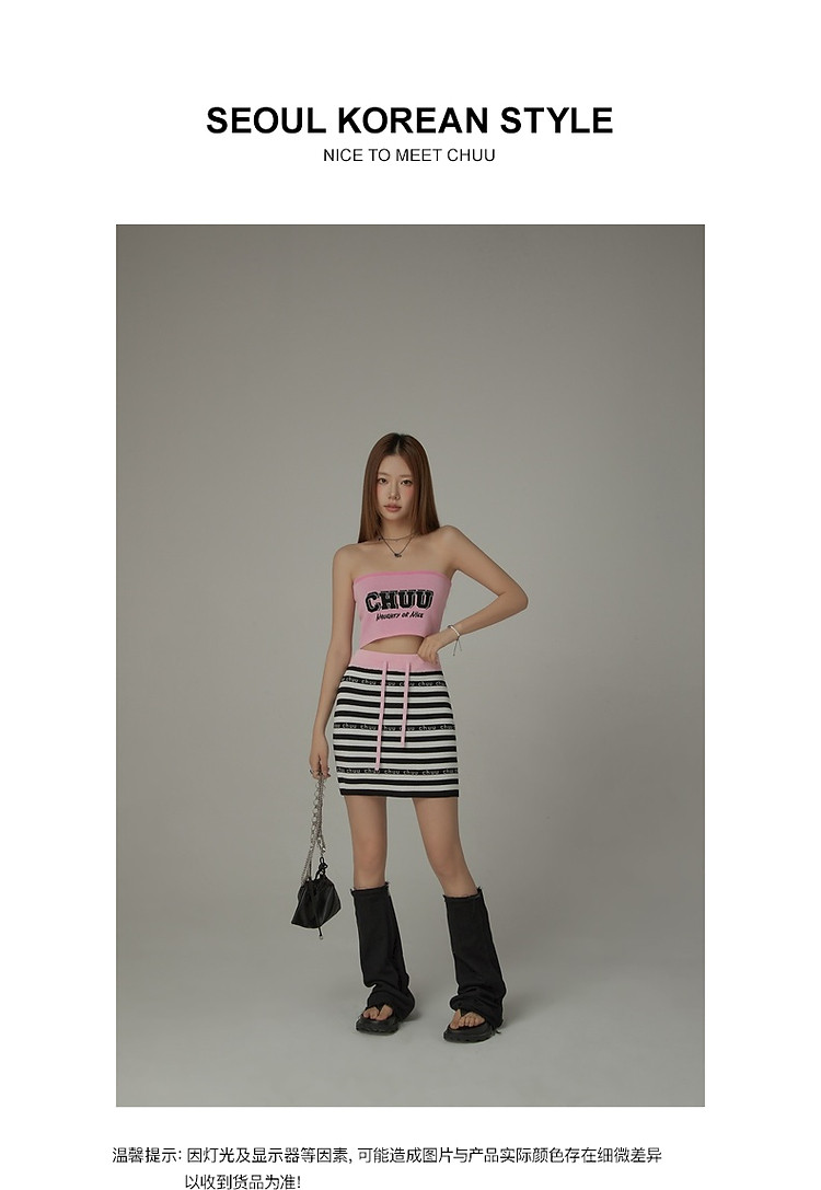 字母撞色抽绳半身裙女春夏高腰拼接针织a字包臀裙子 773395