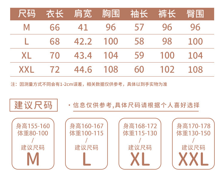 | 尺码 | 肩宽(cm) | 袖长(cm) | 衣长(cm) | 身高(cm) | 裤长(cm) | 体重(kg) | 臀围(cm) | 胸围(cm) | 号型 |