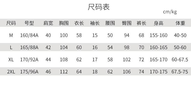 | 尺码 | 肩宽(cm) | 袖长(cm) | 衣长(cm) | 身高(cm) | 腰围(cm) | 裤长(cm) | 体重(kg) | 臀围(cm) | 胸围(cm) | 号型 |