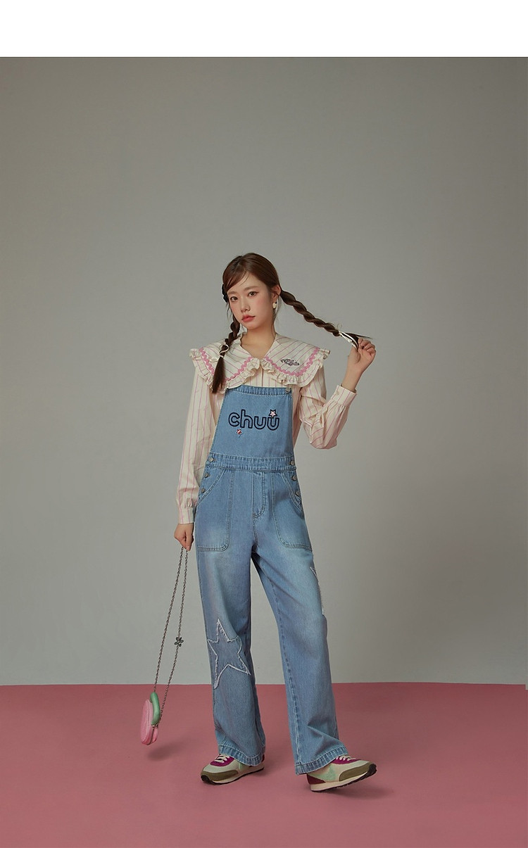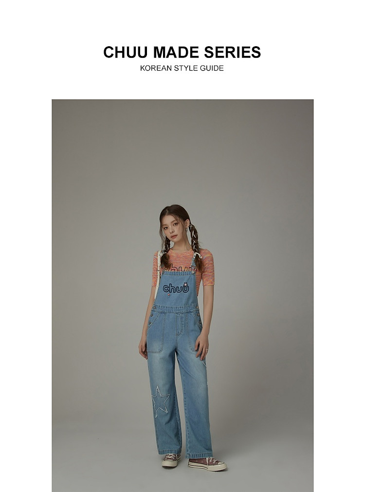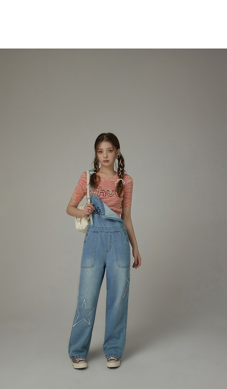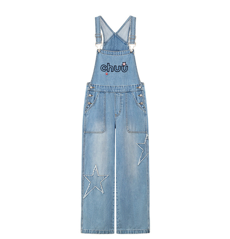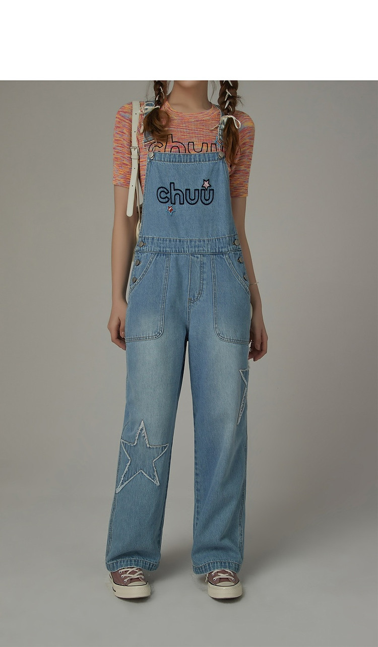 刺绣背带牛仔裤女夏字母星星宽松阔腿长裤子 961811