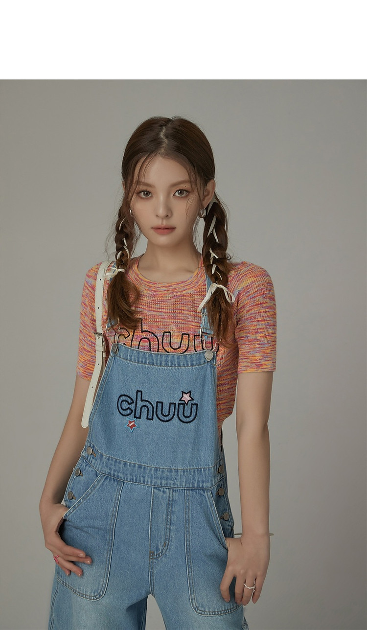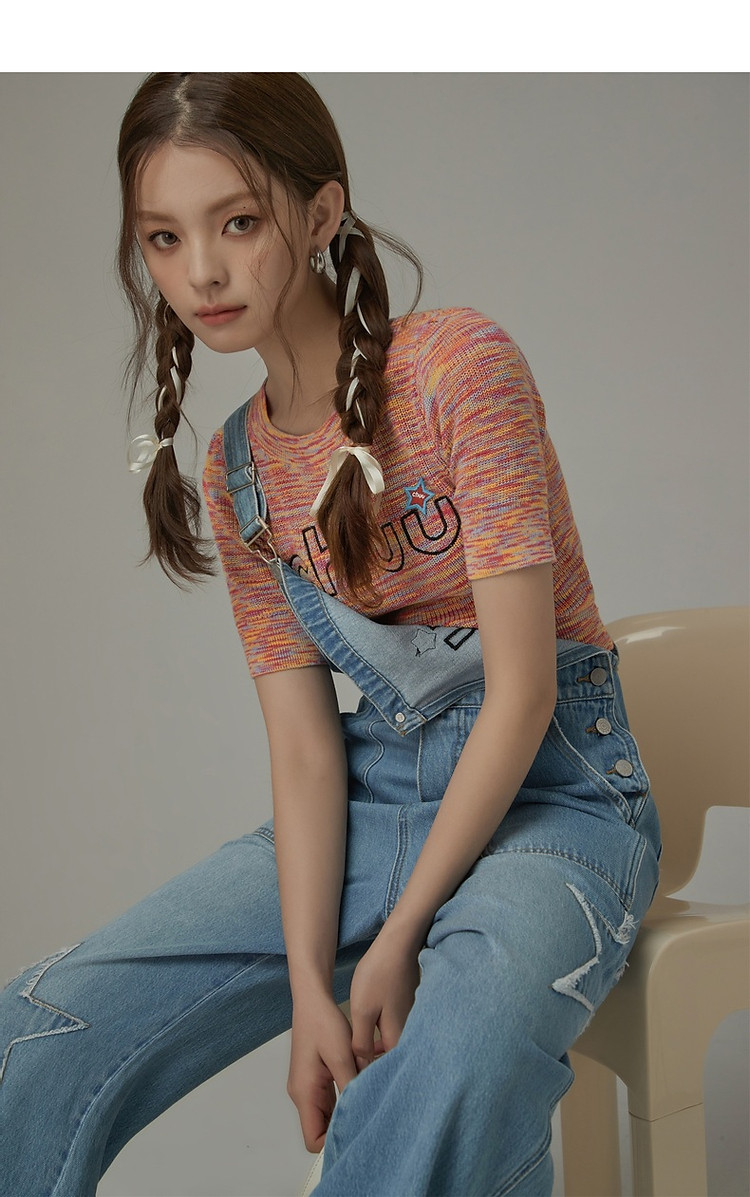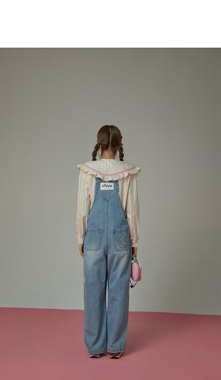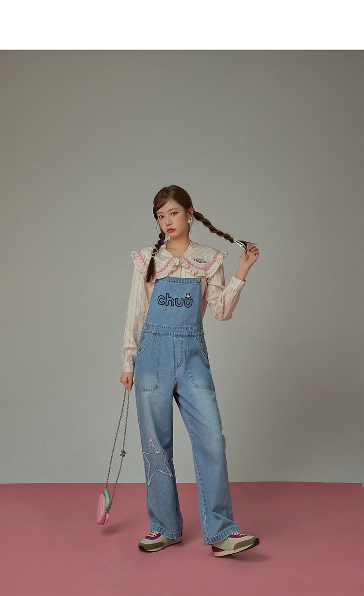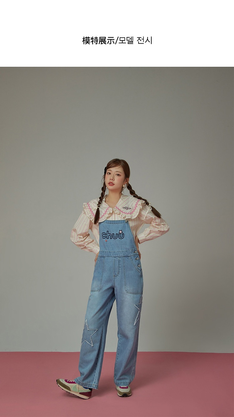 刺绣背带牛仔裤女夏字母星星宽松阔腿长裤子 961811
