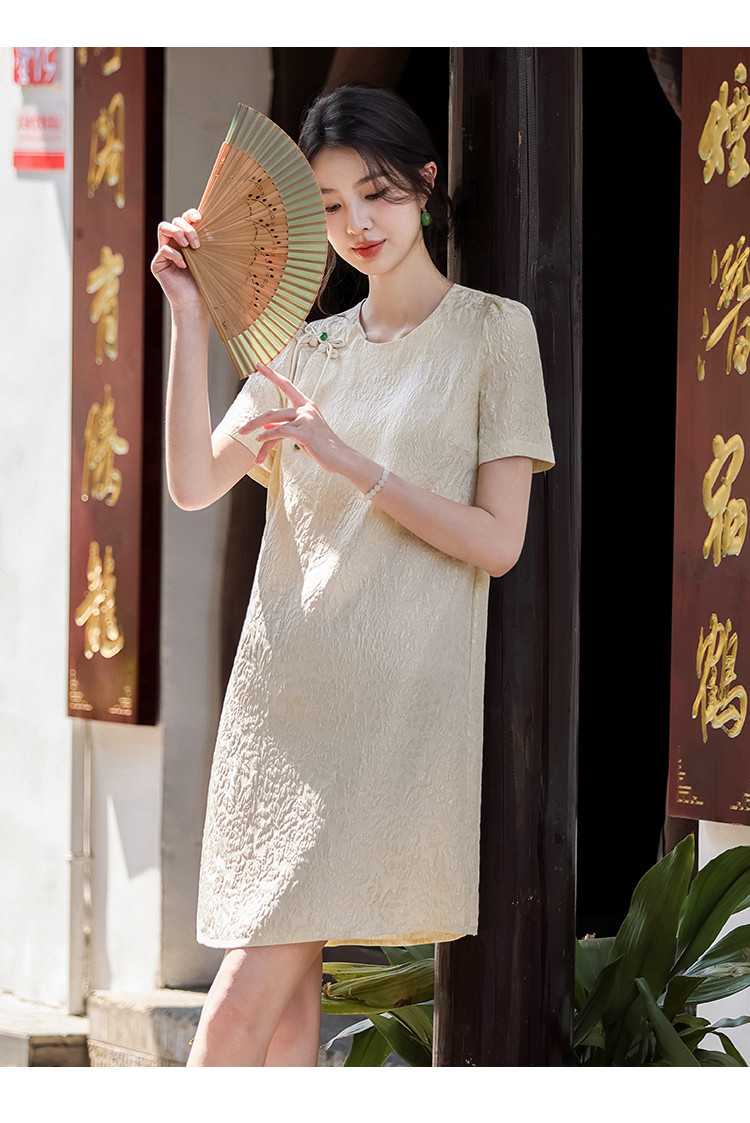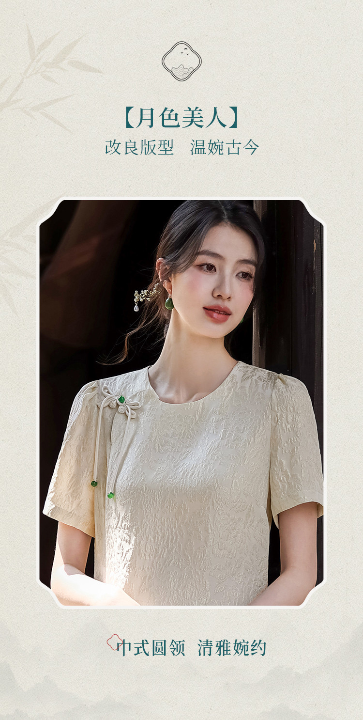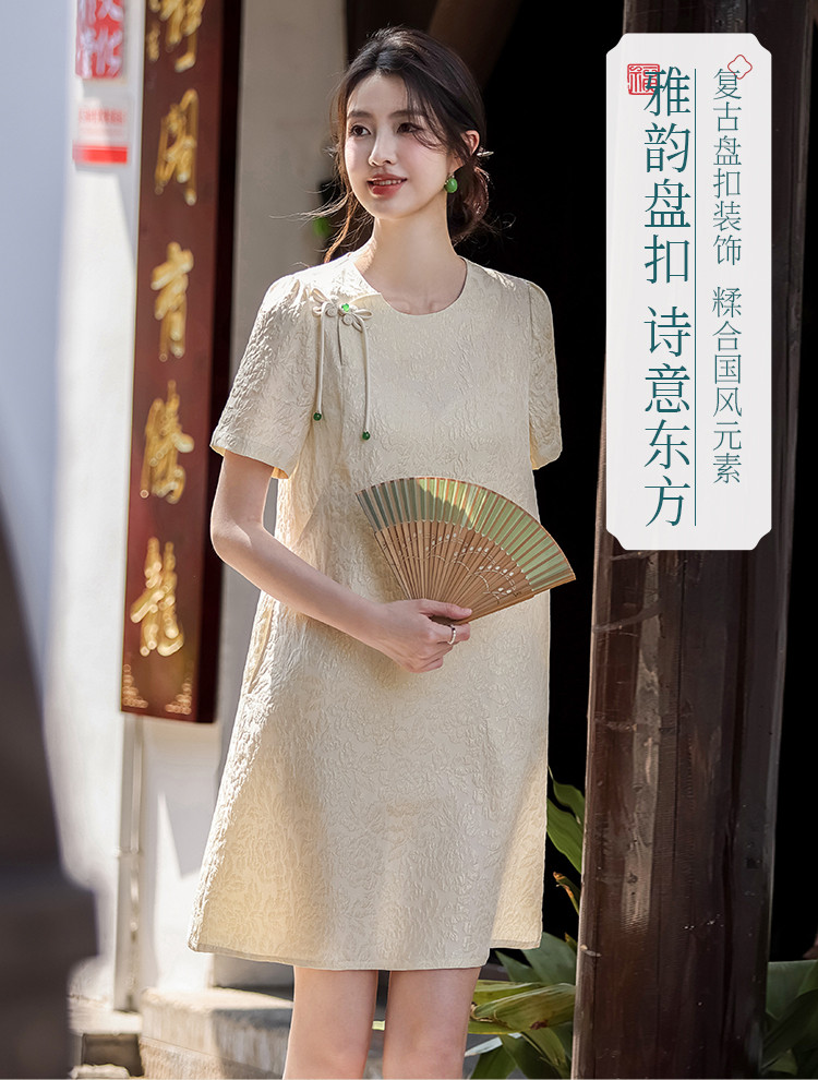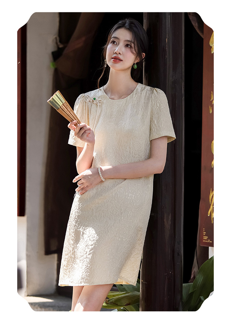 商品名称:90桑蚕丝~国风新中式圆领纯色提花桑蚕丝连衣裙高级感裙子夏 061331