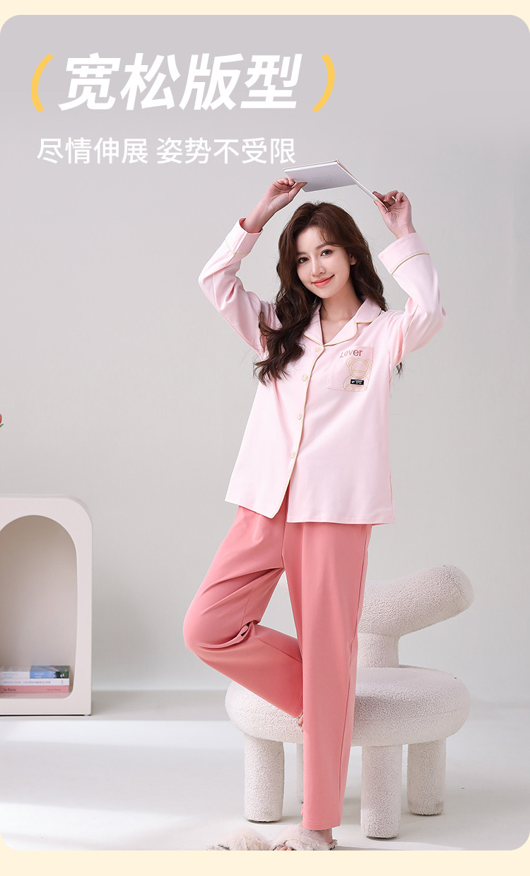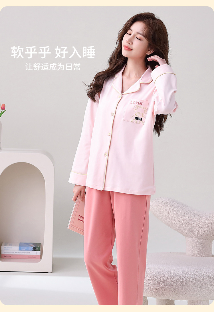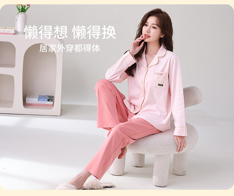 【100%棉】翻领开衫睡衣女士春秋款亲肤纯棉家居服套装可外穿 315275