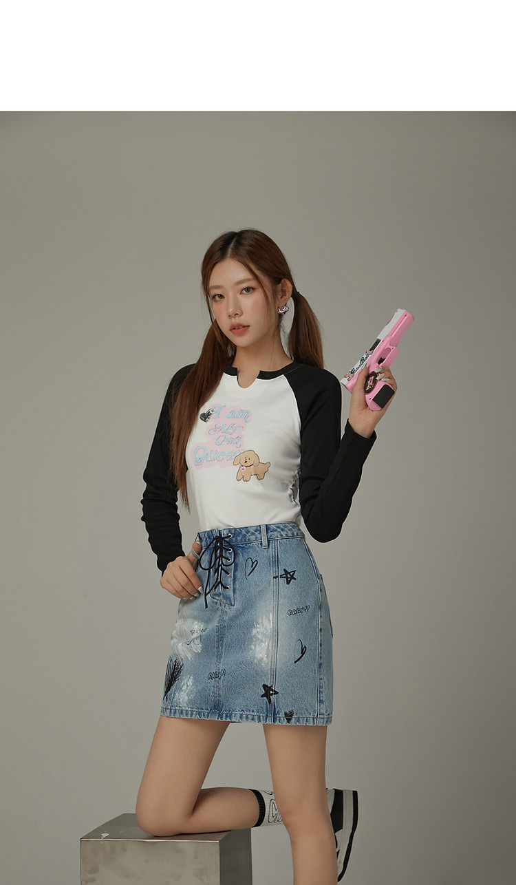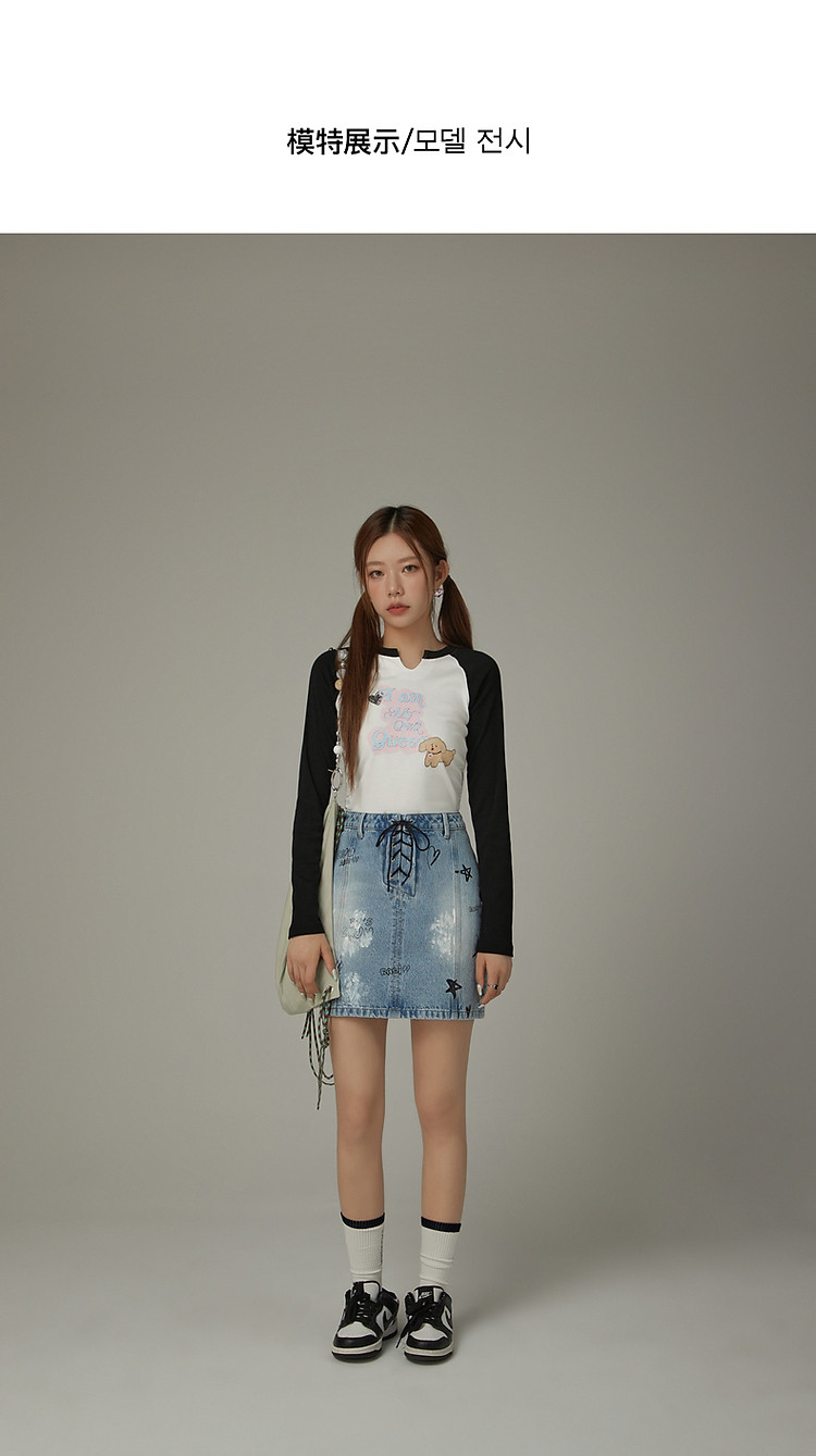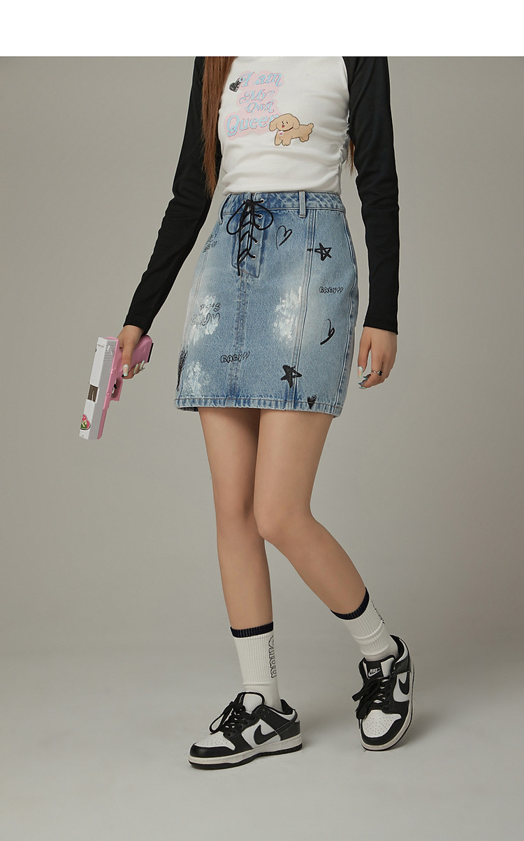 CHUU字母印花牛仔半身裙女春秋系带拉链A字裙短裙 199635