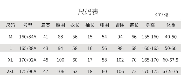 | 尺码 | 肩宽(cm) | 袖长(cm) | 衣长(cm) | 身高(cm) | 腰围(cm) | 裤长(cm) | 体重(kg) | 臀围(cm) | 胸围(cm) | 号型 |