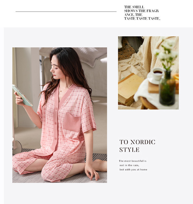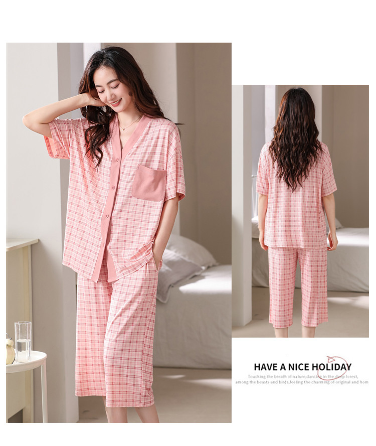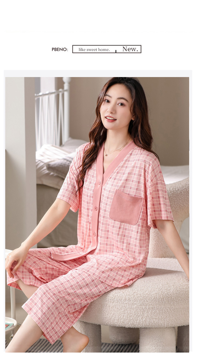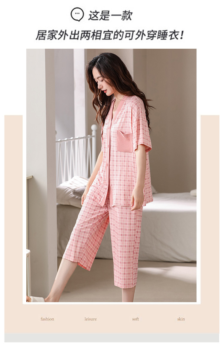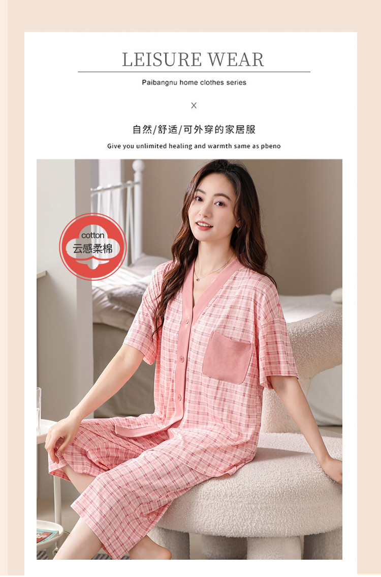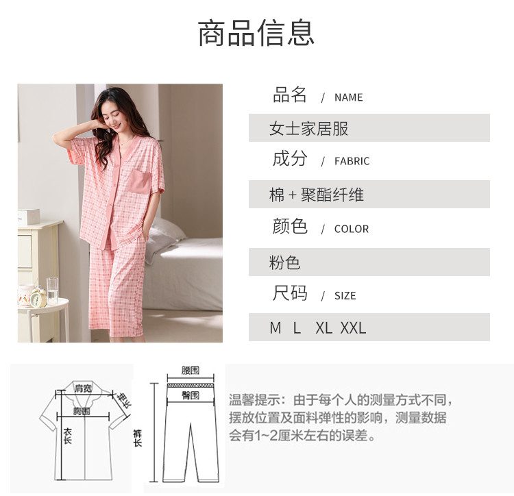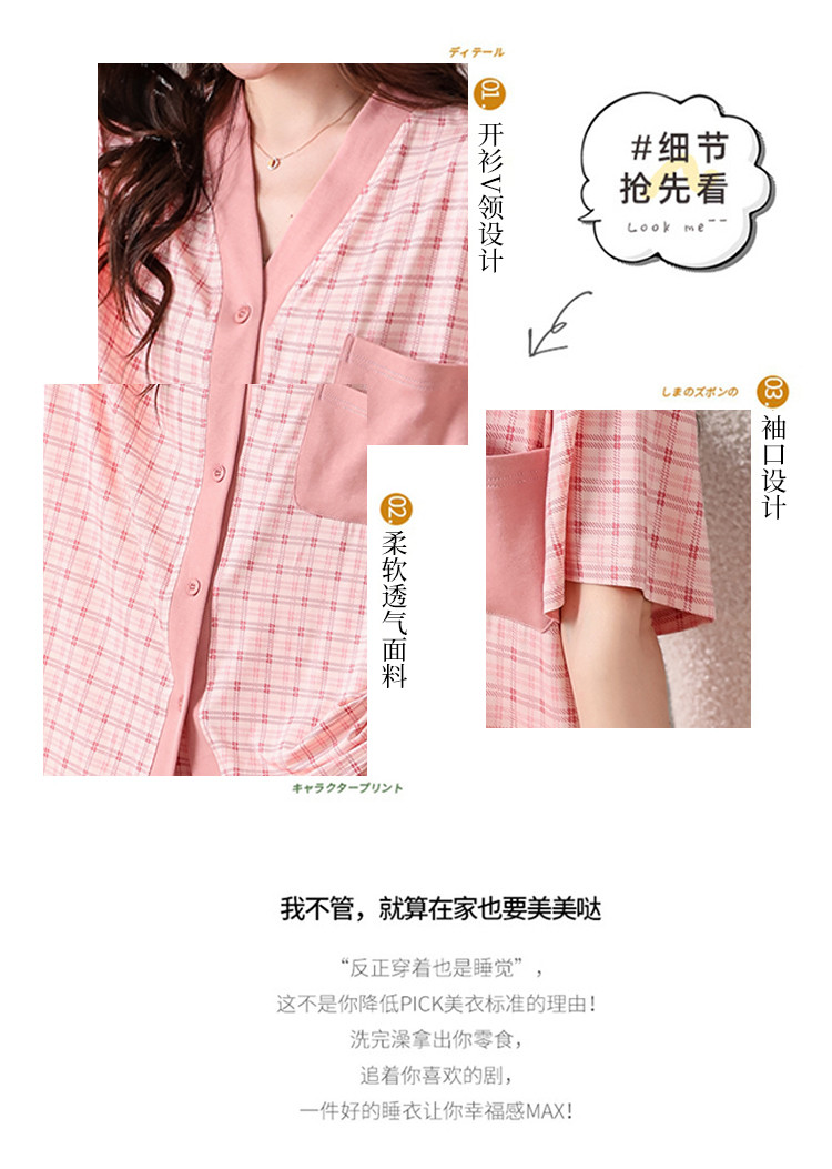 商品名称:【钜惠捡漏】夏开衫V领格纹棉质亲肤透气女睡衣家居服柔软可外穿 303262