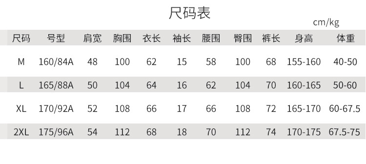 尺码 肩宽(cm) 袖长(cm) 上装号型 下装号型 衣长(cm) 身高(cm) 腰围(cm) 裤长(cm) 体重(kg) 臀围(cm) 胸围(cm) 号型
