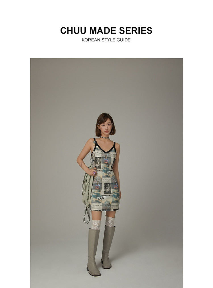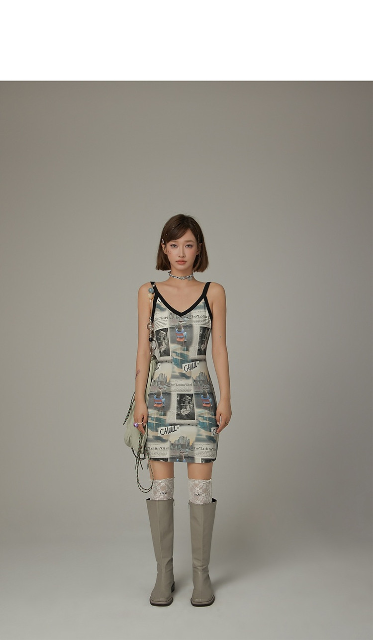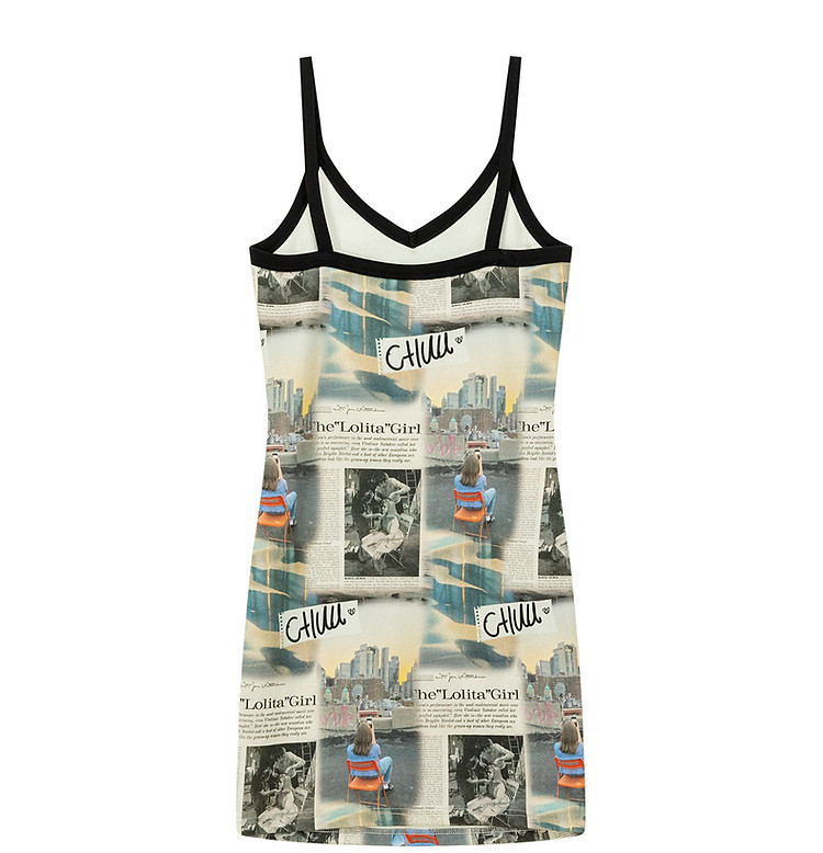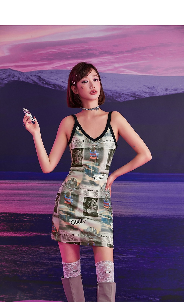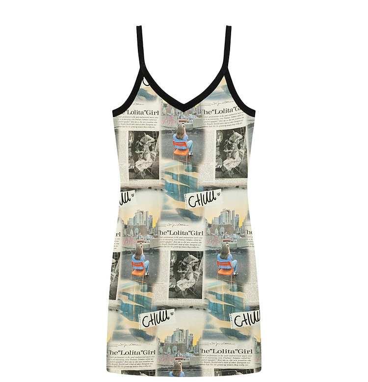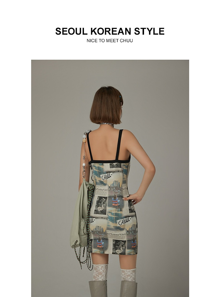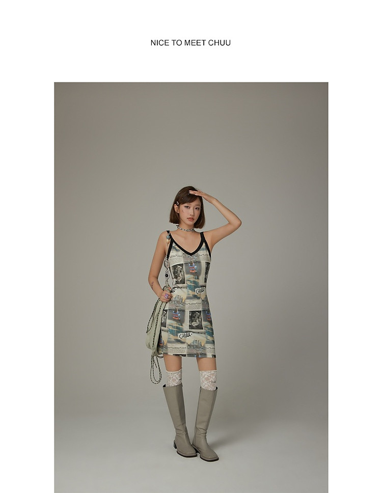 CHUU印花吊带连衣裙女春秋辣妹个性背心裙V领短裙 145875