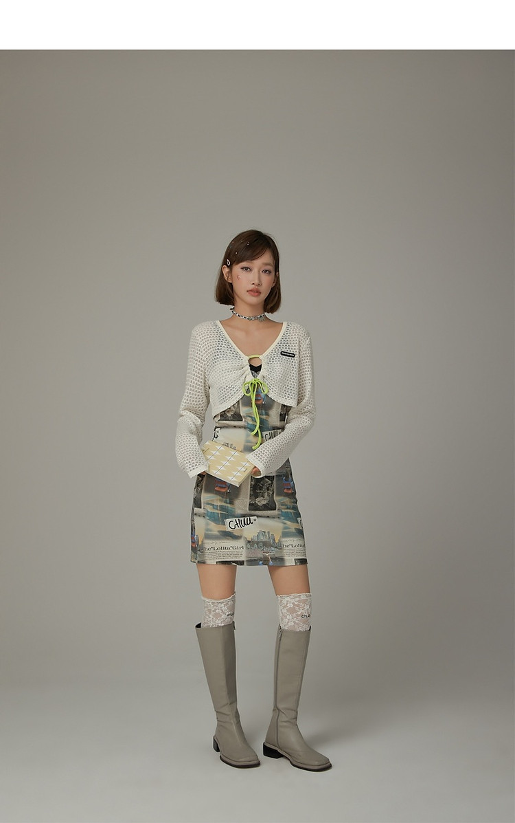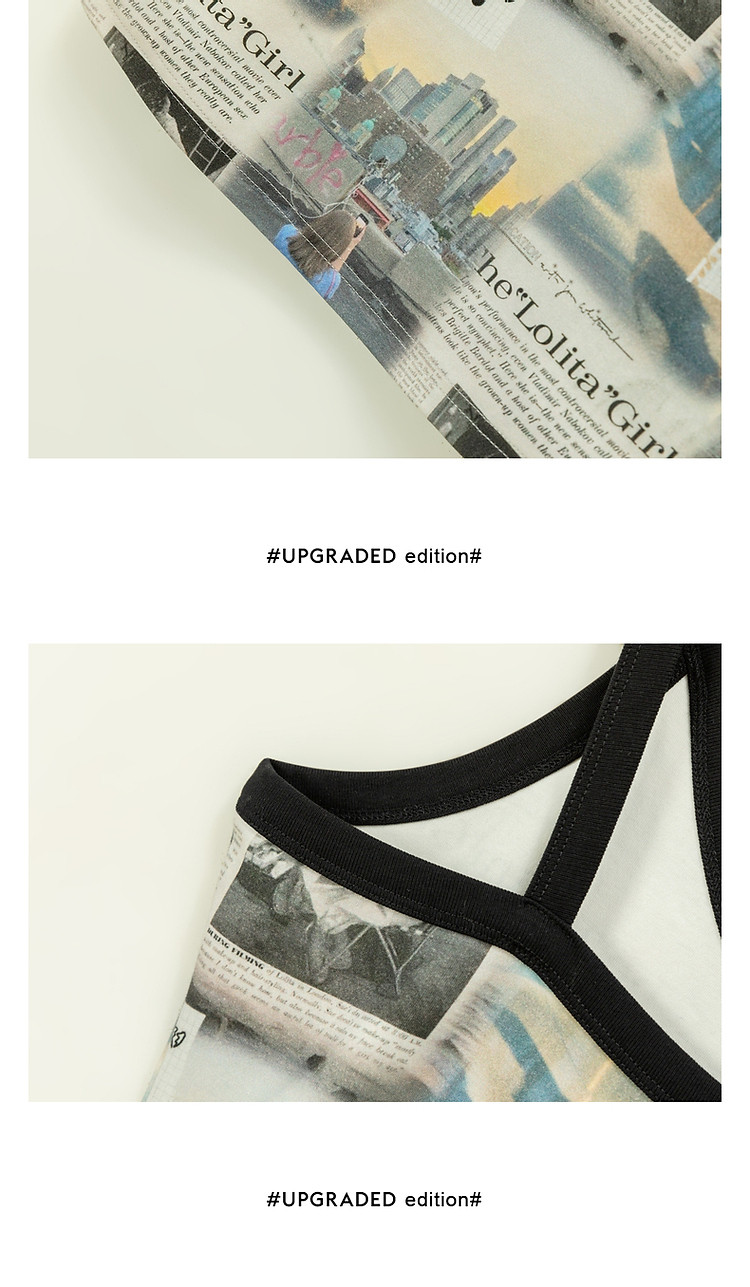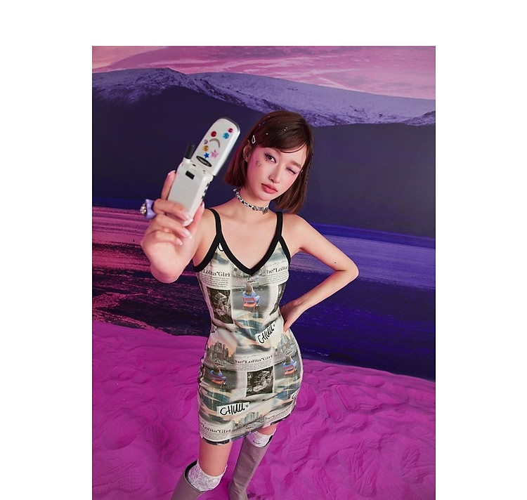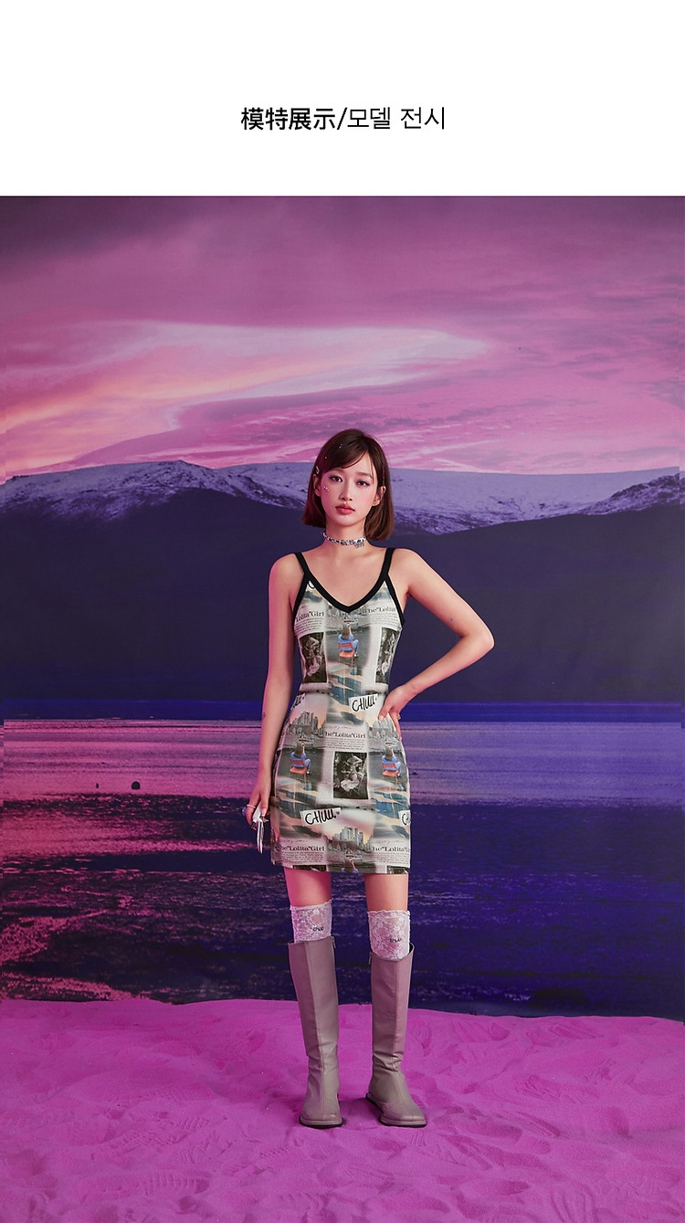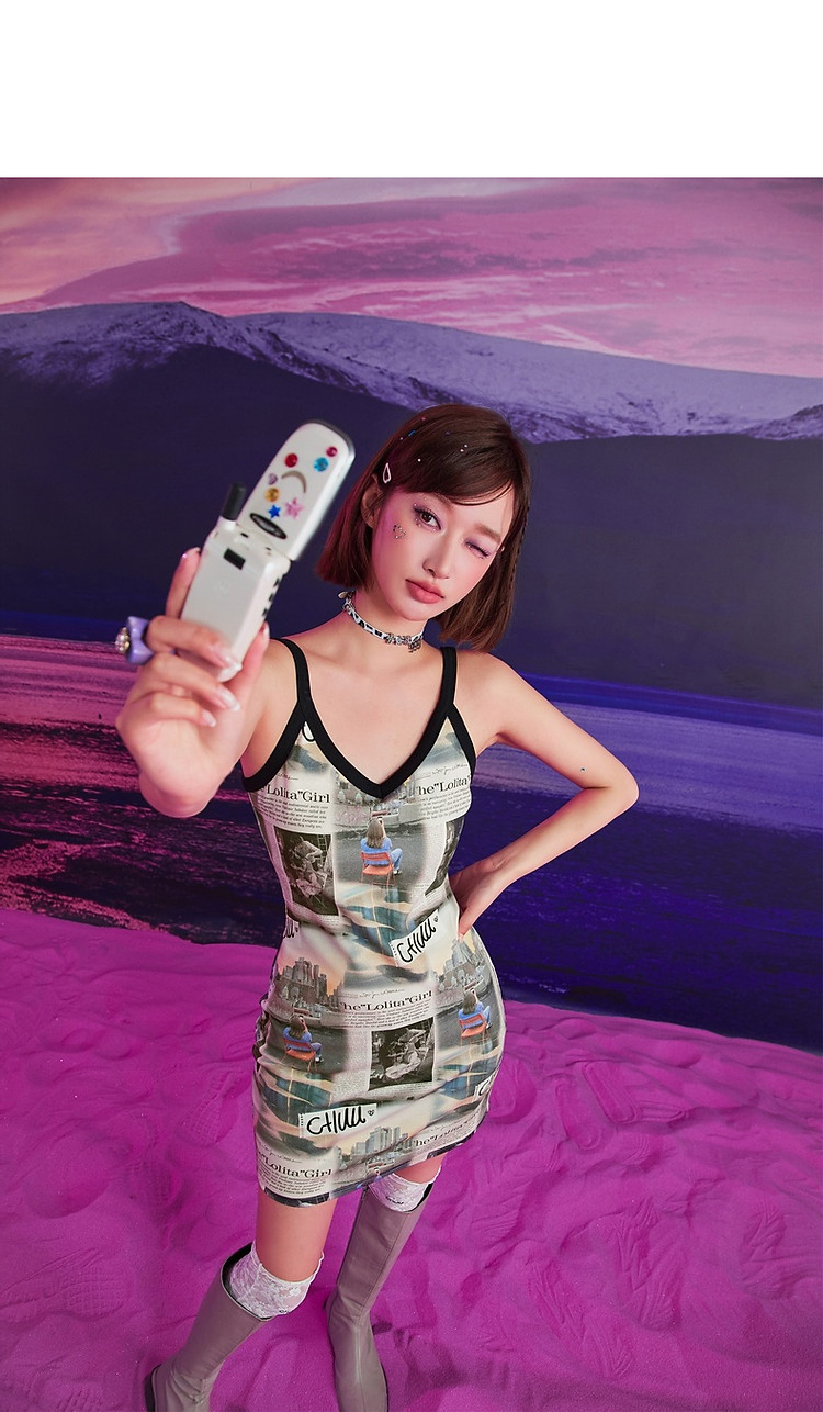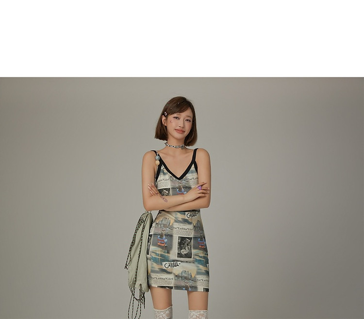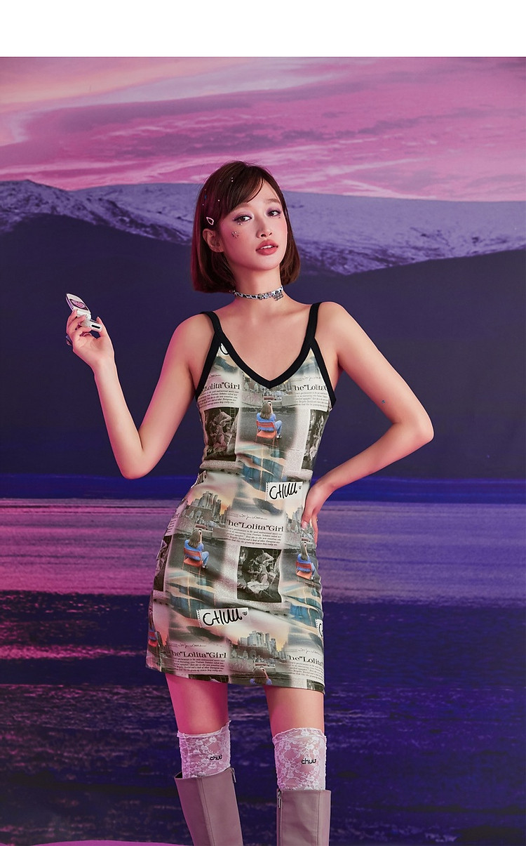 CHUU印花吊带连衣裙女春秋辣妹个性背心裙V领短裙 145875