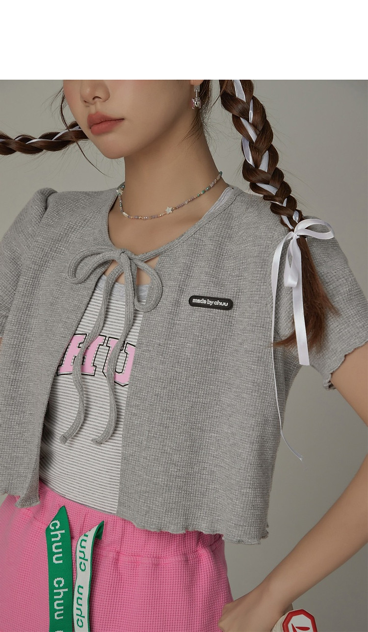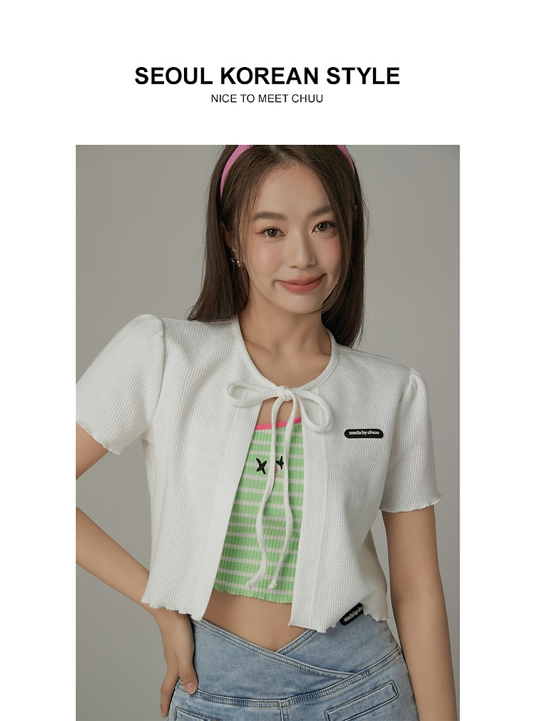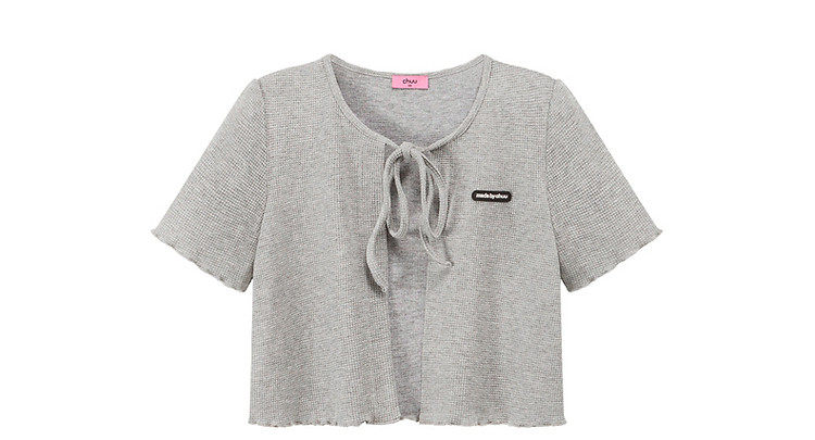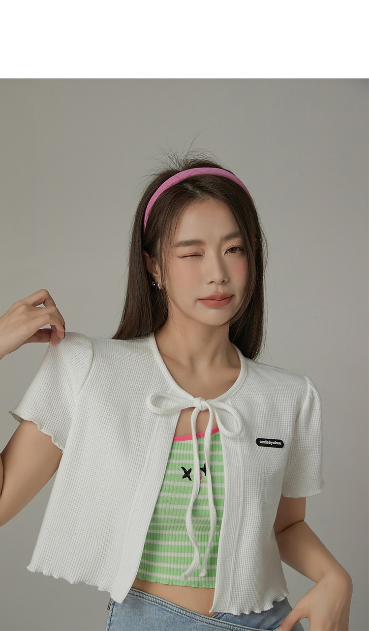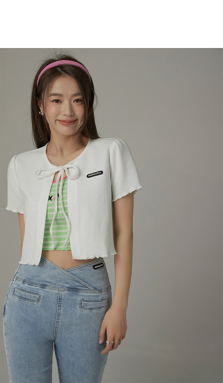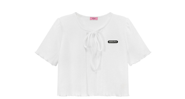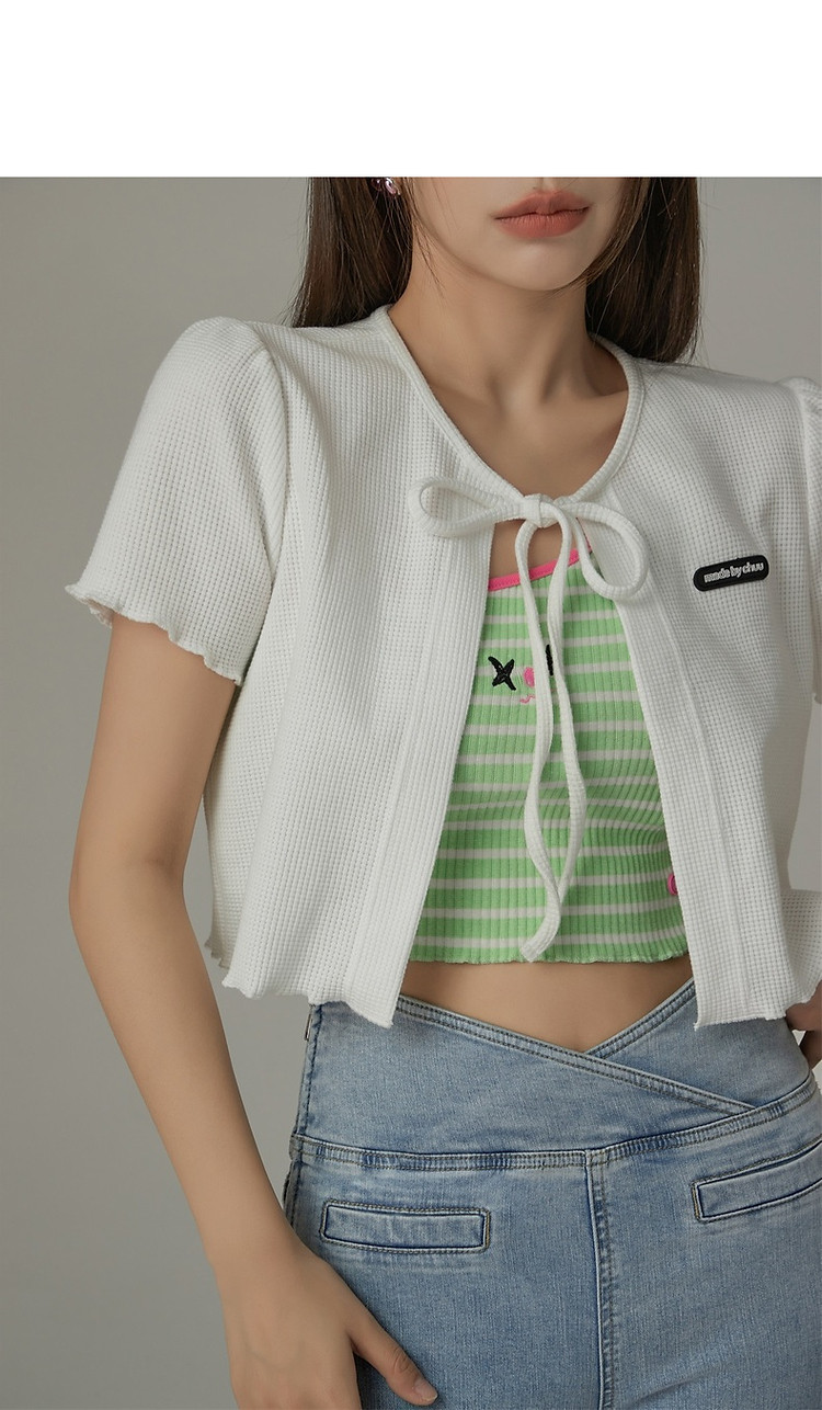 华夫格系带外套女士春夏小香风木耳边纯色短袖上衣 947347