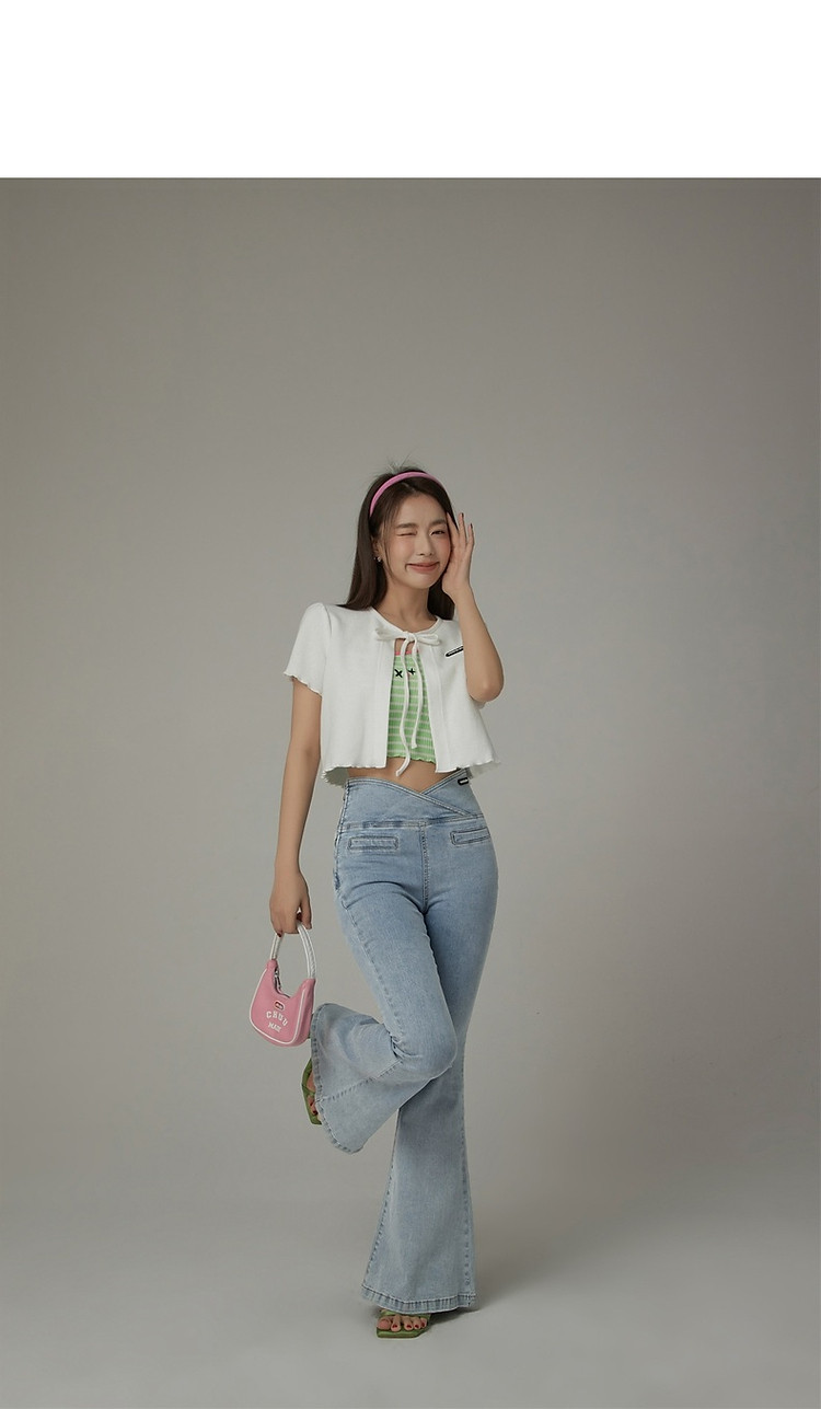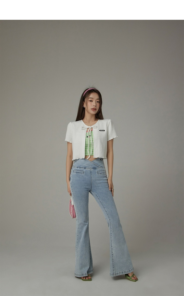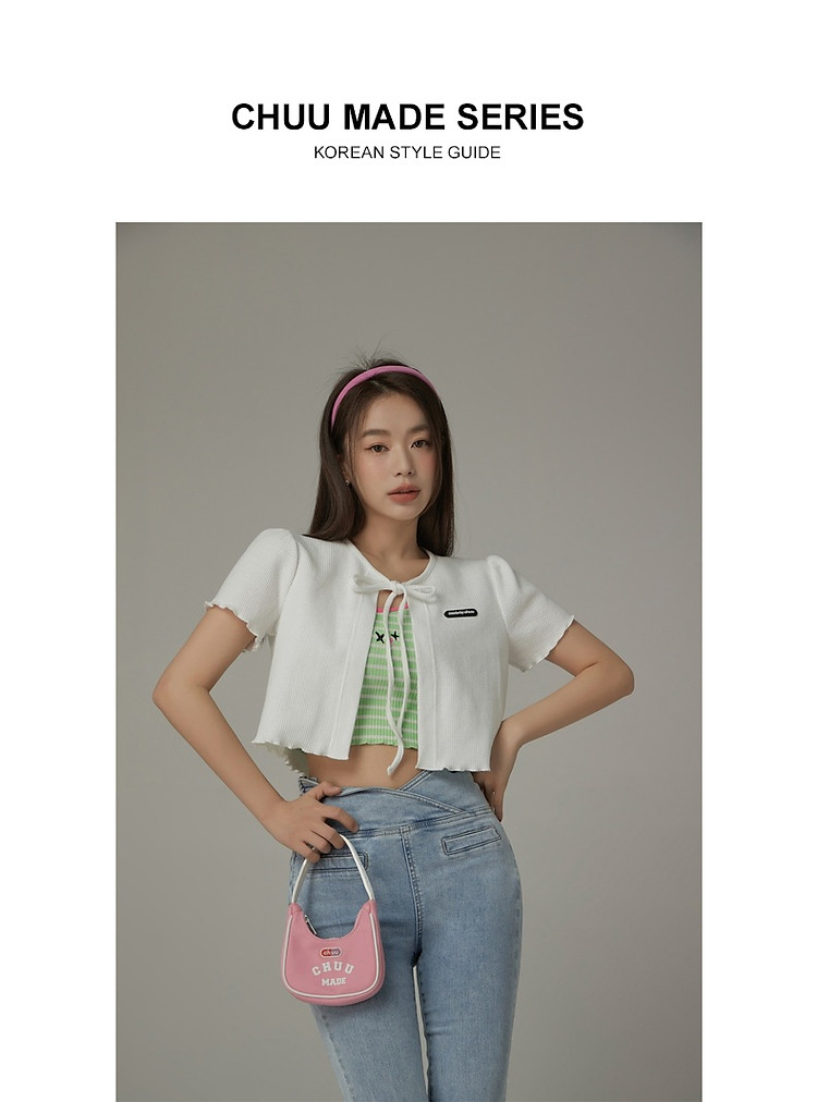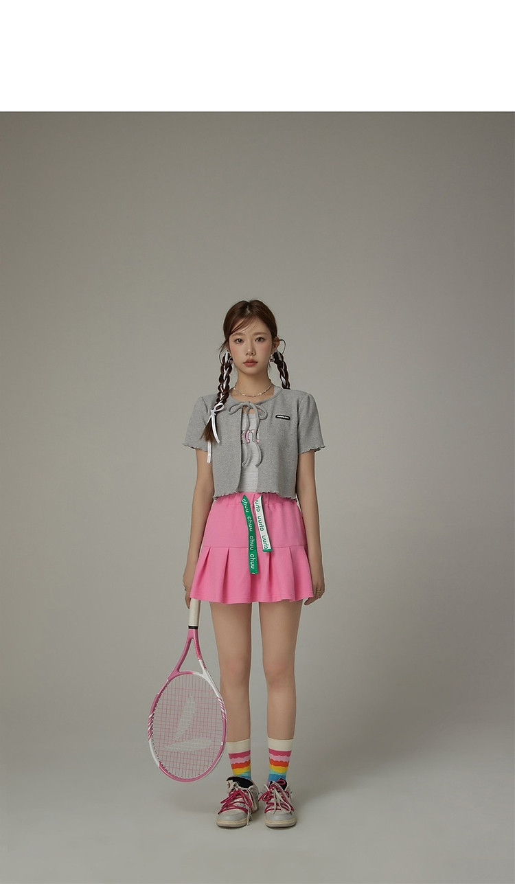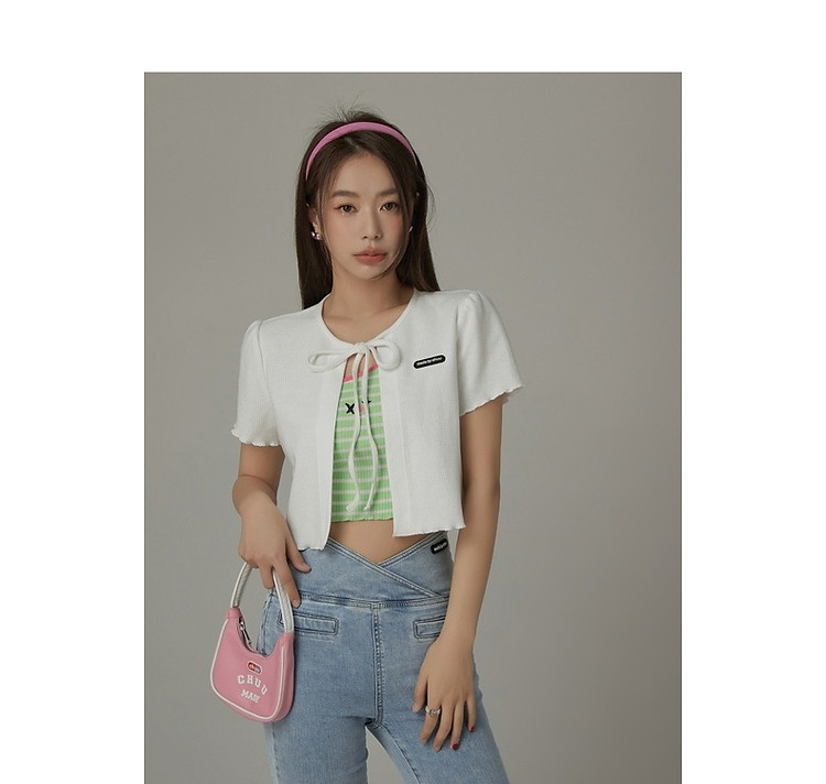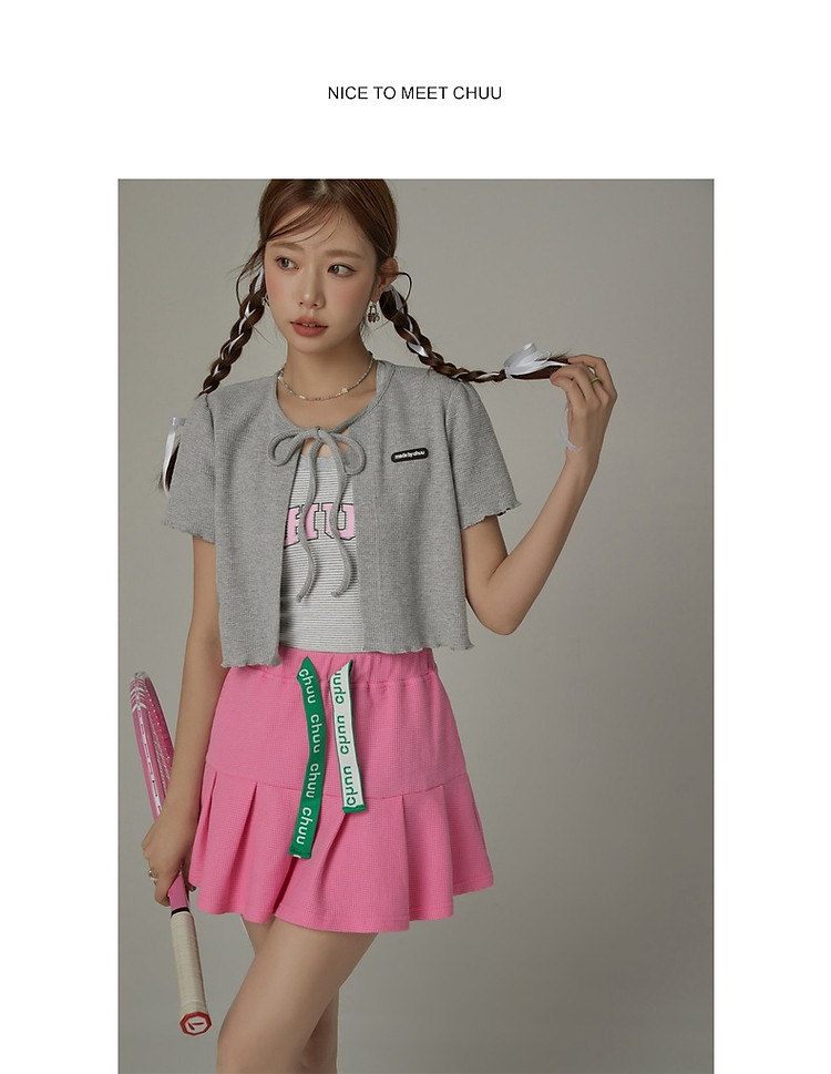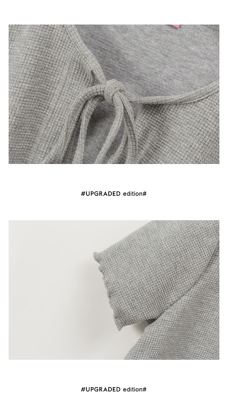 华夫格系带外套女士春夏小香风木耳边纯色短袖上衣 947347