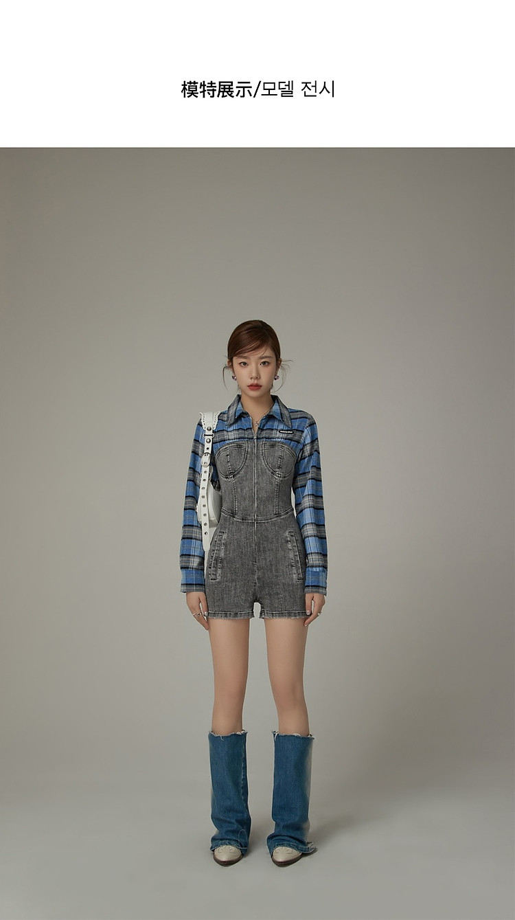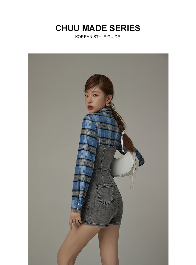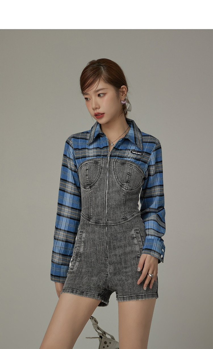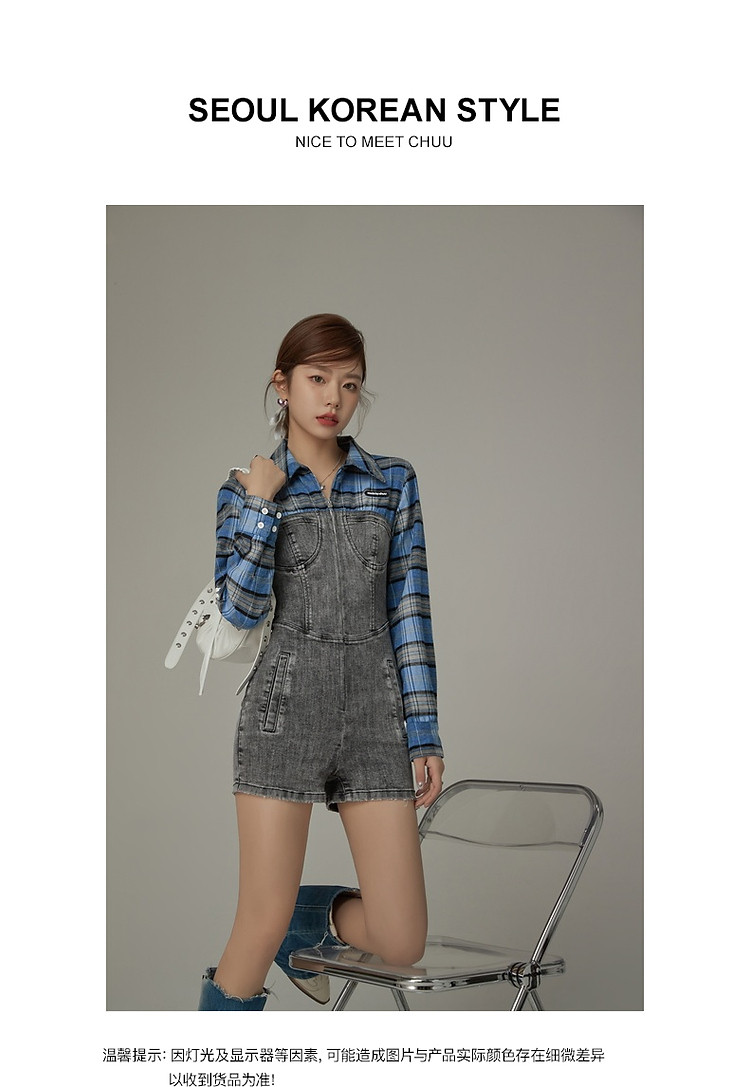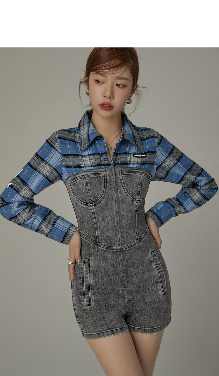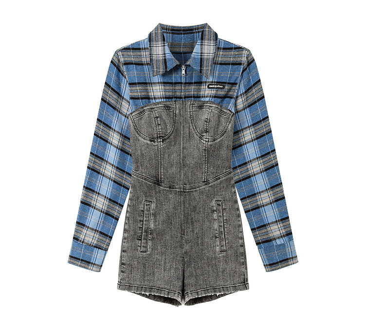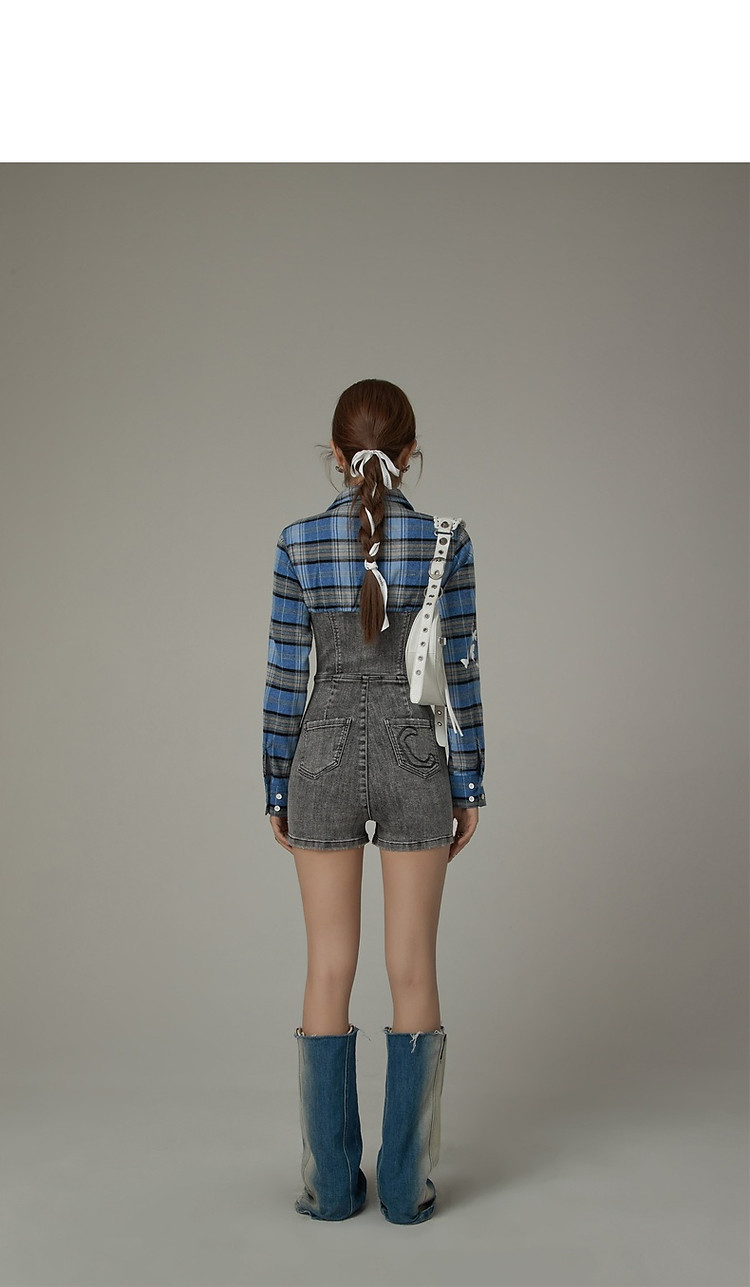 格子衬衫拼接连体裤女夏休闲个性设计感短裤 697555