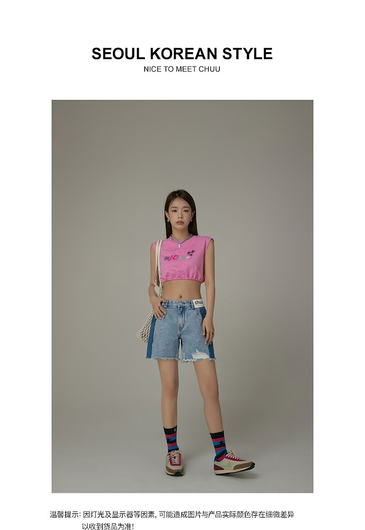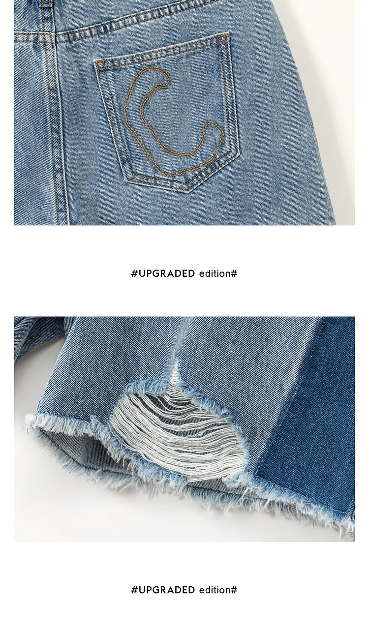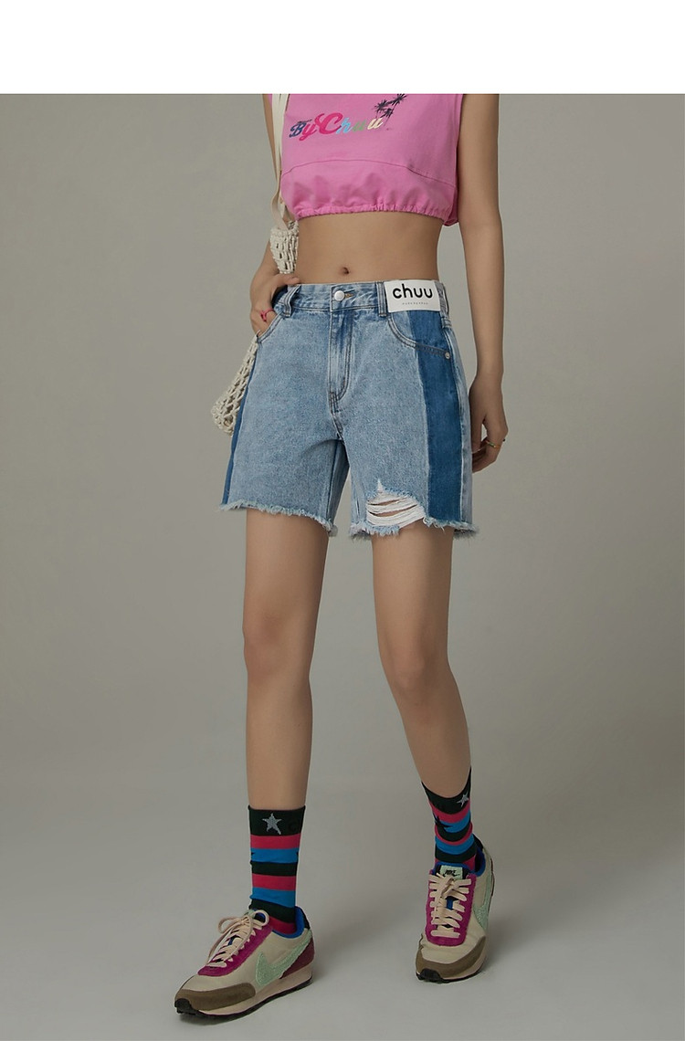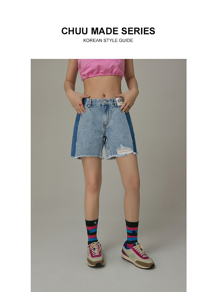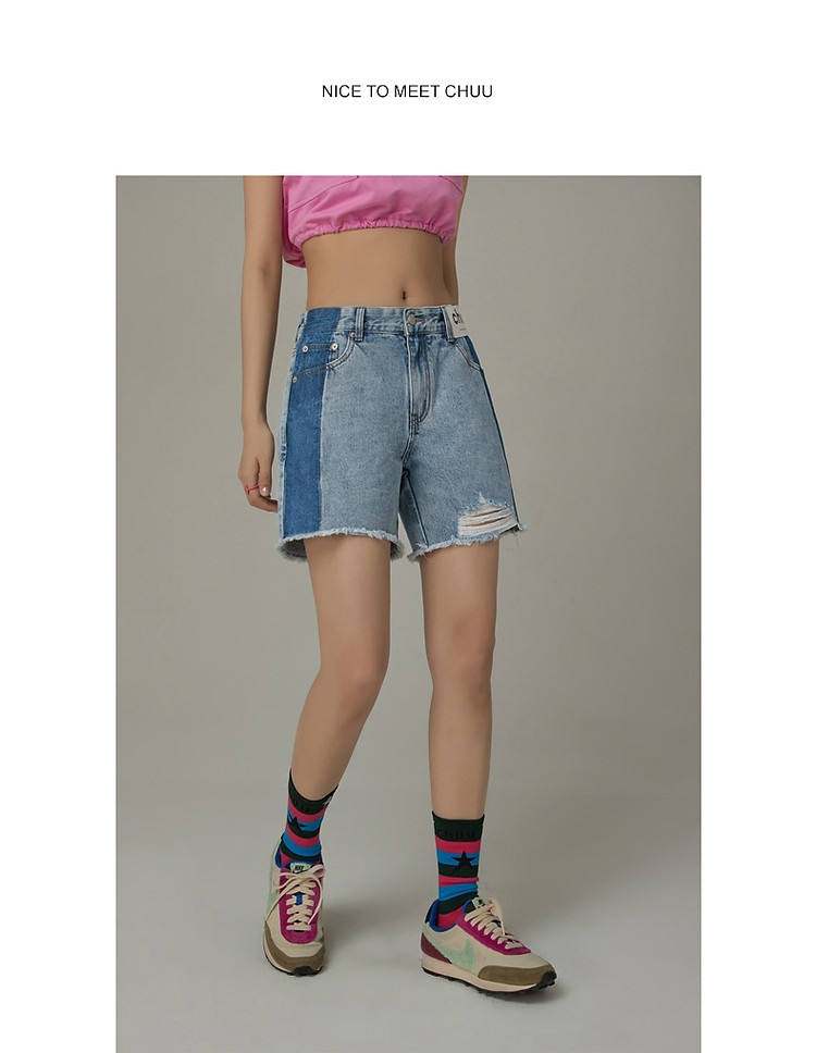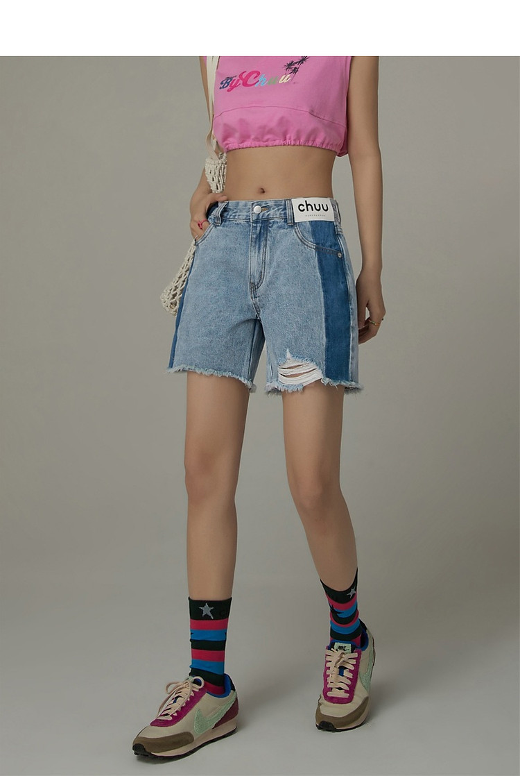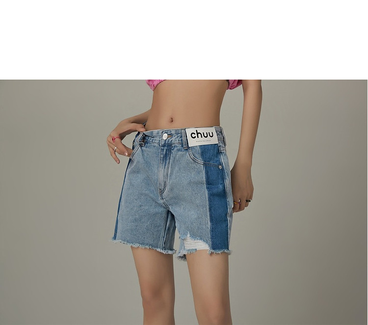 商品名称:水洗毛边牛仔裤女士夏拼色高腰设计洋气破洞短裤 761235