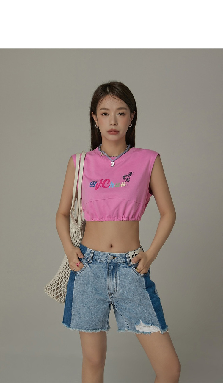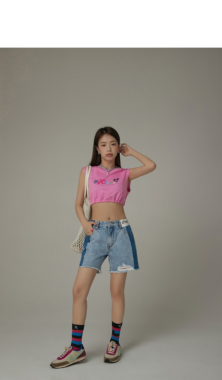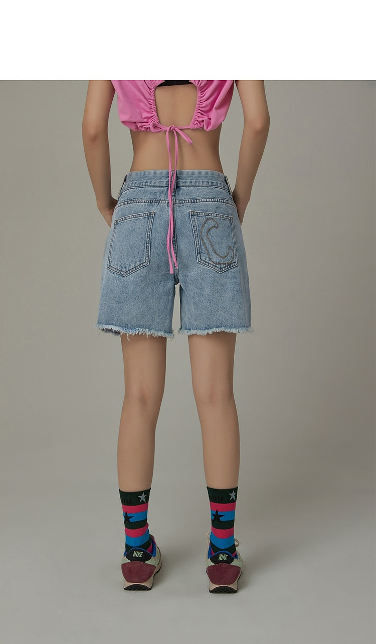 水洗毛边牛仔裤女士夏拼色高腰设计洋气破洞短裤 761235