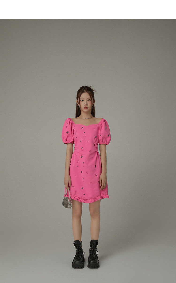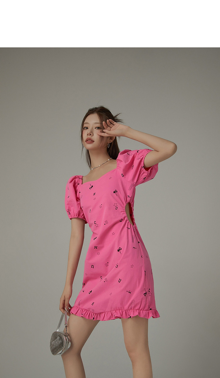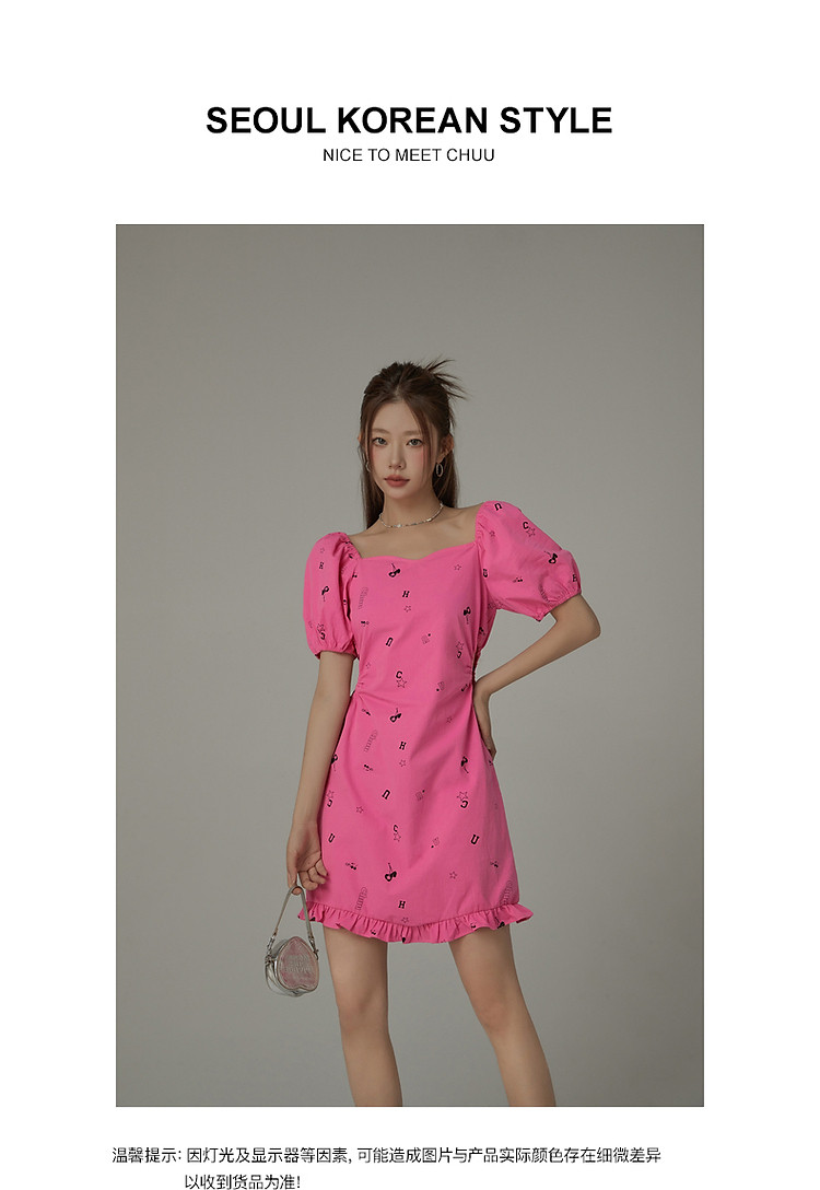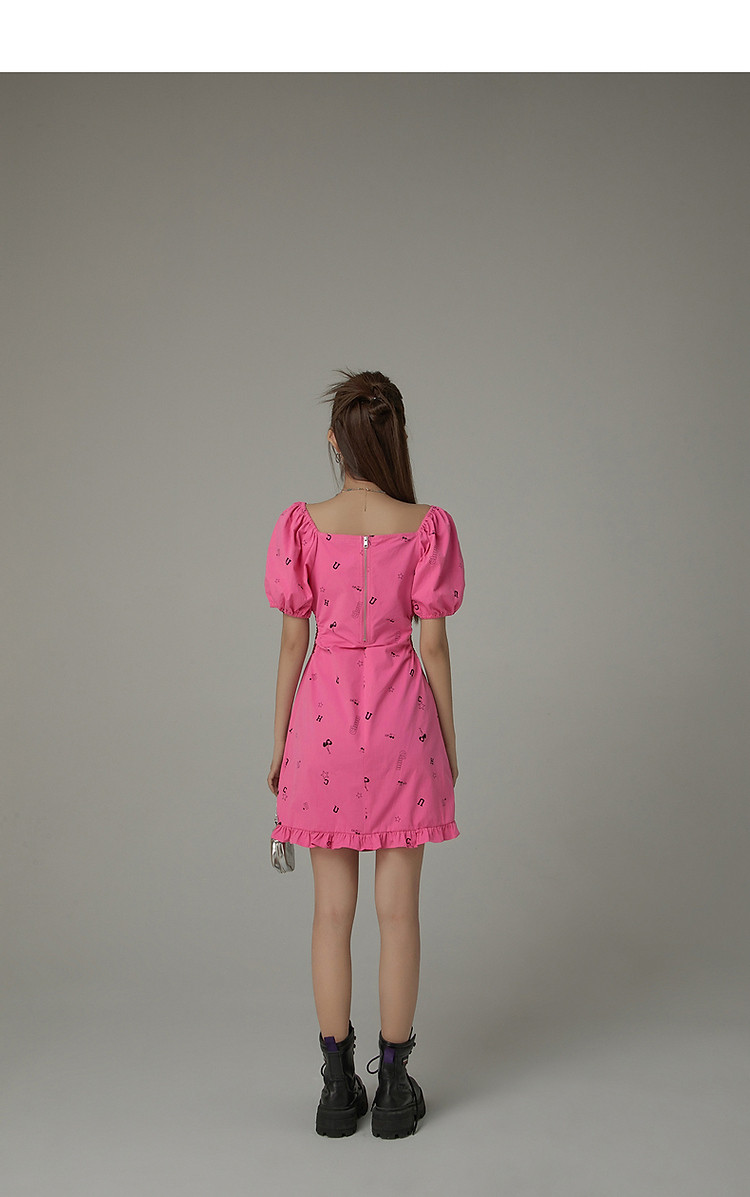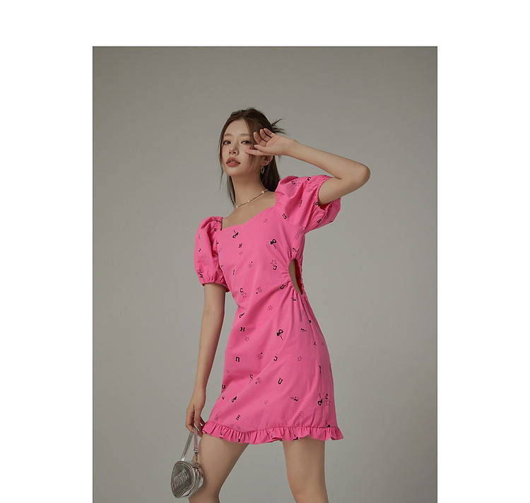 印花镂空连衣裙女夏小樱桃露腰字母泡泡袖短款裙子 211667