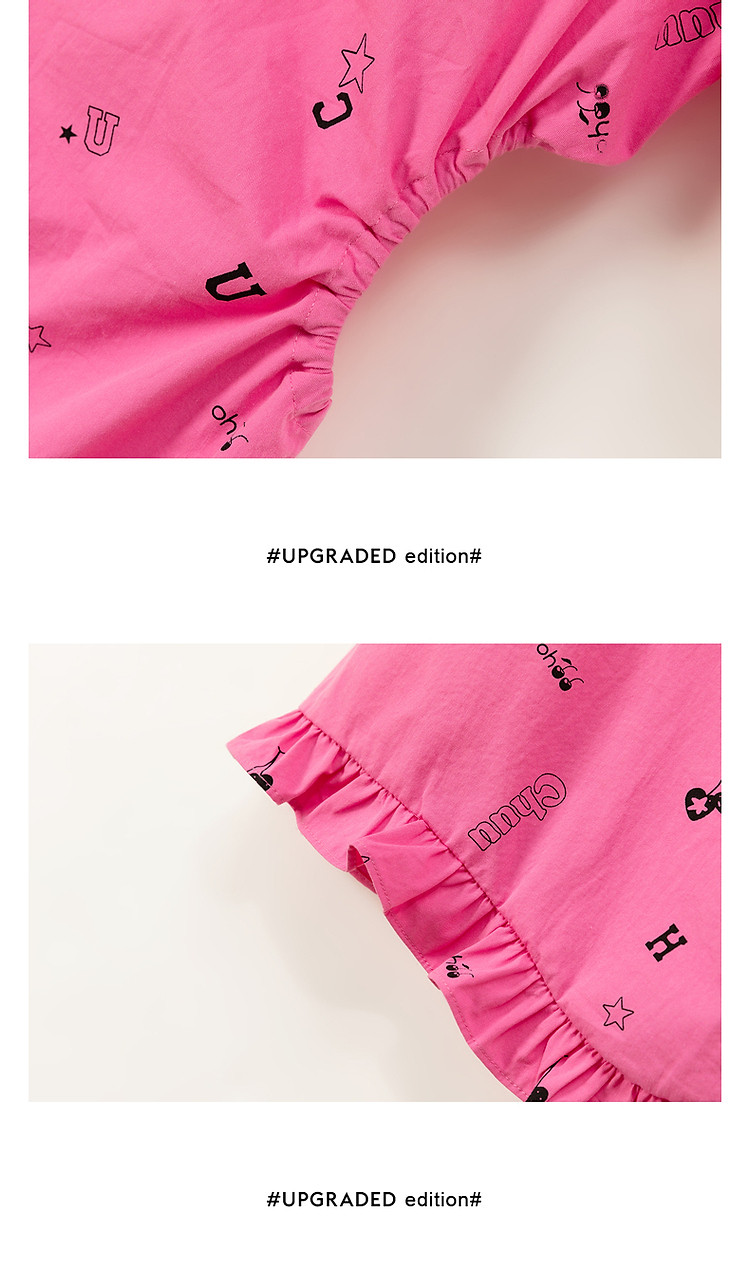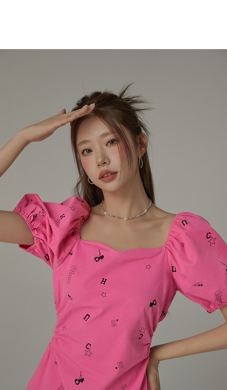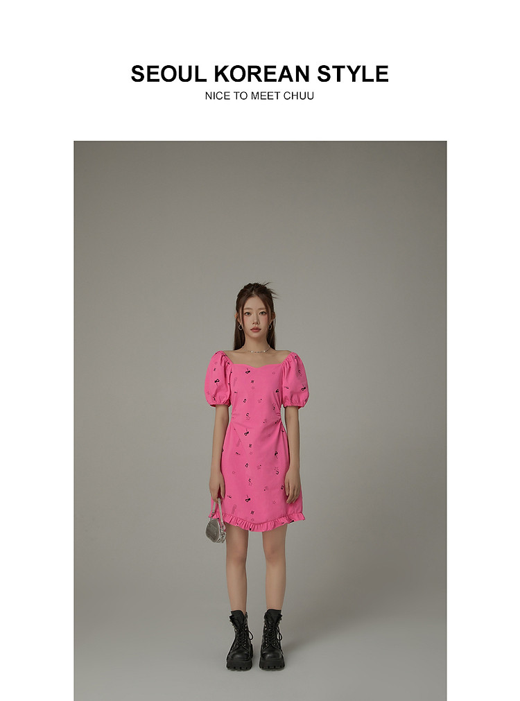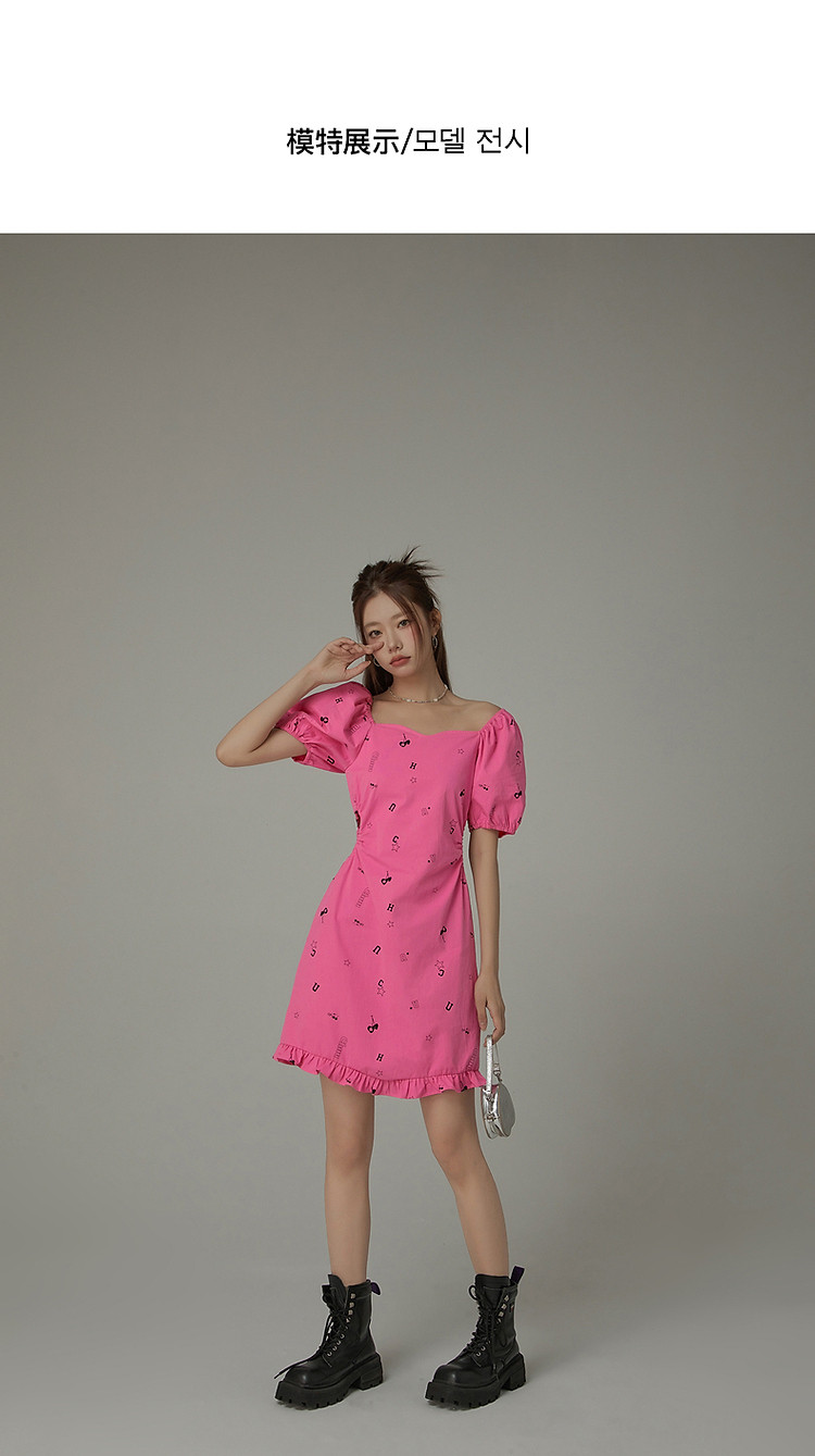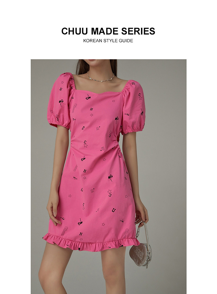 印花镂空连衣裙女夏小樱桃露腰字母泡泡袖短款裙子 211667