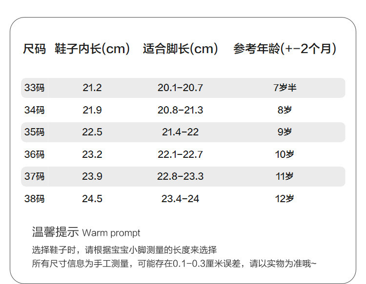 | 33码(脚长20.5/内长21.2) | 33 | 205 | 212 |