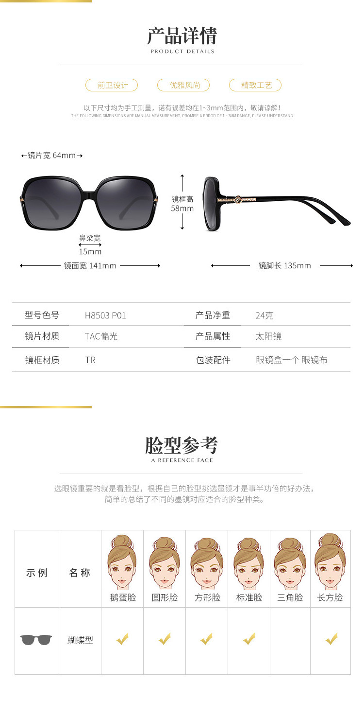 商品名称:海伦凯勒眼镜女士款时尚优雅气质墨镜黑框潮流偏光女士太阳镜 579035