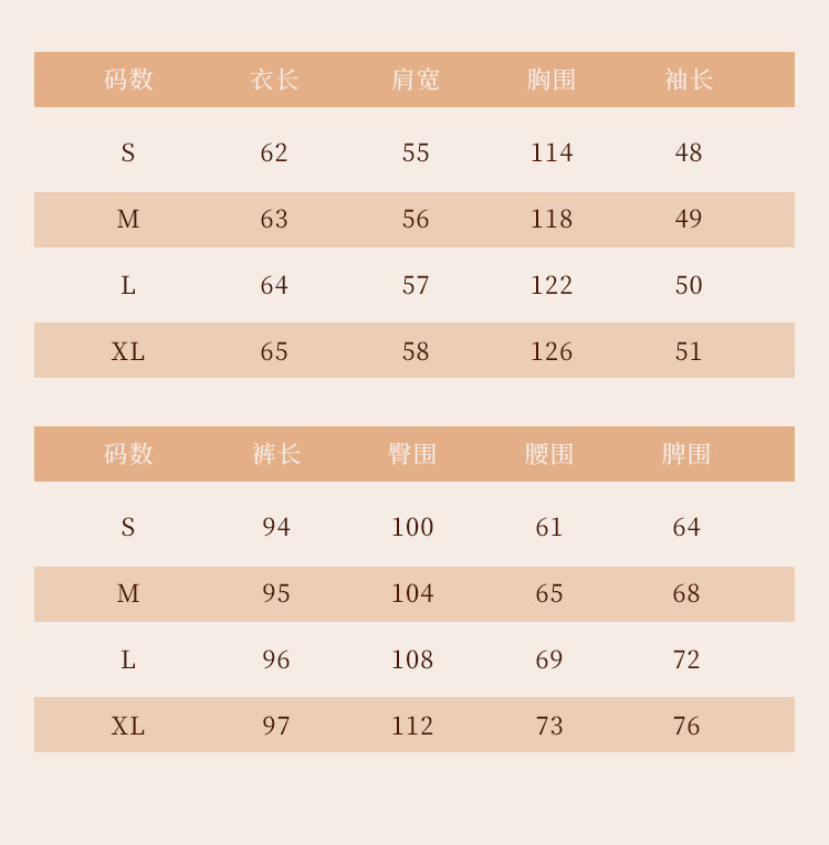 | 尺码 | 肩宽(cm) | 袖长(cm) | 上装号型 | 下装号型 | 衣长(cm) | 腰围(cm) | 裤长(cm) | 臀围(cm) | 胸围(cm) | 号型 |