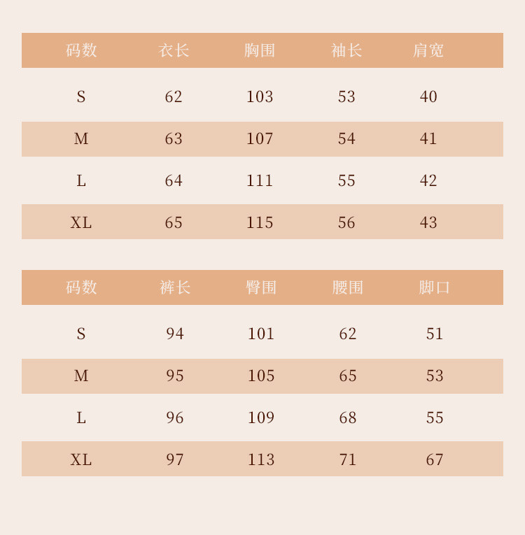 | 尺码 | 肩宽(cm) | 袖长(cm) | 上装号型 | 下装号型 | 衣长(cm) | 腰围(cm) | 裤长(cm) | 臀围(cm) | 胸围(cm) | 号型 |
