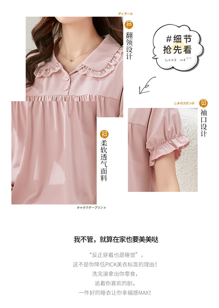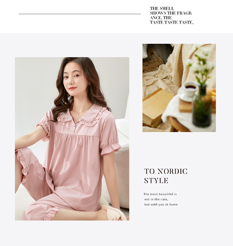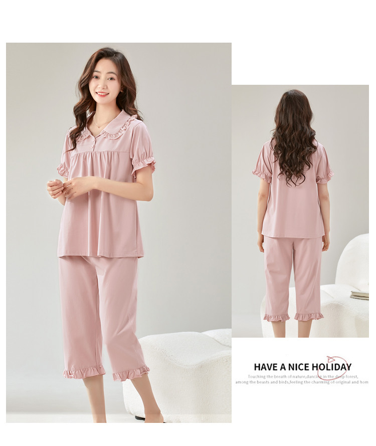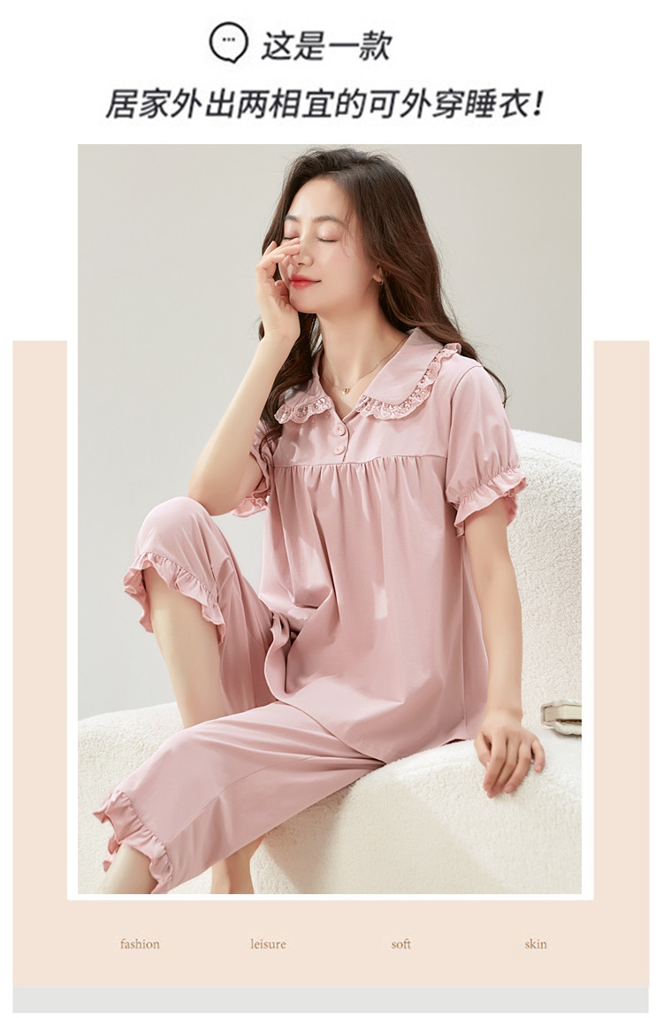 商品名称:春夏短袖7分裤套装棉莫混纺亲肤柔软翻领女士睡衣家居服可外穿 609054