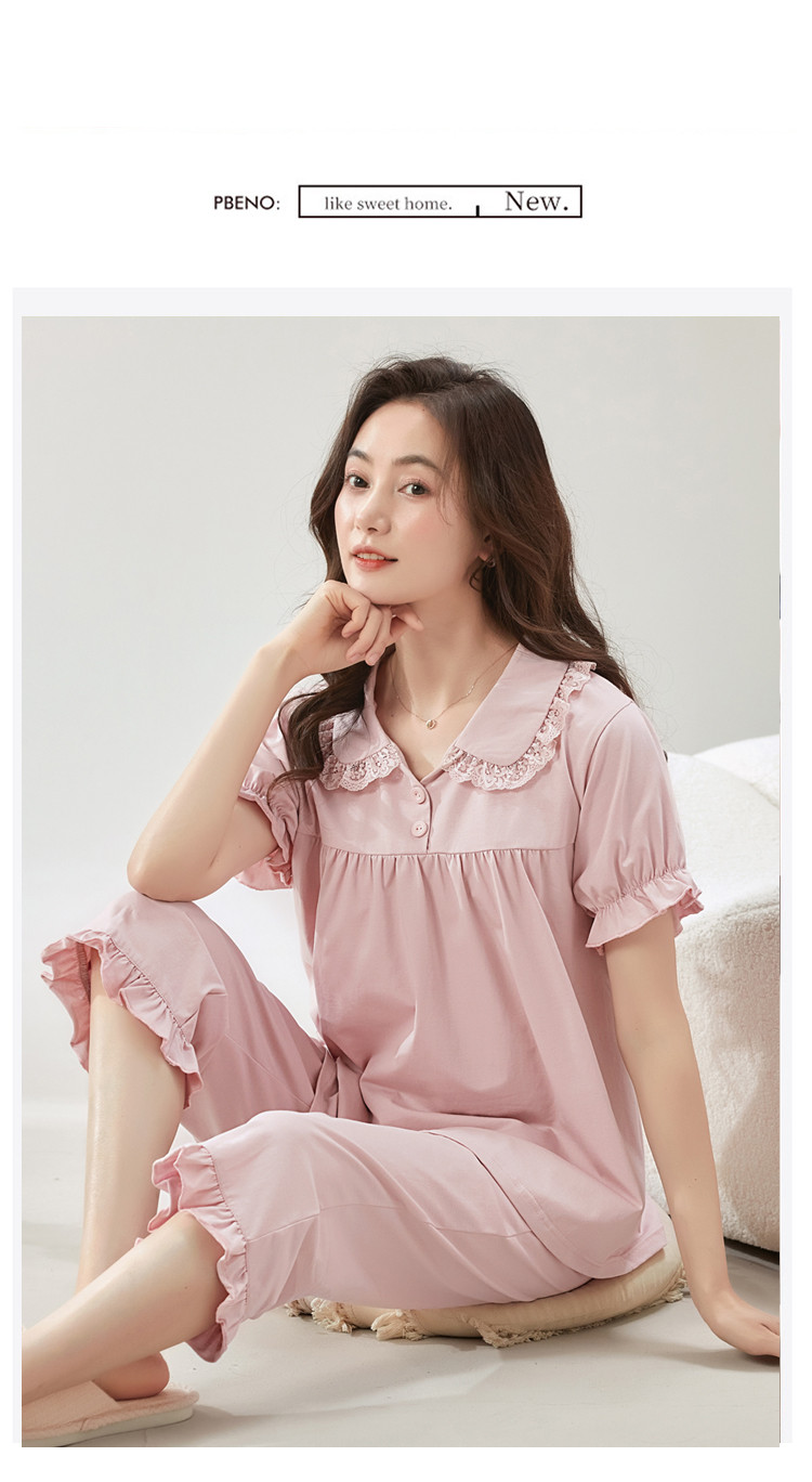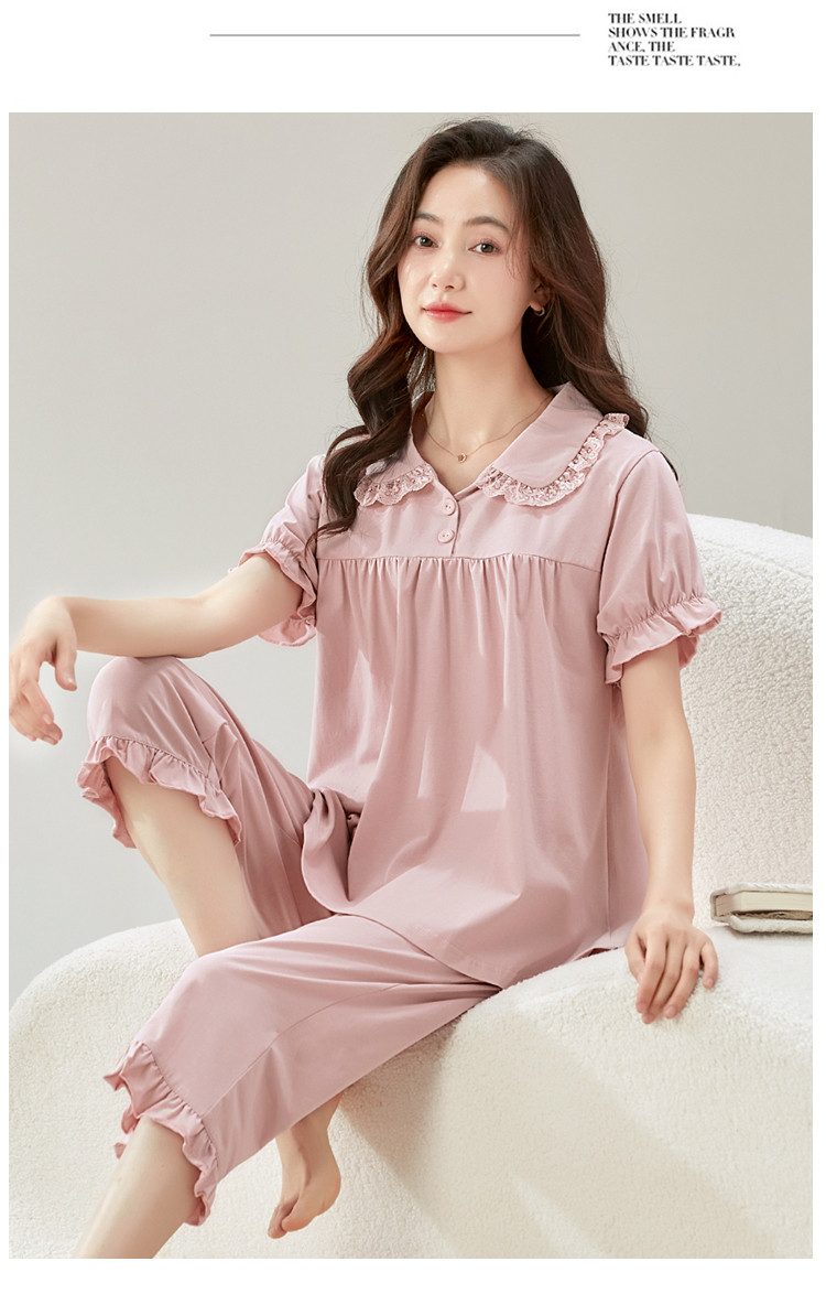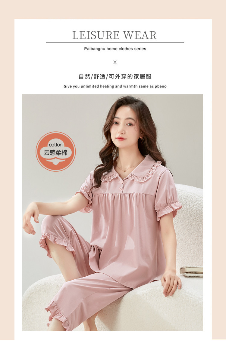 春夏短袖7分裤套装棉莫混纺亲肤柔软翻领女士睡衣家居服可外穿 609054