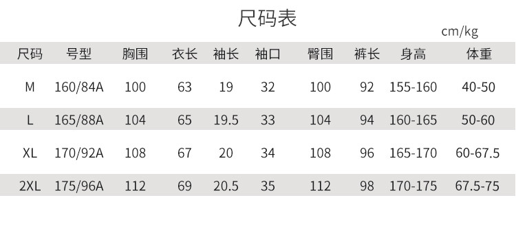 尺码 袖长(cm) 上装号型 下装号型 衣长(cm) 身高(cm) 裤长(cm) 体重(kg) 臀围(cm) 胸围(cm) 号型