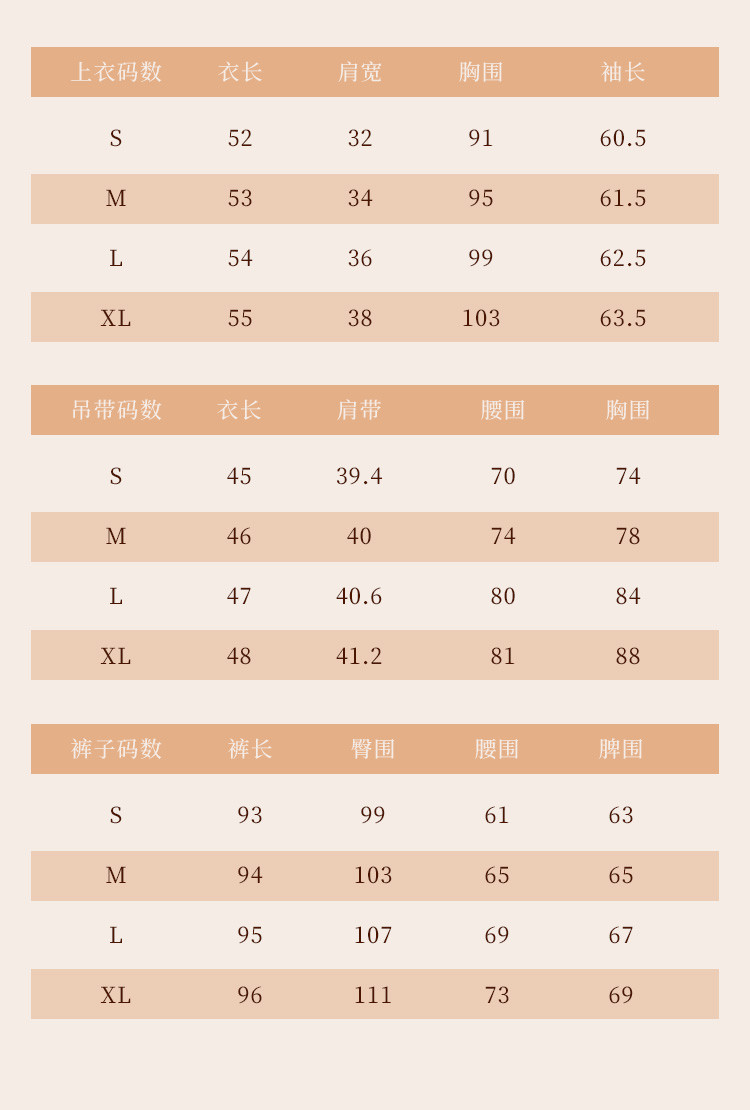 | 尺码 | 肩宽(cm) | 袖长(cm) | 上装号型 | 下装号型 | 衣长(cm) | 腰围(cm) | 裤长(cm) | 臀围(cm) | 胸围(cm) | 号型 |