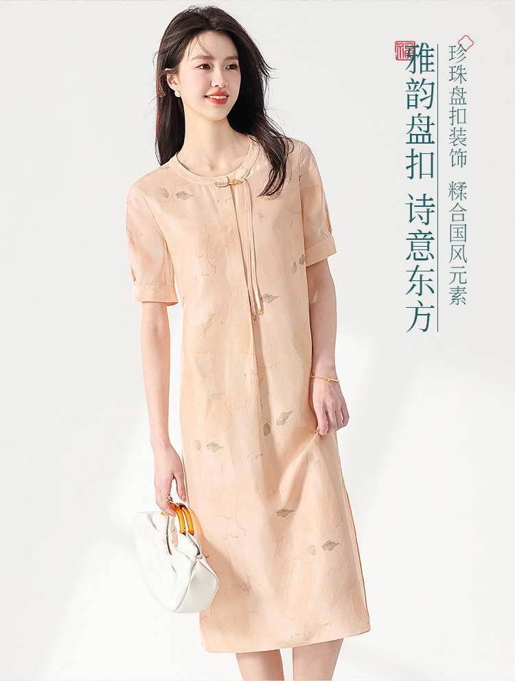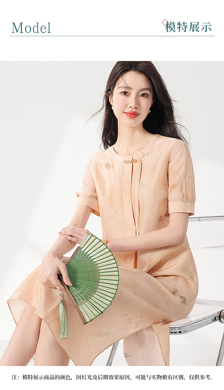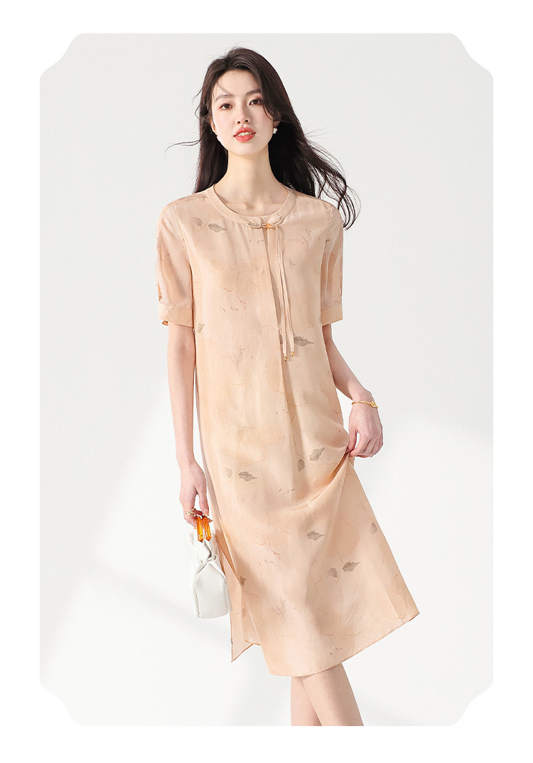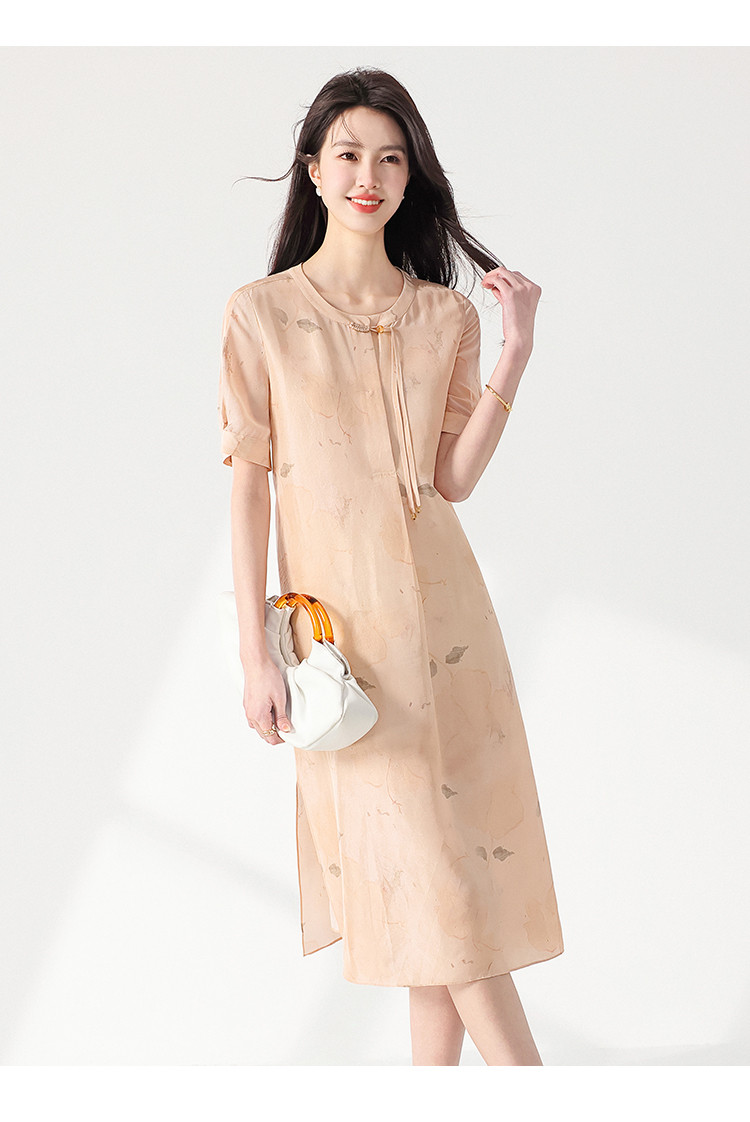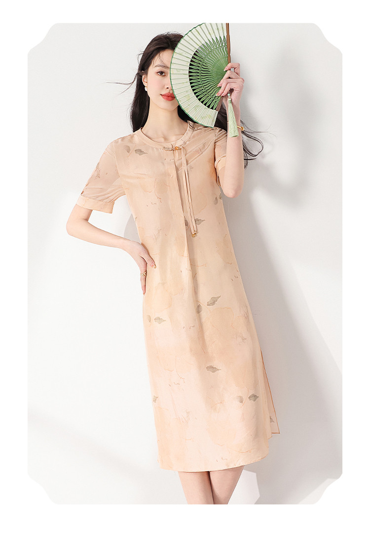 商品名称:100%桑蚕丝新中式短袖印花国风中长款真丝连衣裙女妈妈装裙子 708371