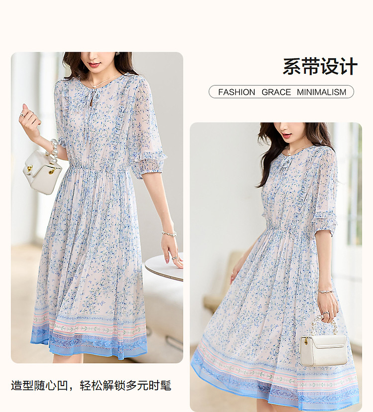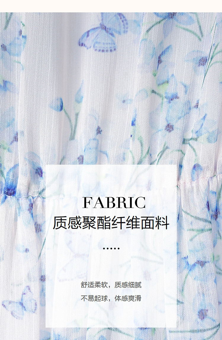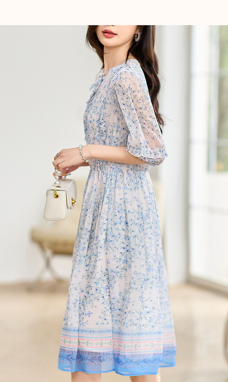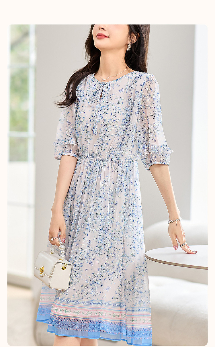 商品名称:【南法阳光假日】夏通勤定位印花大摆系带花边袖淑女连衣裙 513345
