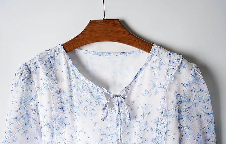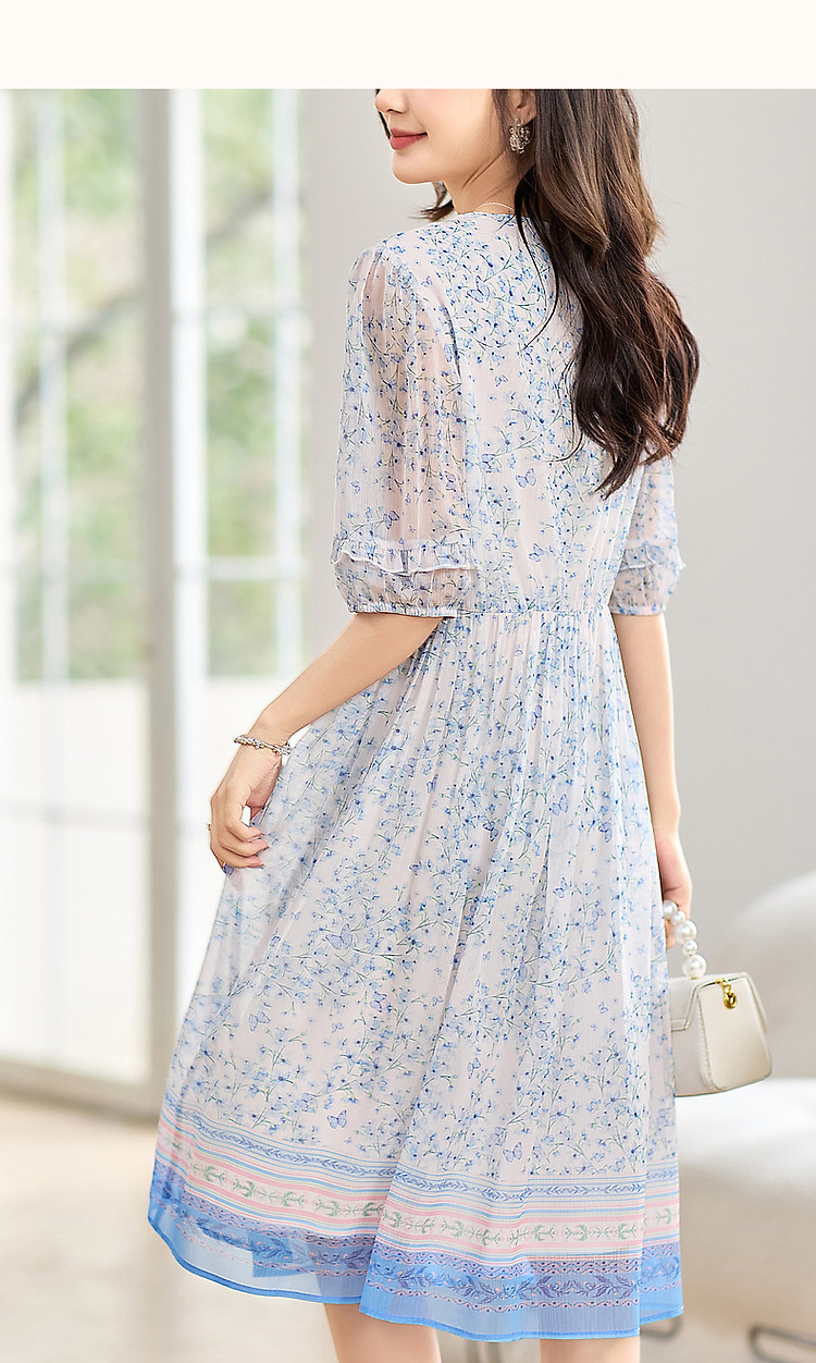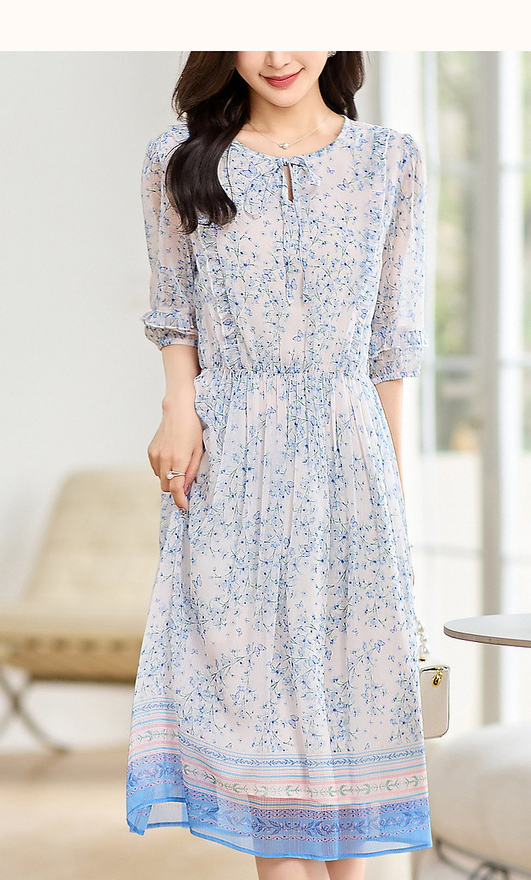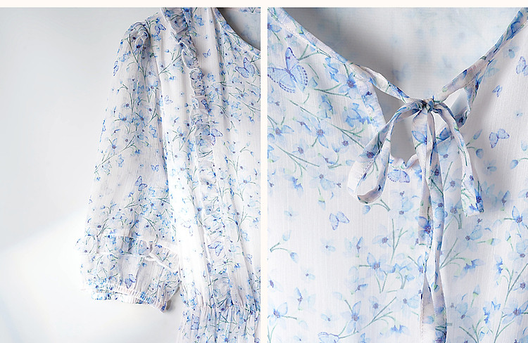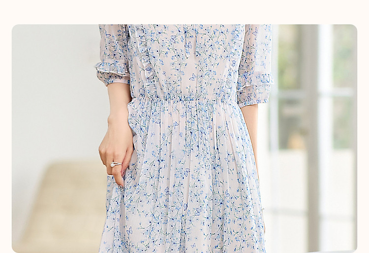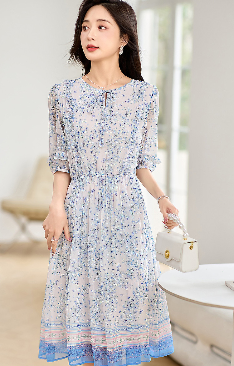 商品名称:【南法阳光假日】夏通勤定位印花大摆系带花边袖淑女连衣裙 513345
