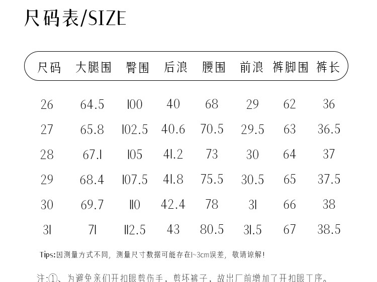 | 尺码 | 大腿围(cm) | 后浪(cm) | 裤脚围(cm) | 腰围(cm) | 裤长(cm) | 前浪(cm) | 臀围(cm) | 号型 |
