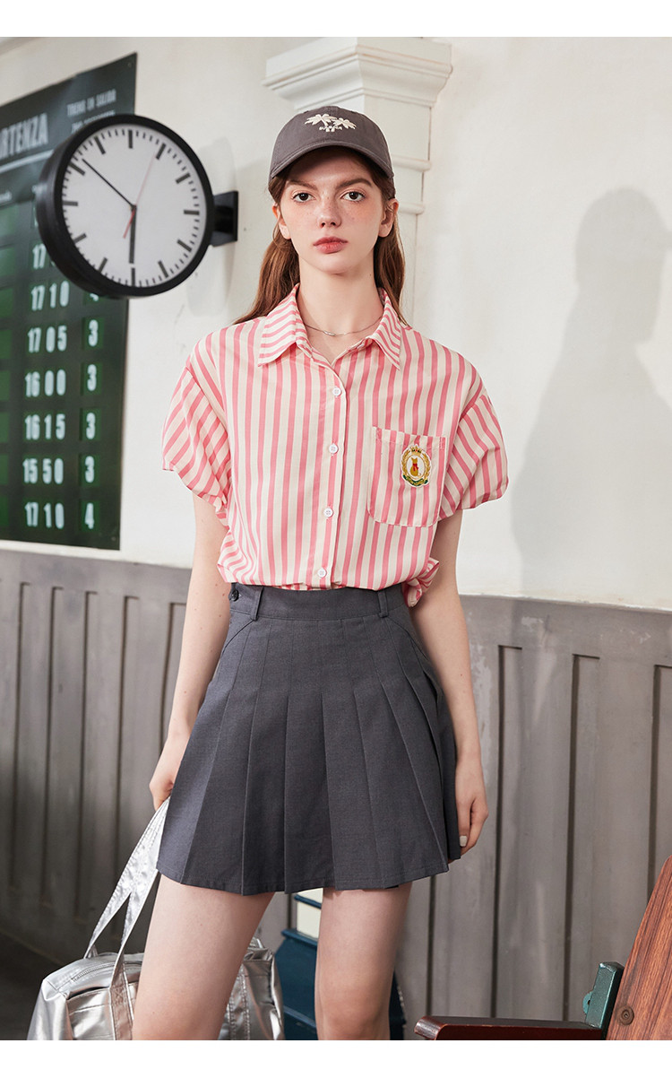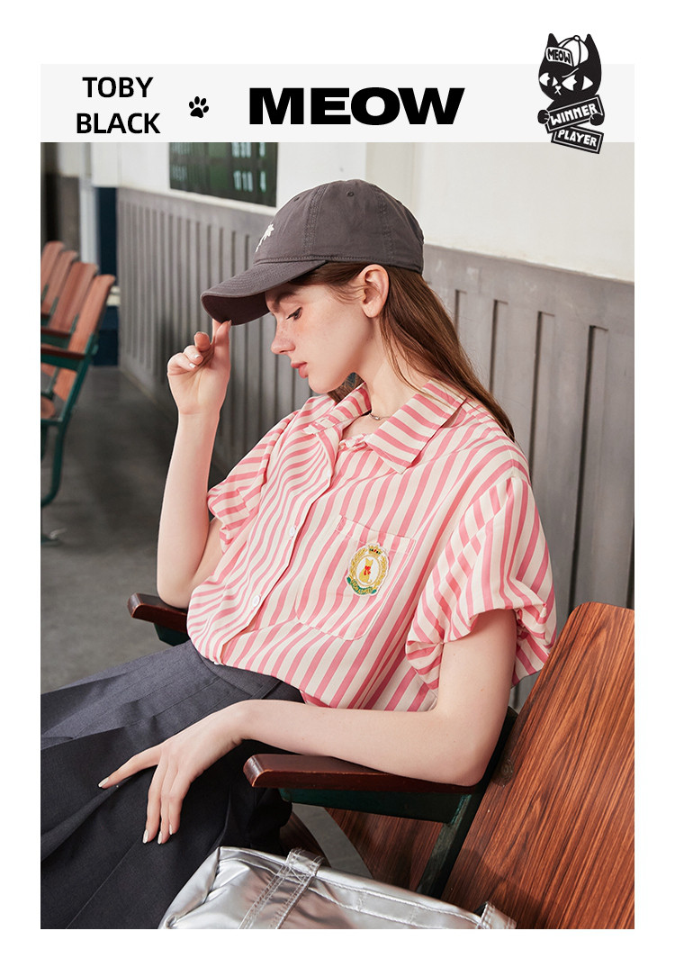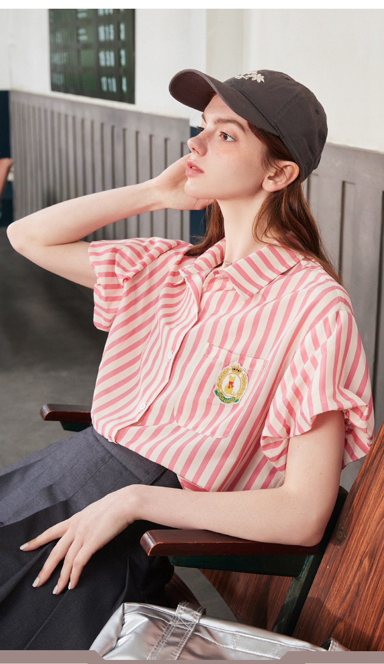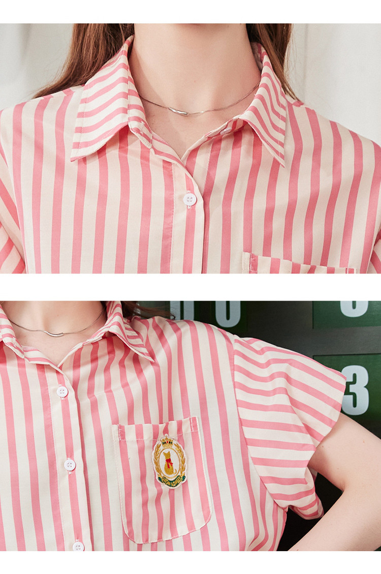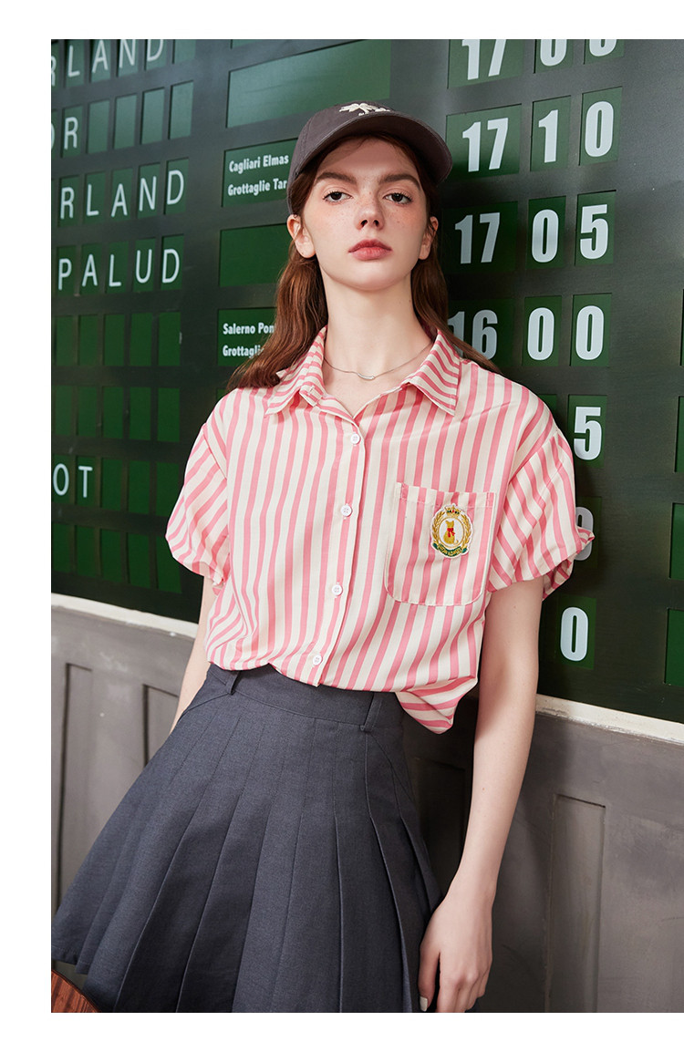 【减龄学院风】条纹设计泡泡袖上衣夏季宽松休闲女式衬衫 385885