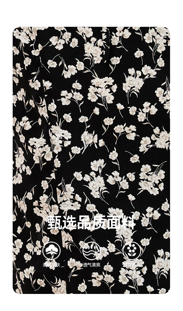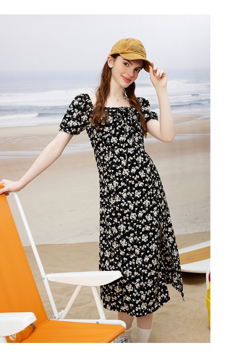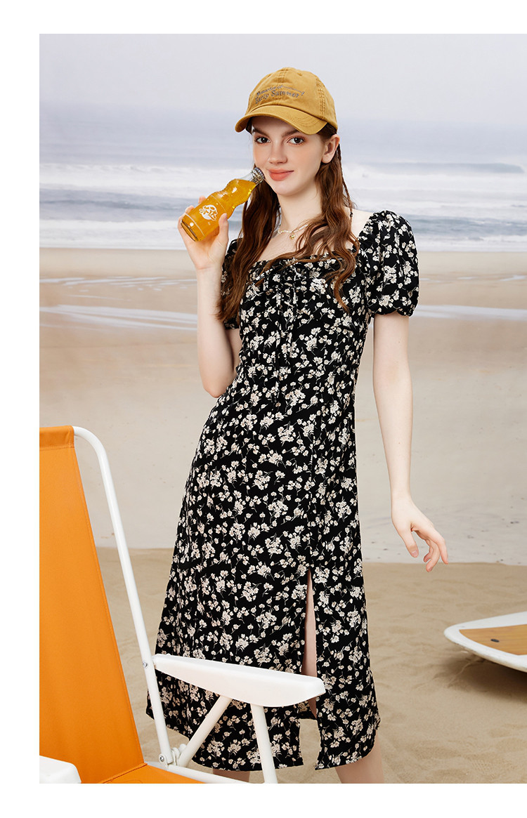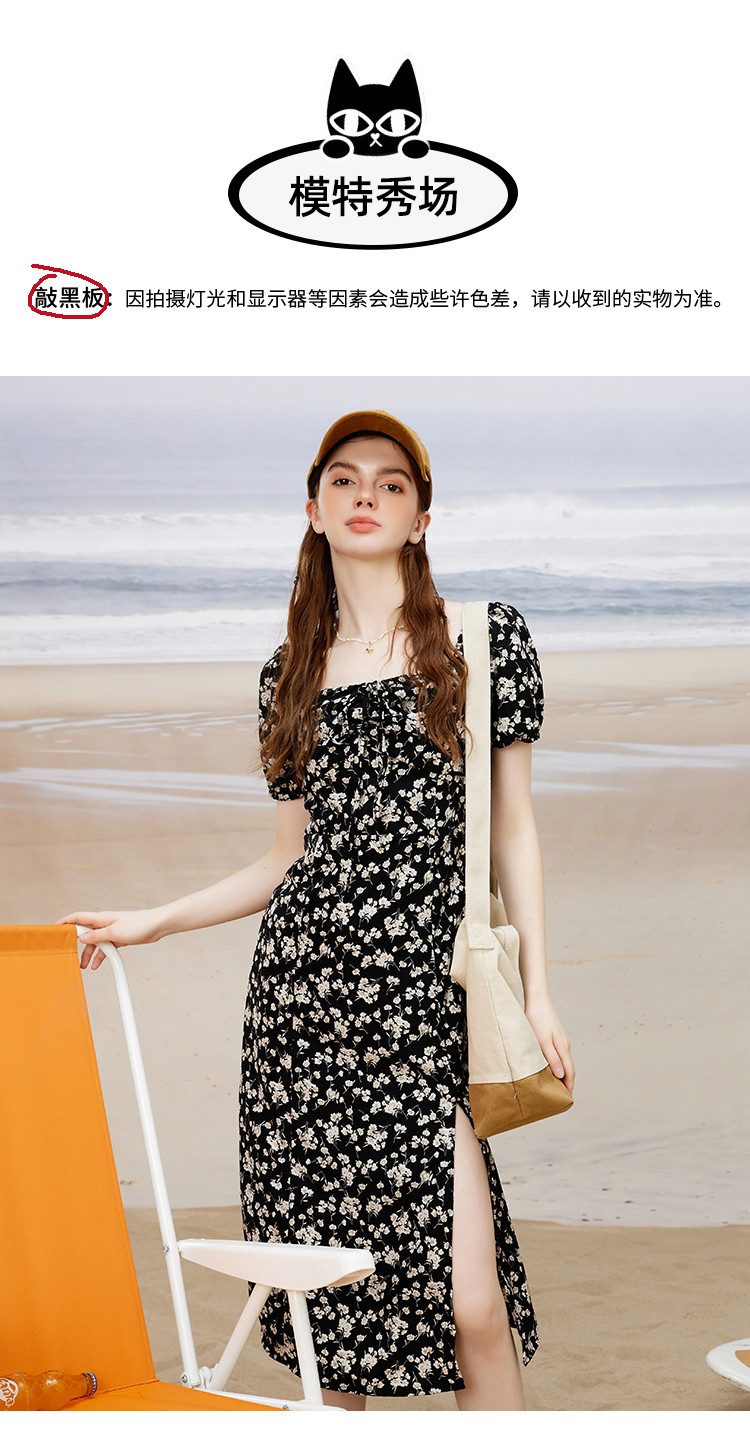 商品名称:黑色碎花显瘦泡泡袖法式方领开叉夏季气质连衣裙 238365