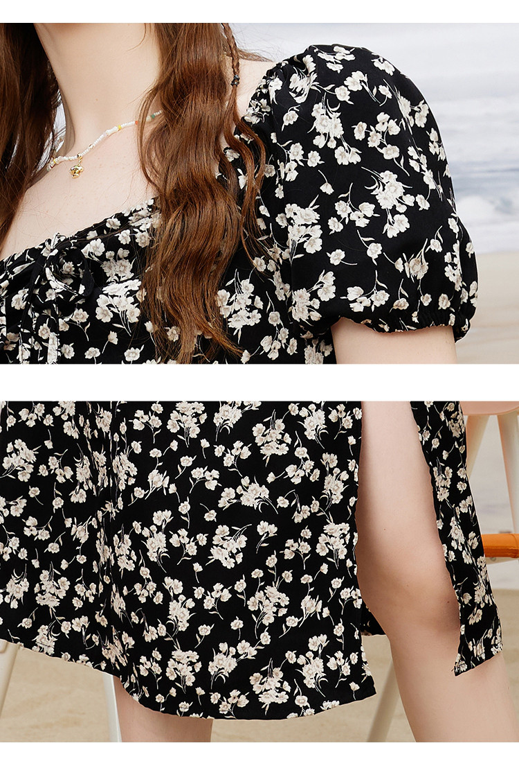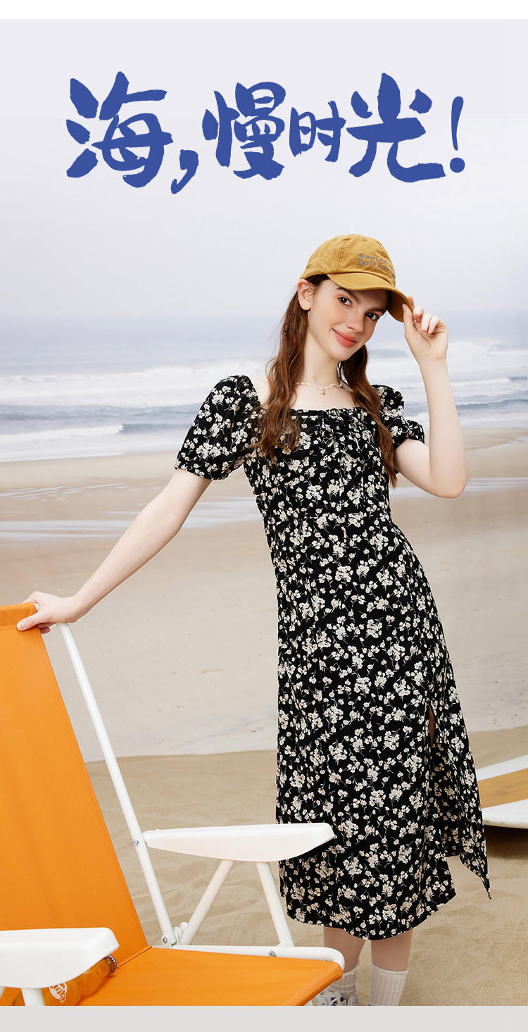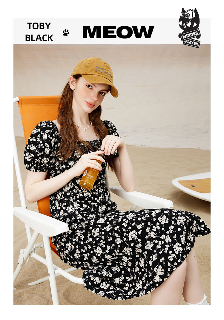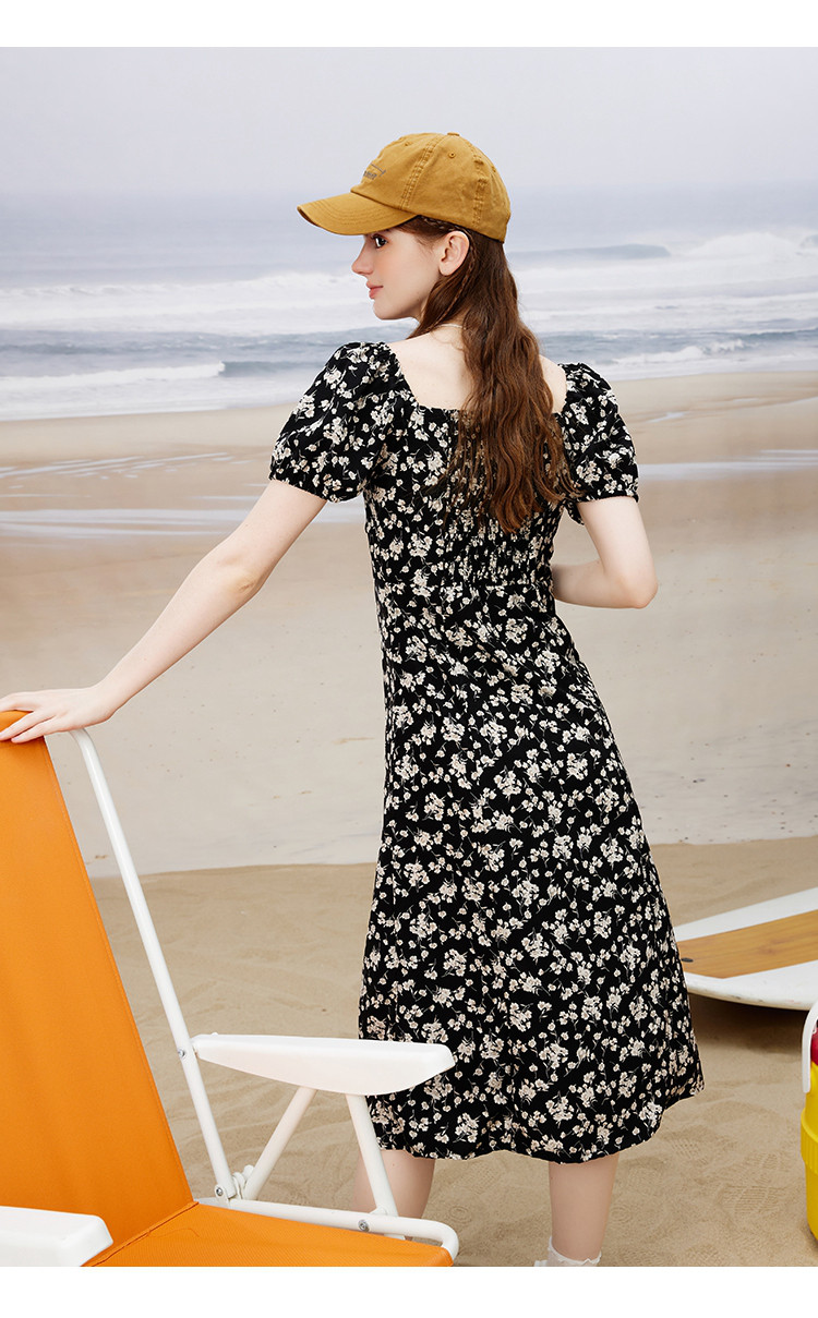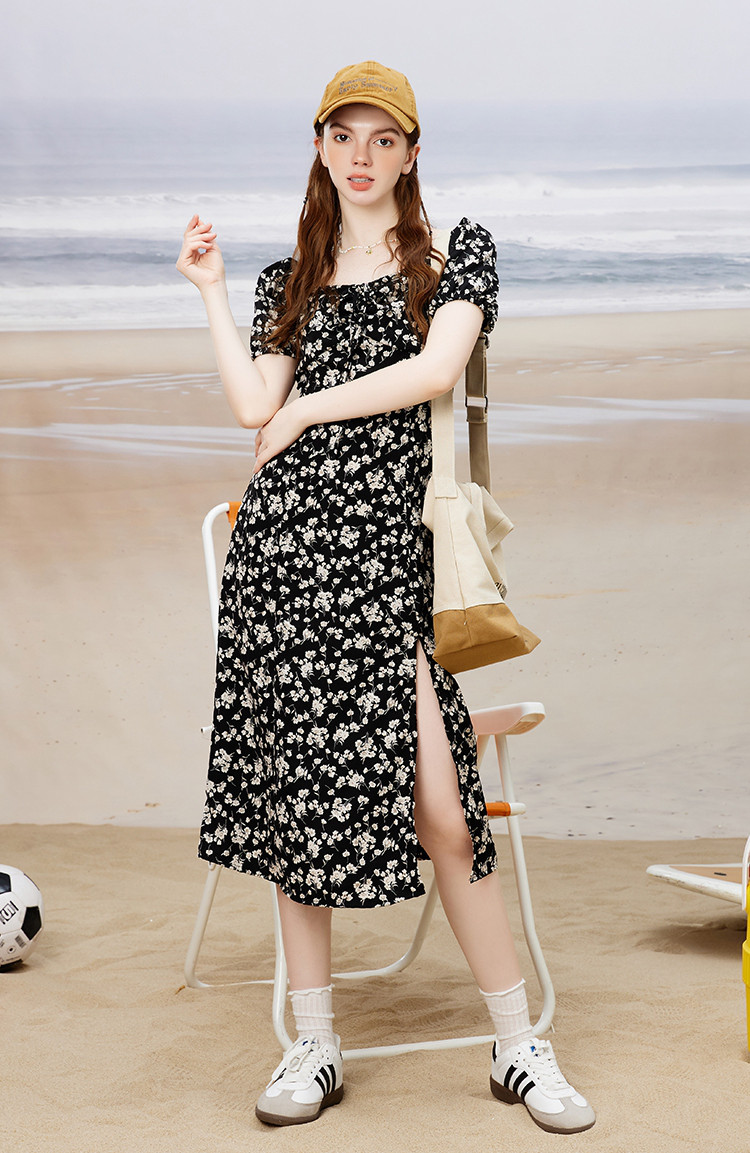 商品名称:黑色碎花显瘦泡泡袖法式方领开叉夏季气质连衣裙 238365