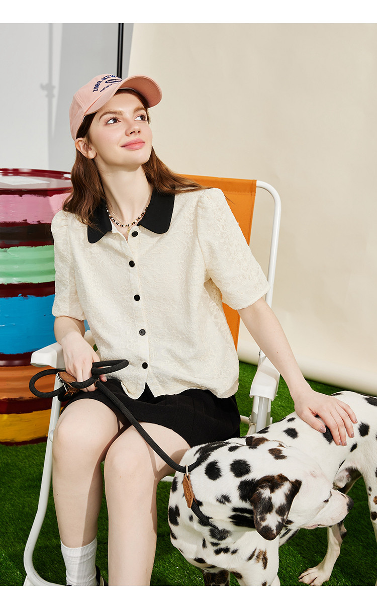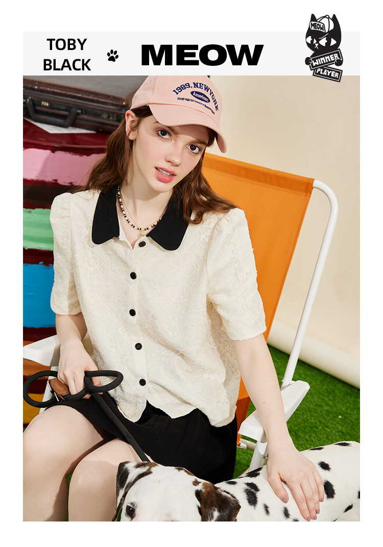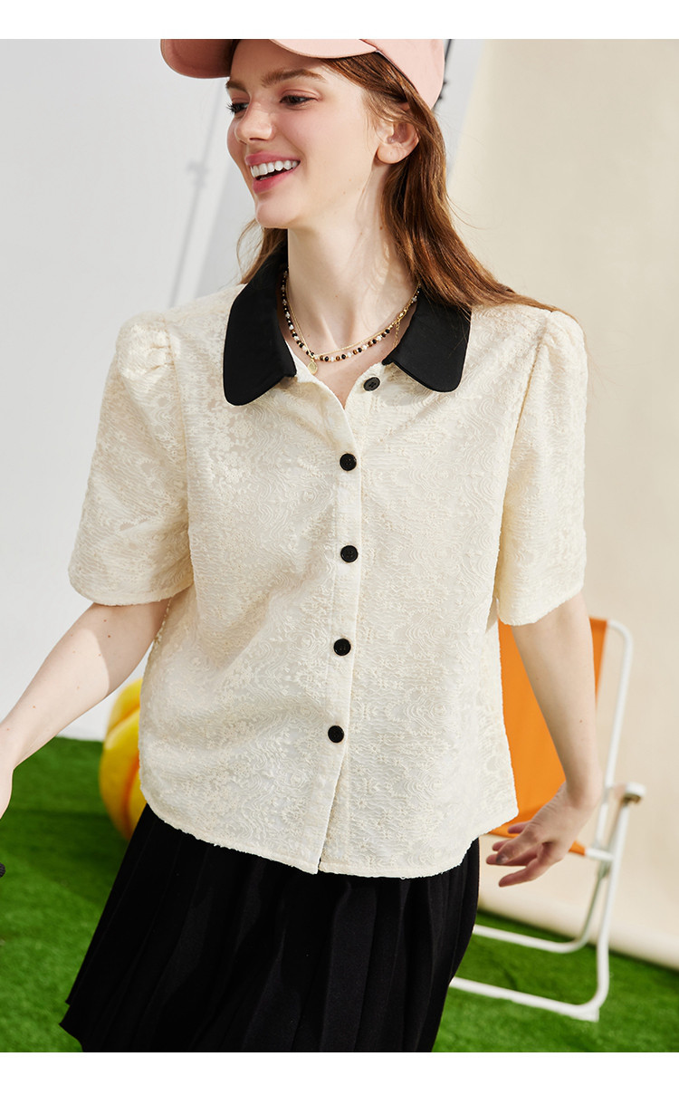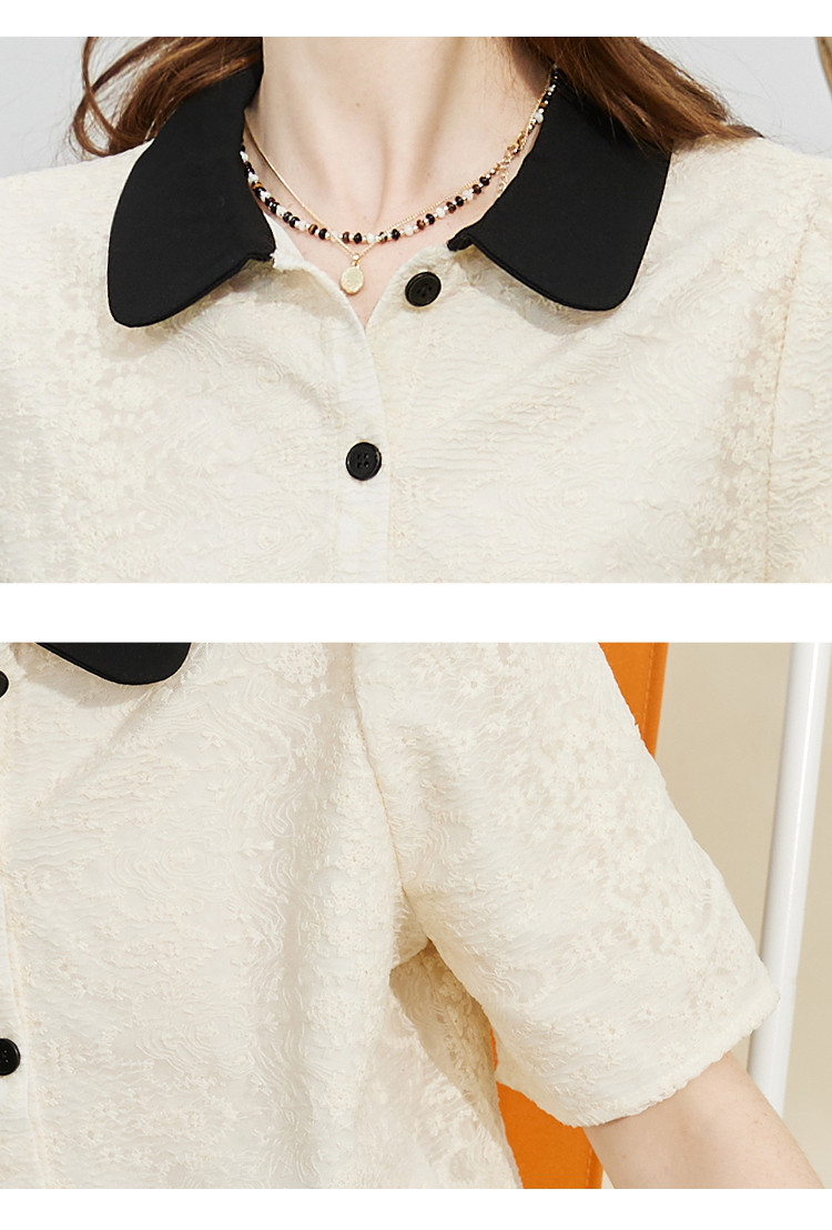 商品名称:蕾丝拼接小香风正肩小衫夏季撞色翻领气质女式衬衫 886237