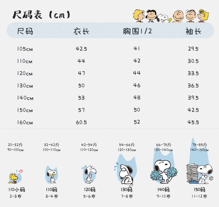 | 尺码 | 衣长(cm) | 肩宽(cm) | 身高(cm) | 袖长(cm) | 适合年龄 | 胸围(cm) | 号型 |