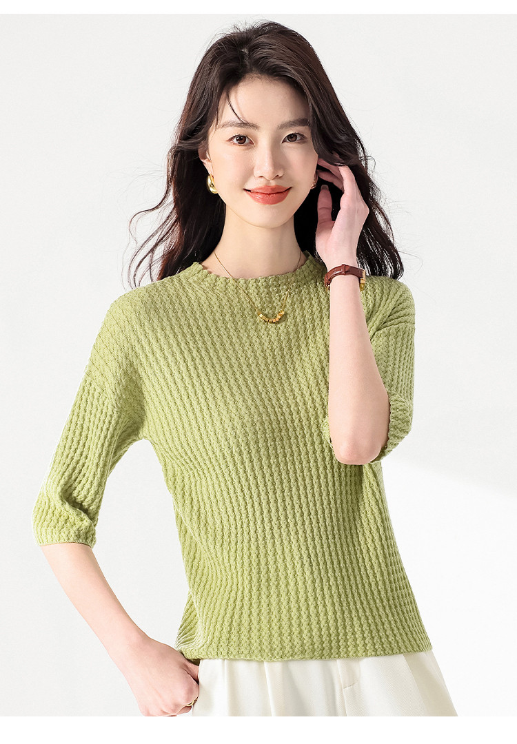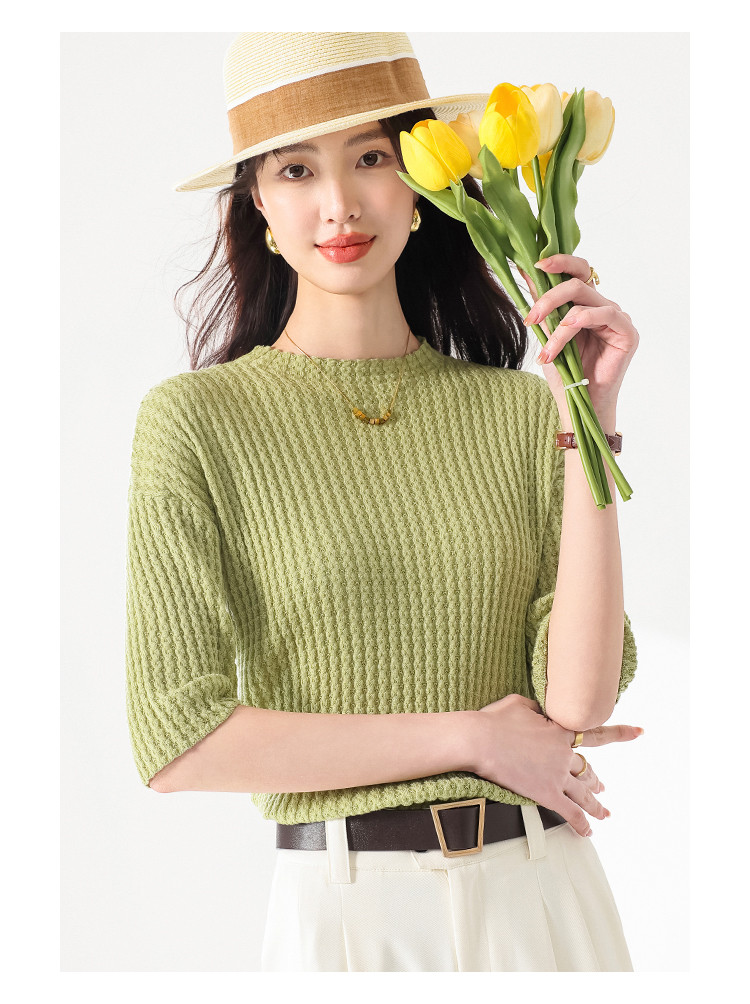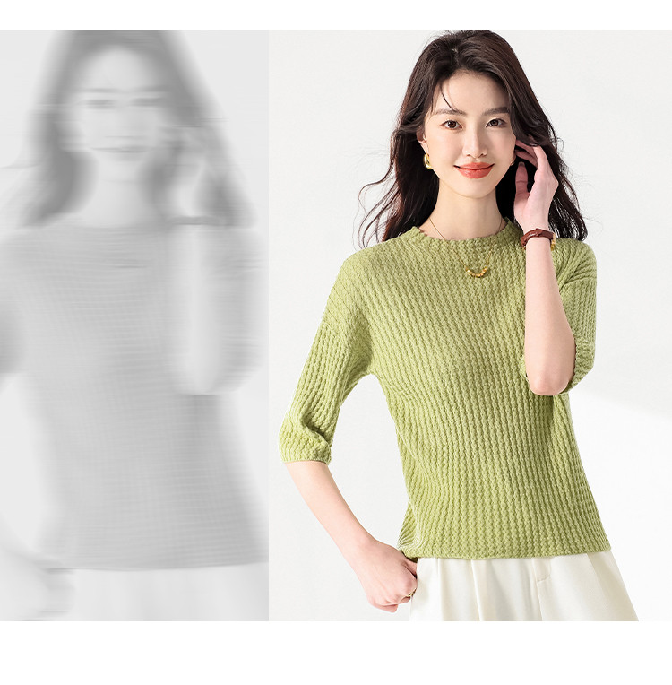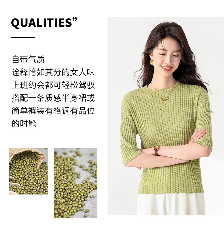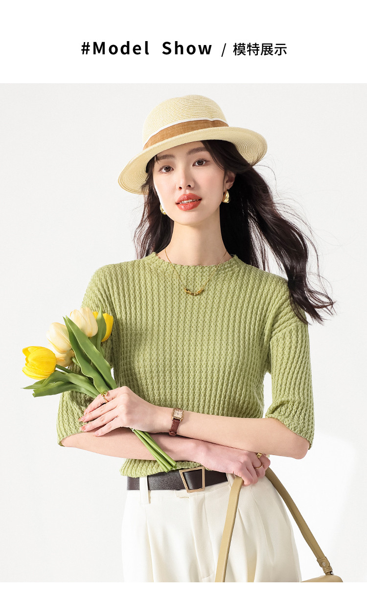 商品名称:轻薄透气纯色泡泡提花圆领含桑蚕丝针织衫女夏打底衫短袖T恤 357779