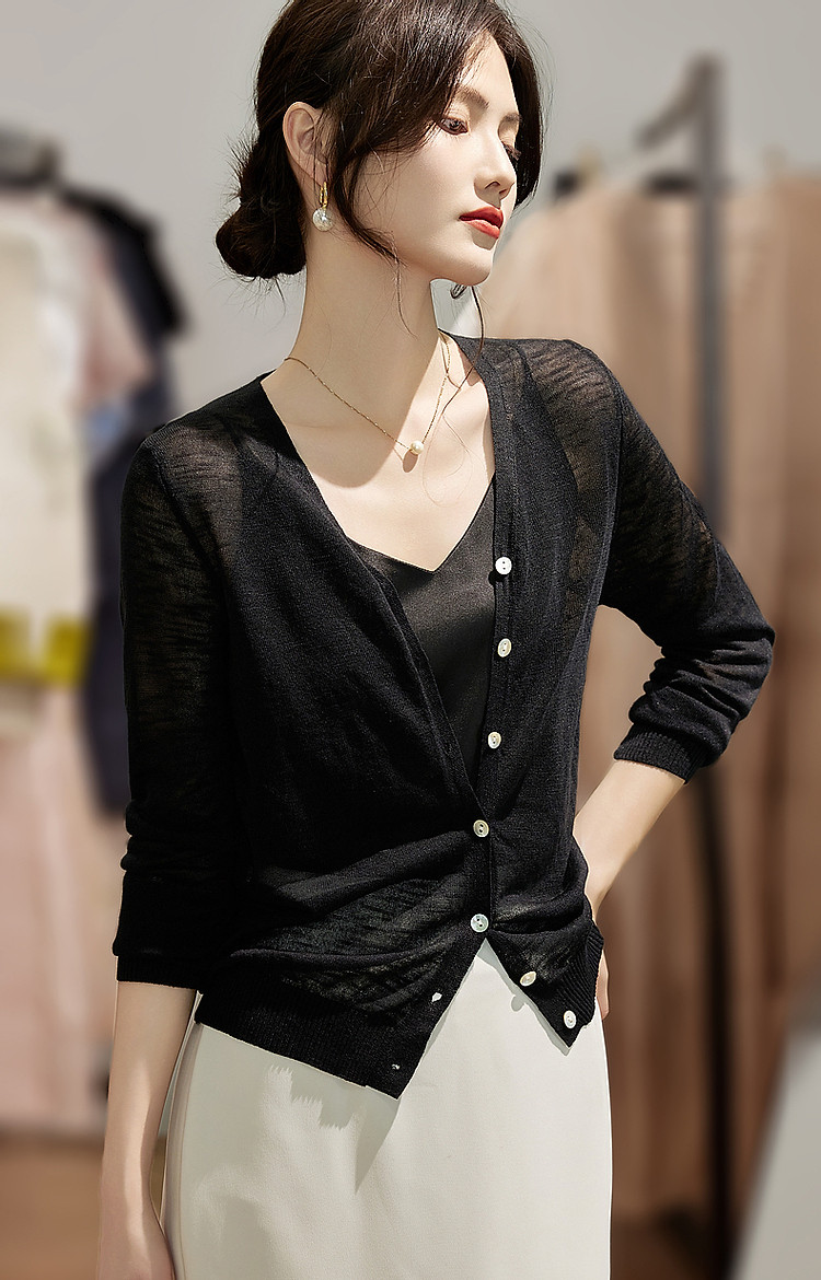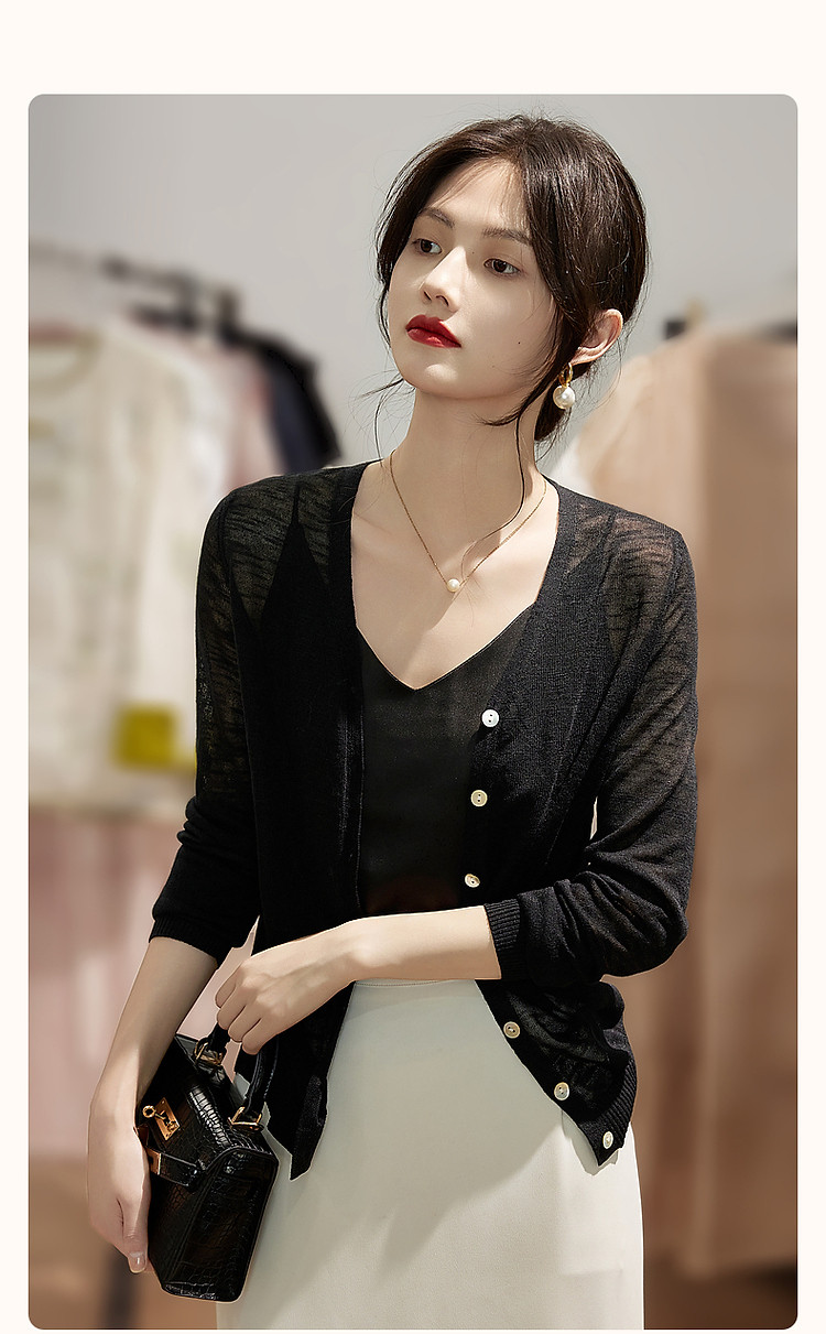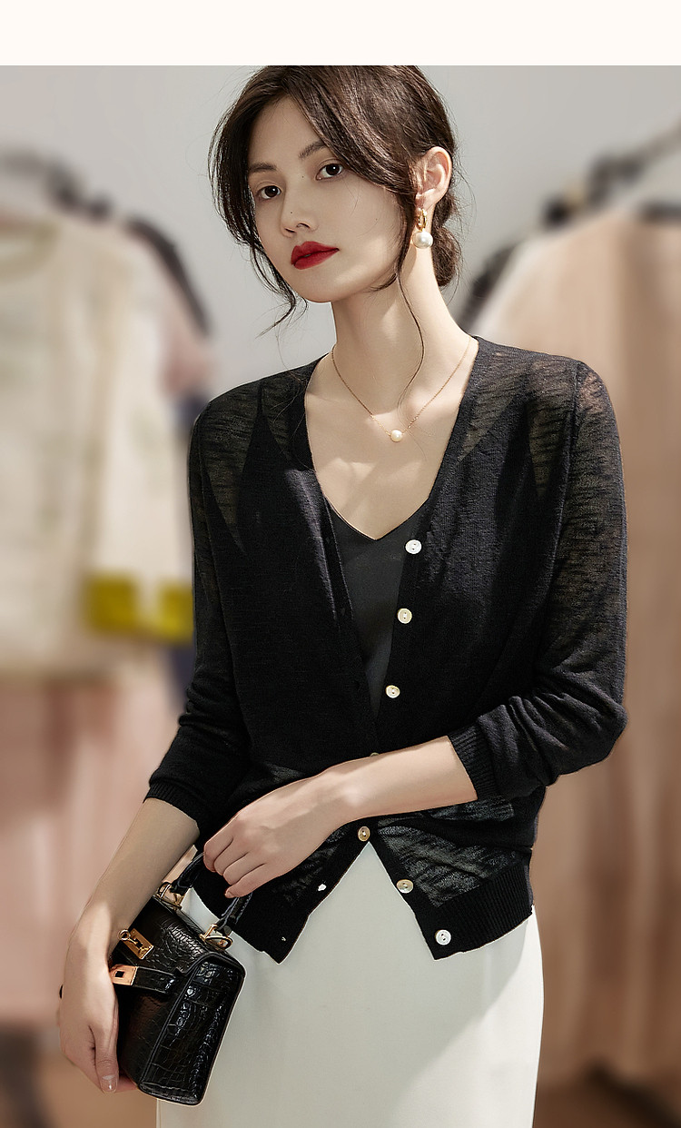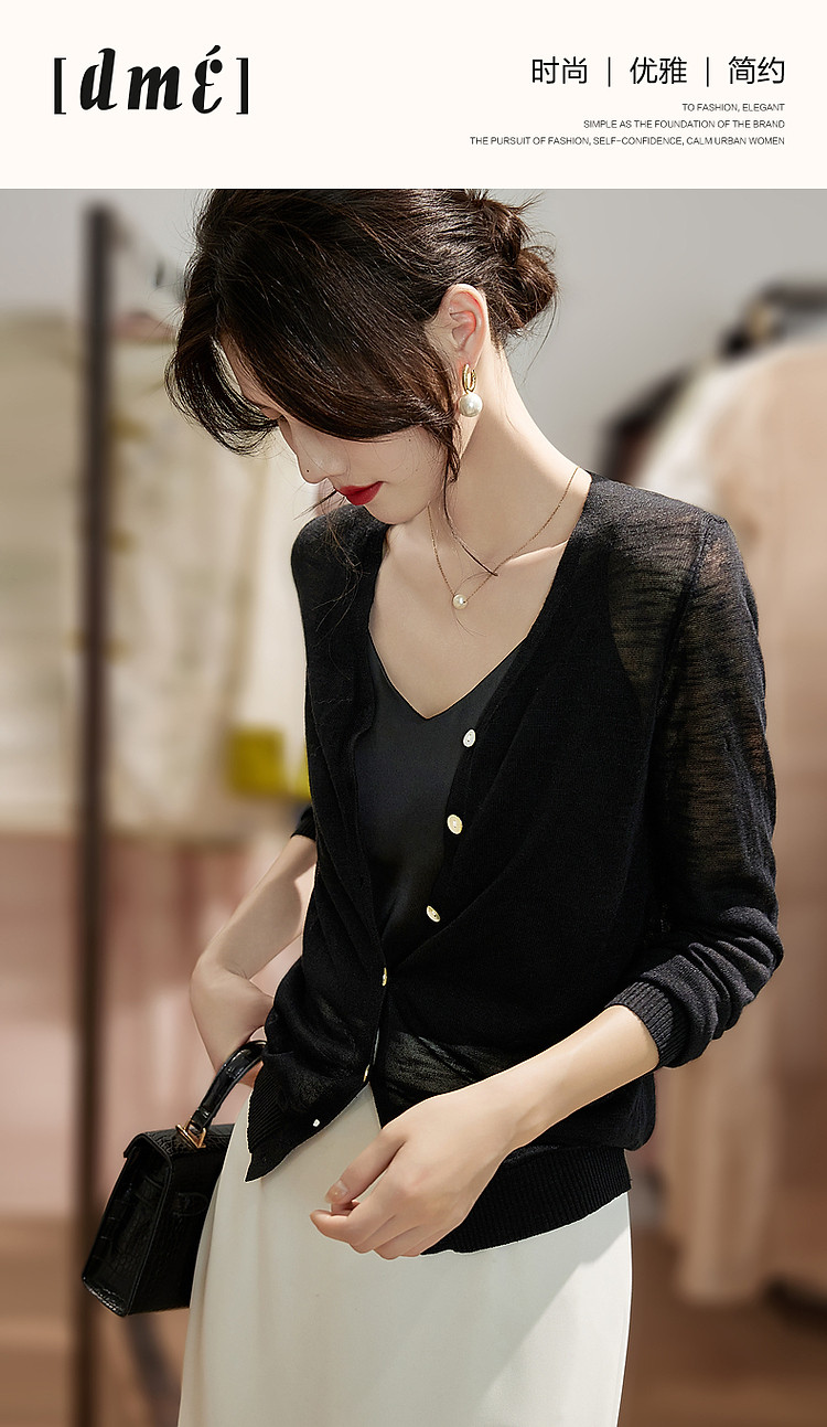 商品名称:【简约风开衫】夏轻熟V领空调衫云柔感薄线衫长袖针织衫女上衣 382785